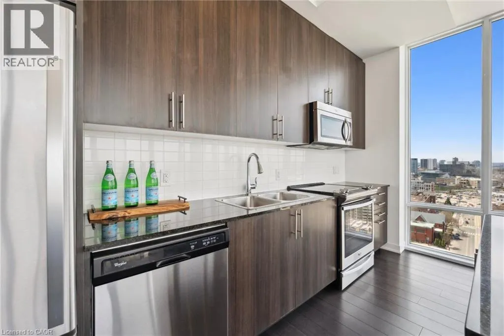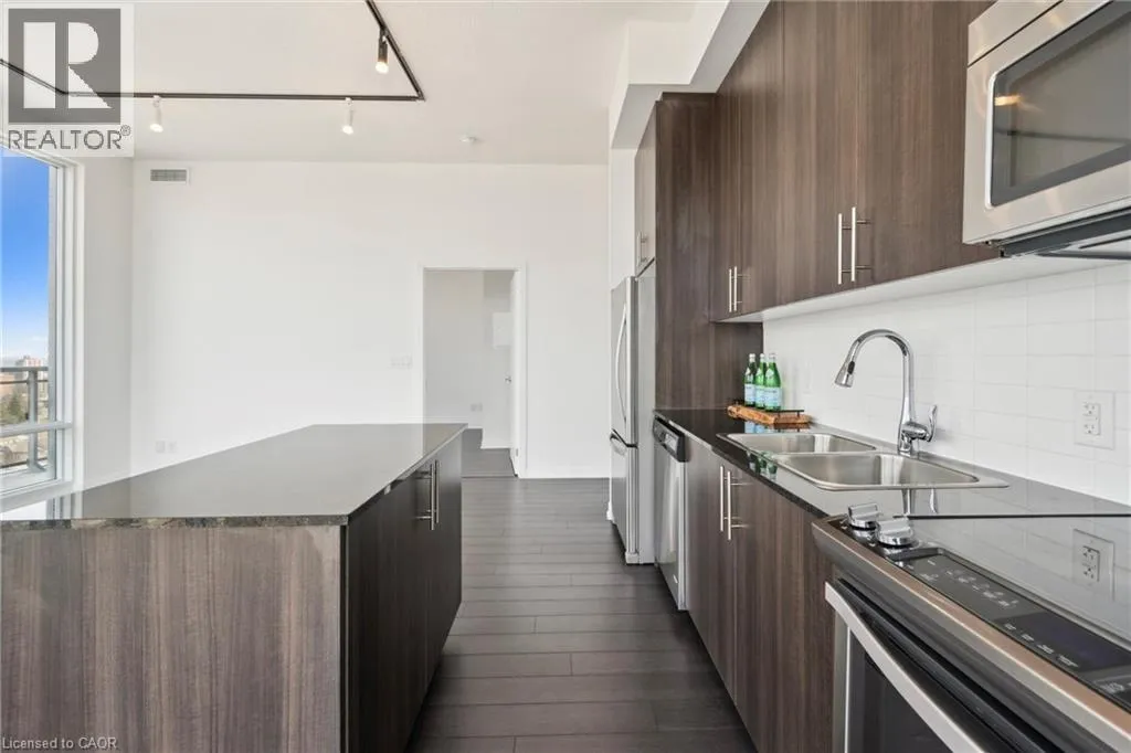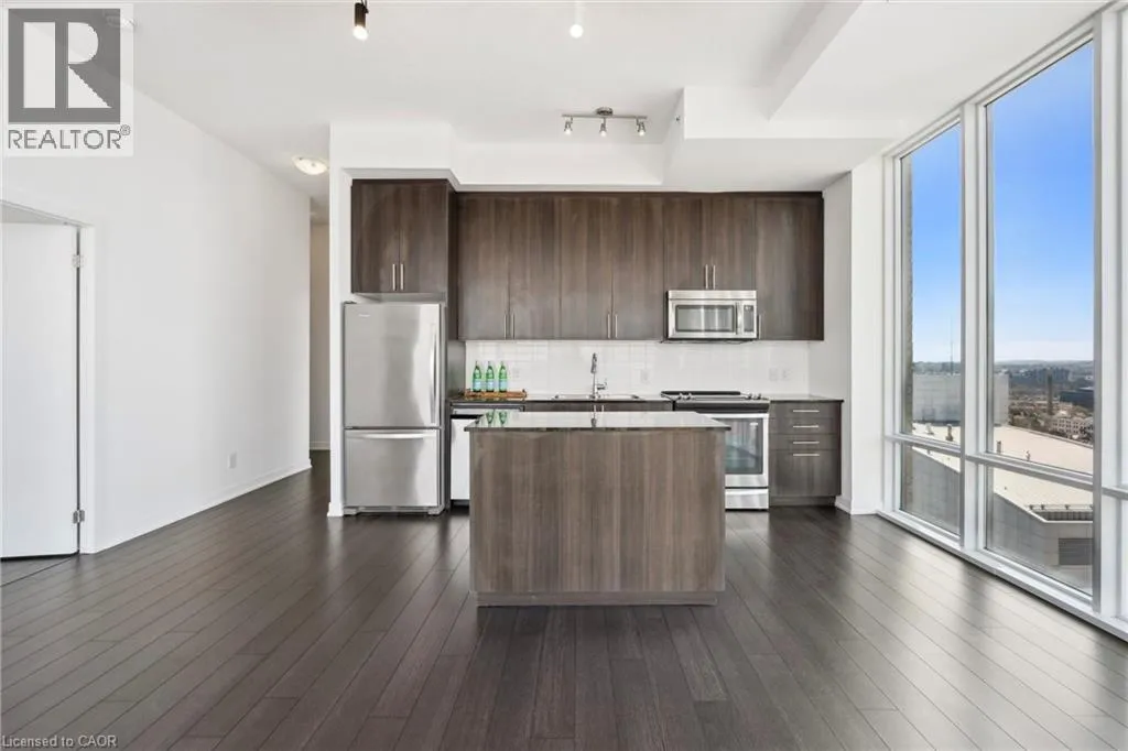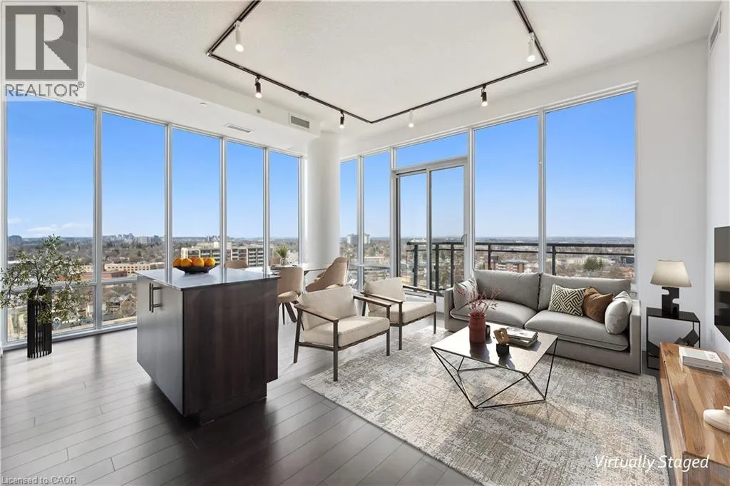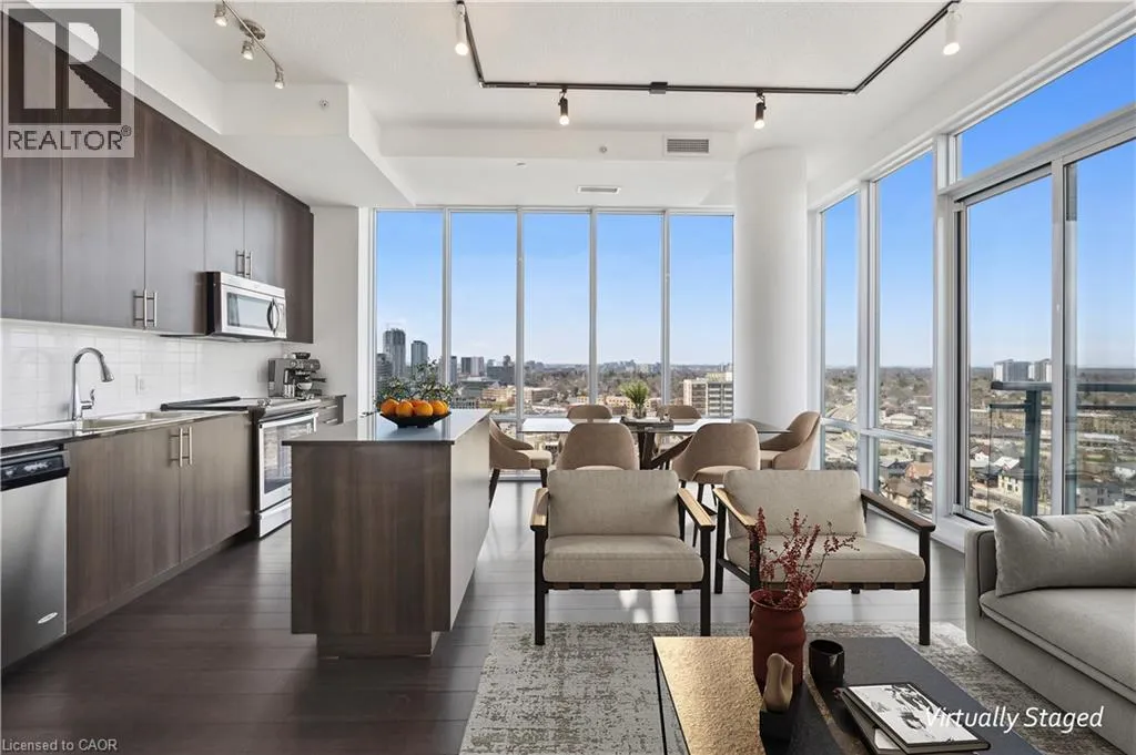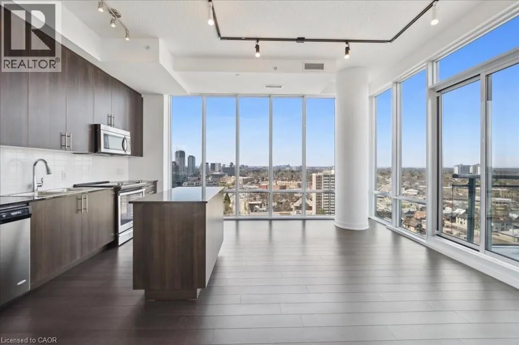 Corner of Duke and Young, right beside City Hall Experience unparalleled living in this unique corner PENTHOUSEâa rare gem with no upstairs neighbours! Bathed in NATURAL LIGHT, this bright 2-bedroom condo features 10-foot CEILINGS and floor-to-ceiling WINDOWS that frame breathtaking city VIEWS from your private 110 sq. ft. BALCONY. The sleek, MODERN KITCHEN is a chefâs delight, boasting full-height cabinetry, GRANITE COUNTERTOPS, upgraded stainless steel APPLIANCES, and a versatile MOVABLE ISLAND. Both bedrooms are generously sized, with the primary offering a private en-suite. Enjoy CARPET-FREE living, in-suite LAUNDRY, and ample STORAGE. This is the only penthouse of its kind available, perfectly positioned next to CITY HALL, with the ION LRT at your doorstep. Step out to vibrant King Streetâs SHOPS and RESTAURANTS, then retreat to your quiet oasis above it all. Residents enjoy a 7-day CONCIERGE, lounge, panoramic rooftop TERRACE, and a modern GYM. Underground PREMIUM PARKING and a storage LOCKER complete this exceptional offering. (id:27476)