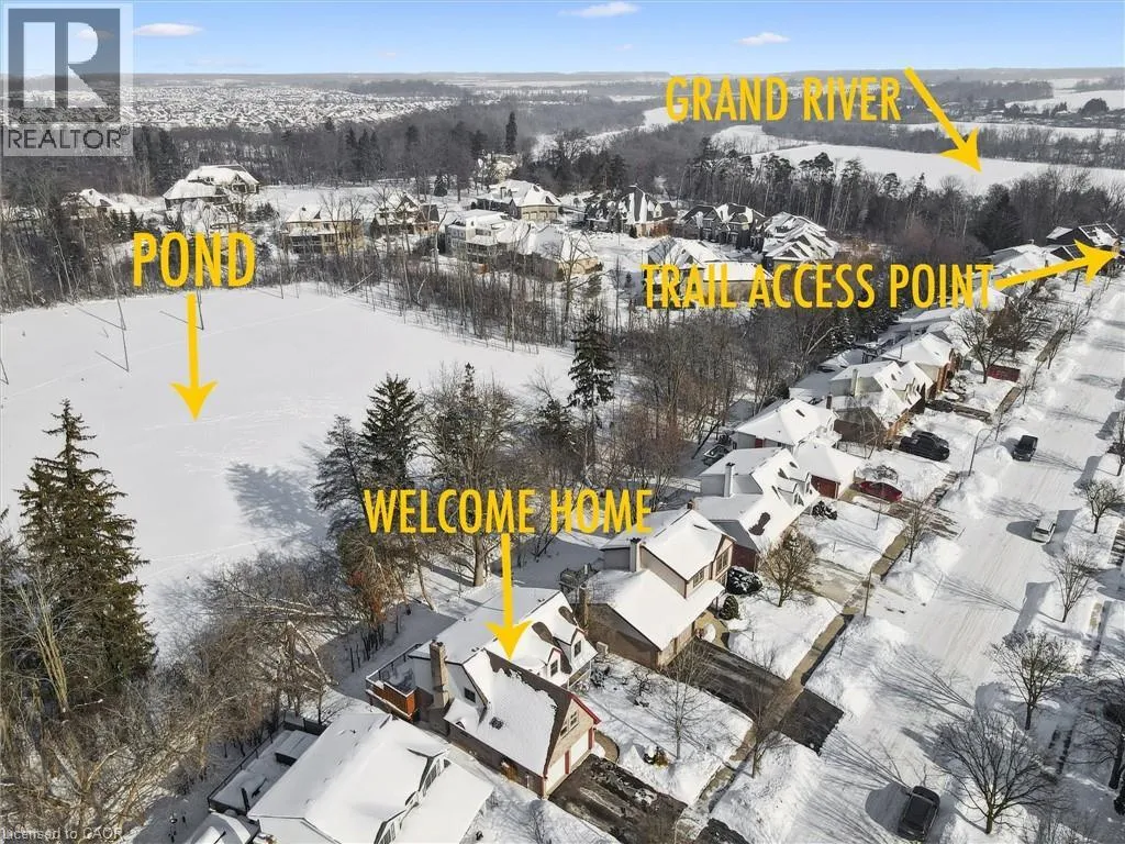 Tucked away on one of the most beloved streets in the sought-after Chicopee neighbourhood, this storybook home was previously featured as CTVâs Home of the Month and offers something rare: a deep sense of community paired with a peaceful, nature-backed setting. Here, neighbours know one another, kids play freely, and community ties runs deep. Backing onto mature trees and a tranquil pond, the property offers the feeling of a private cottage retreat in the city. Enjoy morning coffee overlooking the water, spot deer quietly passing by, skate on the pond in winter, and take in the peaceful surroundings year-round. Flooded with natural light, this Cape Cod beauty features bamboo hardwood flooring throughout, has been lovingly maintained and updated, and is move-in ready! The bright living and dining room are enhanced by crown moulding and wainscoting, while the open-concept kitchen is ideal for everyday living and entertaining, complete with granite countertops and a charming breakfast nook with serene views of nature. The double-car garage includes an Electric Vehicle (EV) charger for modern convenience. Upstairs offers four well-appointed bedrooms, including two primary-sized suites, each with its own ensuite bathroom, plus two additional bedrooms for family or guests, and a four-piece main bath. The fully finished basement is a movie or game night dream, featuring a large wet bar, a three-piece bathroom, bright windows, and a 5th bedroom perfect for a spectacular home office or hosting overnight guests. Notable updates include: all windows, patio door, double front doors, back siding replaced (2019), a beautiful cedar porch (2019) a 400sq ft 2-tiered deck (2019), water softener (2024) and refreshed exterior paint (2025). This home is ideally located minutes from Chicopee Ski Hill, schools, some of the Region's best trails, the Grand River, and year-round recreation. Morrison Park sits just across the street, making this a truly special place to call home. (id:27476)