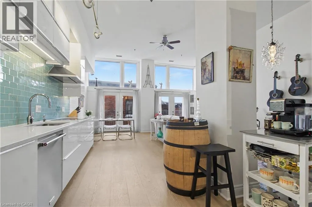 A truly unique condo that must be seen. This stunning two-bedroom, two full bathroom residence at The Lofts at 276 offers a rare blend of character, warmth, and modern design right in the heart of downtown Kitchener. From the moment you step inside, this space speaks to you. Soaring 12-foot ceilings, dramatic floor-to-ceiling windows, and double Juliette balconies flood the home with natural light, creating an airy, spacious atmosphere that feels both expansive and tranquil. The modern kitchen is a true focal point, featuring quartz countertops, high-end stainless steel appliances, sleek cabinetry, and clean lines that balance contemporary style with everyday functionality. Wide plank white oak flooring runs throughout the unit, adding warmth and texture while beautifully accentuating the scale and openness of the space. Thoughtfully designed for comfortable urban living, the unit includes two full bathrooms including a primary ensuite with a jacuzzi tub, ensuite laundry, and an impressive amount of storage both within the suite and in the included storage locker. Located close to restaurants, cafés, transit, and the tech core, this home puts you right in the middle of everything downtown Kitchener has to offer â while still offering a surprising sense of peace and presence. No photos can truly capture the feeling of this home â it must be seen in person to be fully appreciated. There is something timeless and unexpected that will stay with you and make you not want to leave without making it your own. (id:27476)
