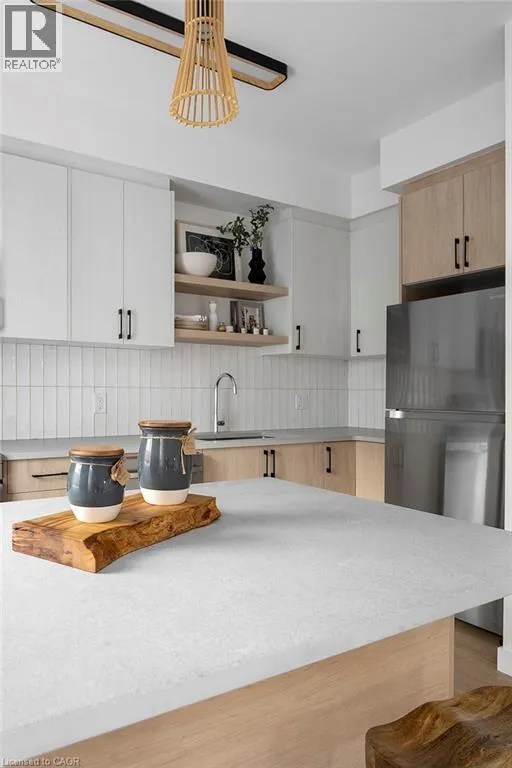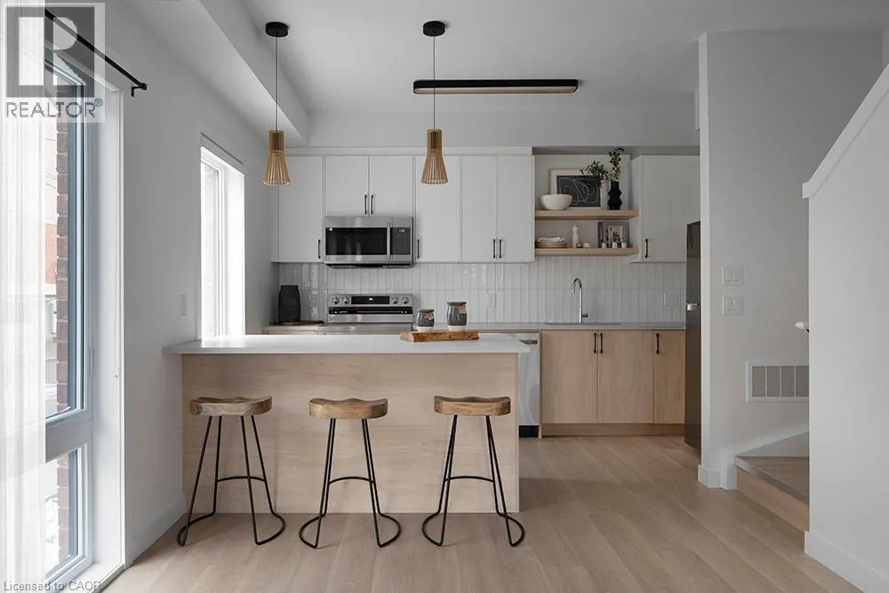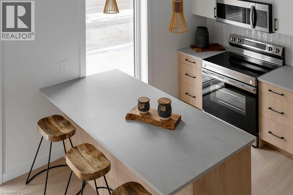 King St E to Weber St N Welcome to this beautifully designed 3-bedroom, 2.5-bath stacked townhouse offering modern style, thoughtful finishes, and comfortable living across multiple levels. The bright, open-concept main floor features a sleek kitchen with contemporary cabinetry, stainless steel appliances, a large island with breakfast seating, and stylish pendant lighting. The kitchen flows seamlessly into the living and dining area, creating a perfect space for both everyday living and entertaining. Clean lines, light wood tones, and black accents give the home a warm, modern feel. Upstairs, youâll find three well-proportioned bedrooms, including a spacious primary suite with ample closet space and a private ensuite bath. The additional bedrooms are ideal for family, guests, or a home office. A second full bathroom and convenient upper-level laundry add to the functional layout. Quality finishes continue throughout, including modern fixtures, large windows for plenty of natural light, and a neutral palette that suits any décor style. Enjoy outdoor space from private balconies, perfect for morning coffee or evening relaxation. Located in a vibrant, walkable neighbourhood close to shops, dining, transit, and everyday amenities, this stylish stacked townhouse offers low-maintenance living without sacrificing space or comfort. A perfect place to call home. (id:27476)