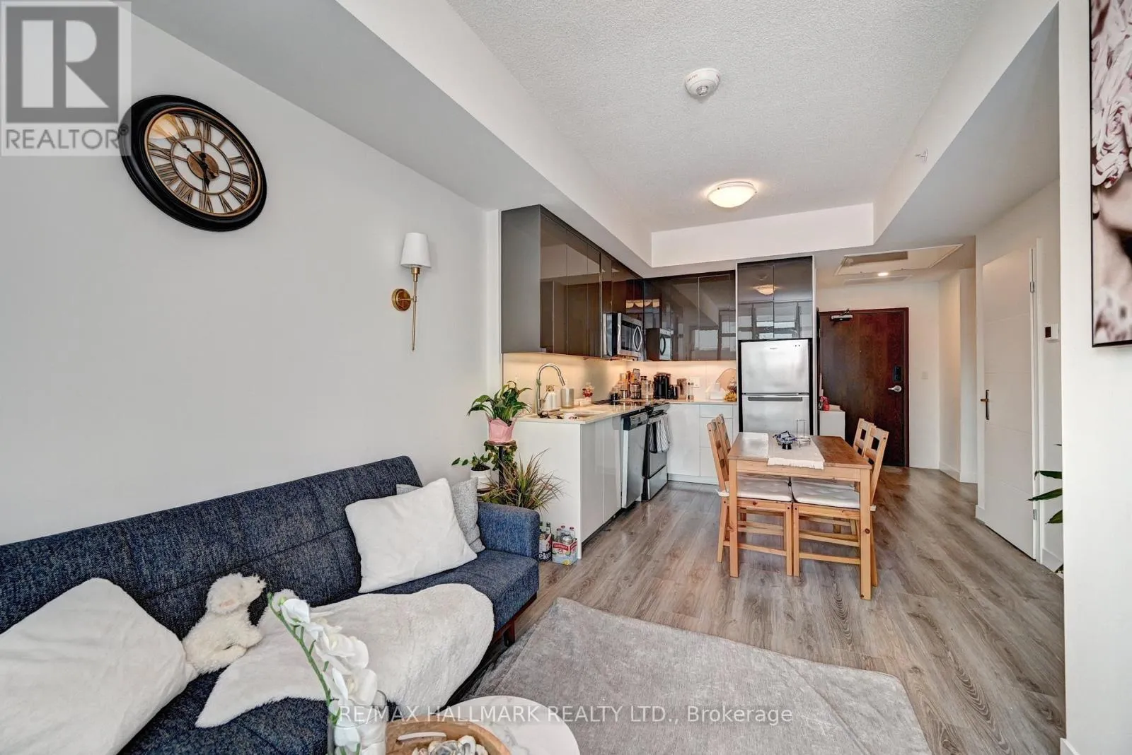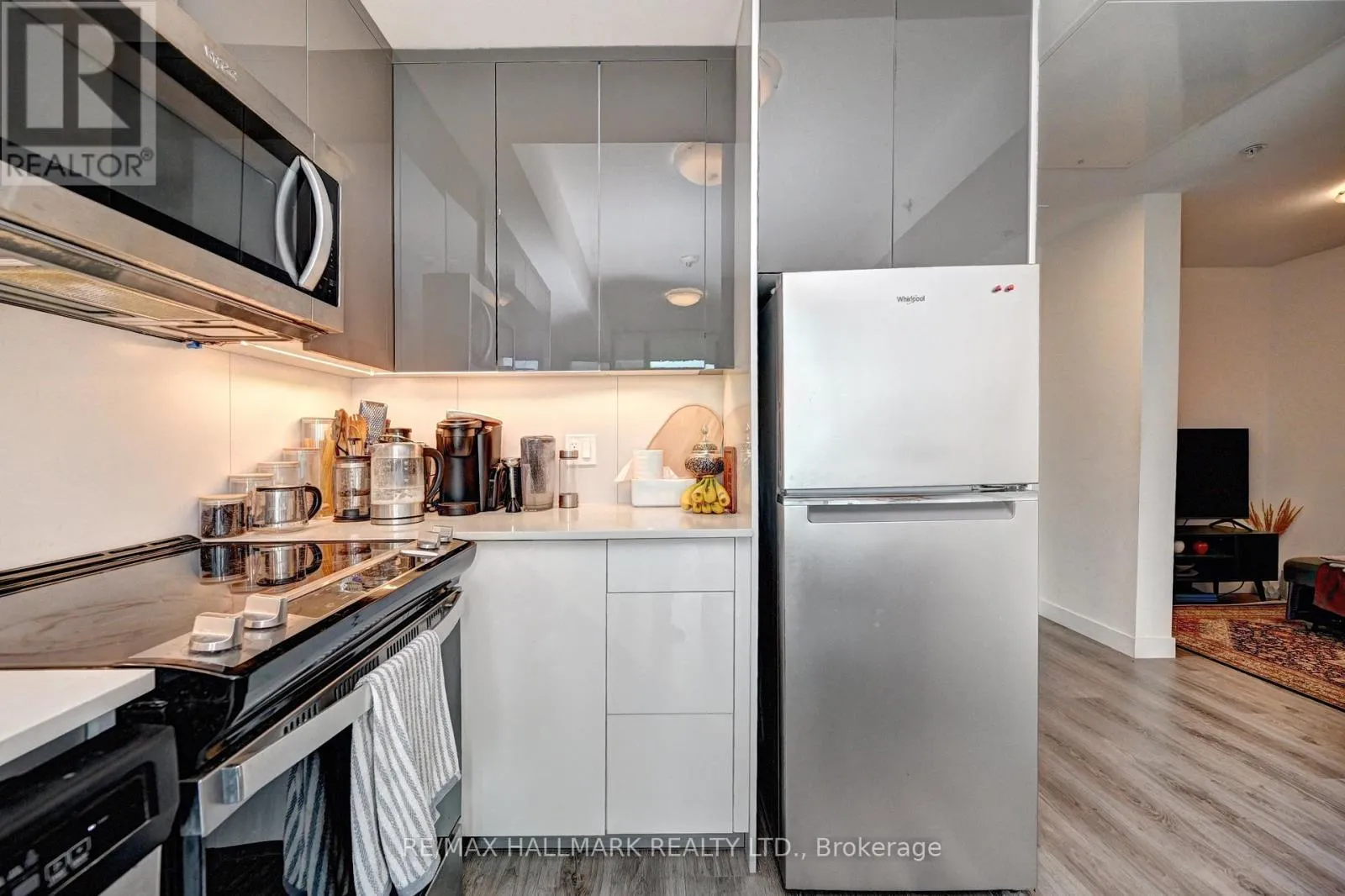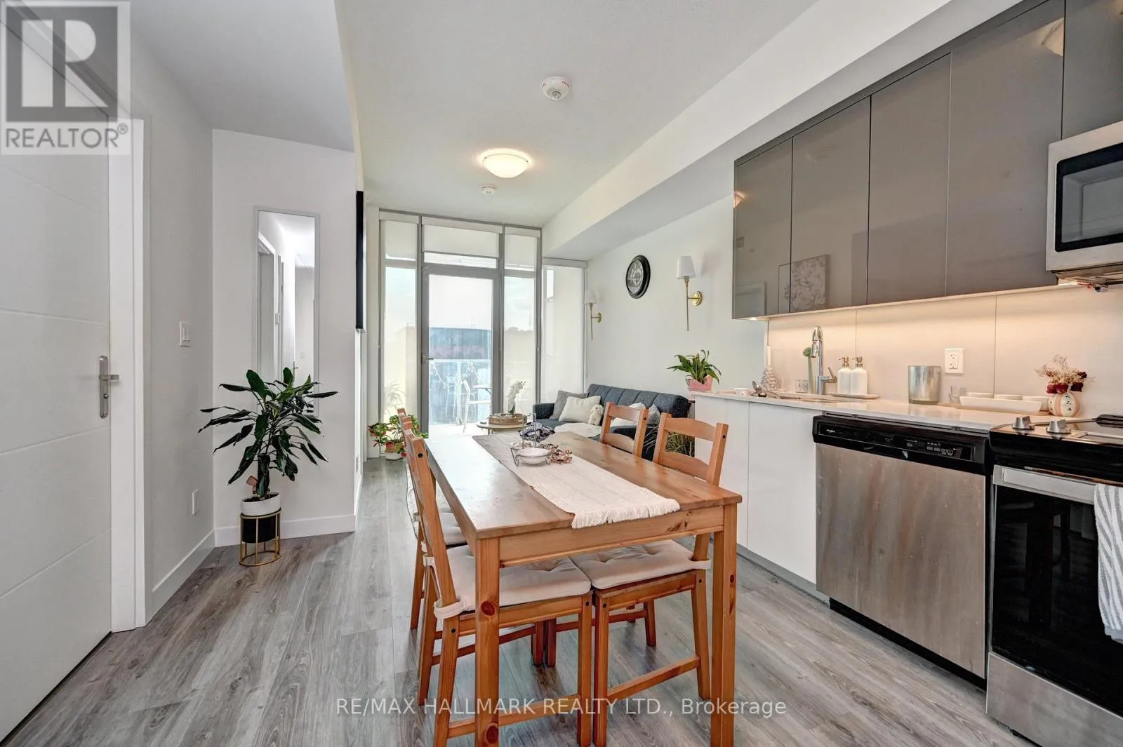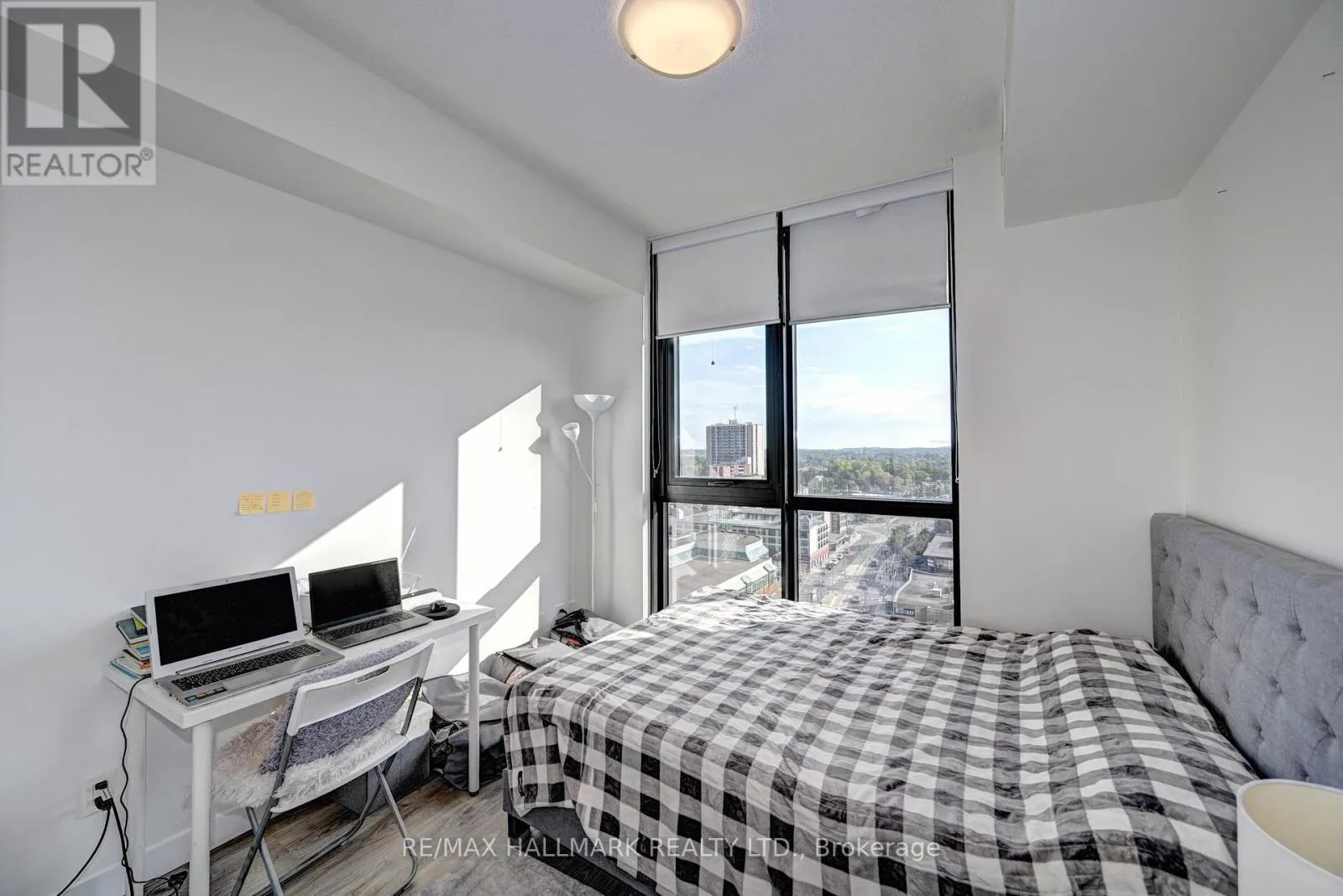 Frederick st & Duke St Modern 1-bedroom plus den, 2-bathroom suite at DTK Condos in the heart of Downtown Kitchener. This high-floor, open-concept unit features high ceilings, modern laminate flooring, and floor-to-ceiling windows offering unobstructed views. The kitchen is equipped with tall cabinetry, quartz countertops, a porcelain backsplash, and stainless steel appliances. A versatile den functions as a home office or second bedroom, complemented by two full bathrooms finished with porcelain tile. Integrated smart-home technology provides seamless control of unit features. Includes one underground parking space. Building amenities feature a 24-hour concierge, fitness centre, yoga studio, party room, and a rooftop terrace with barbecue areas. Situated with ION LRT and bus stops at the doorstep, providing rapid transit to the GO Station, University of Waterloo, Wilfrid Laurier University, and Conestoga College. Walking distance to the Kitchener Market, Victoria Park, and downtown dining. Tailored for professional couples or downsizers seeking a high-density urban core location. (id:27476)