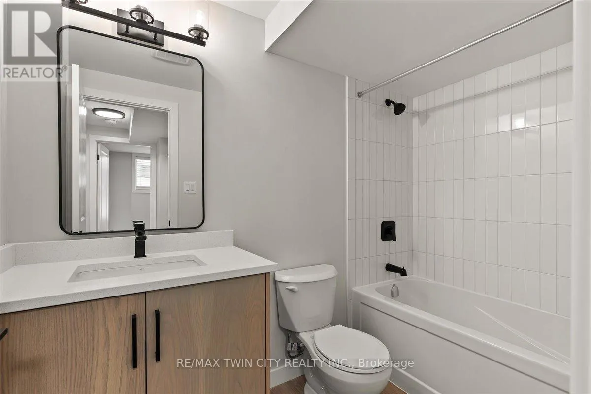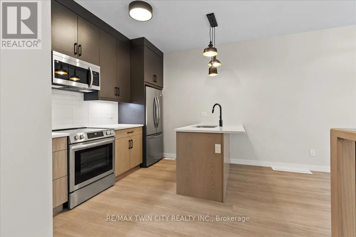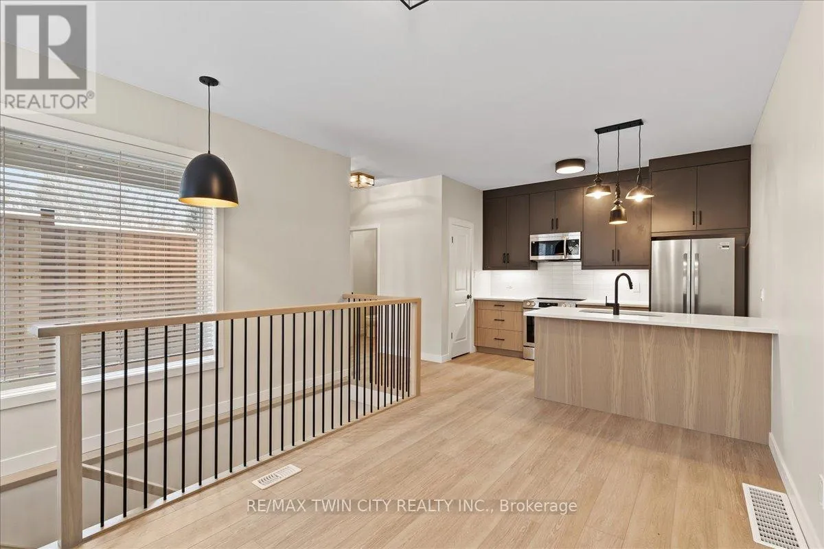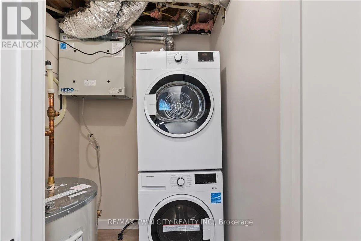 Cross Streets: Erinbrook Drive. ** Directions: Bleams to Thistledown, left onto Erinbrook. Driveway is on Erinbrook. Beautiful rental! This energy efficient and modern compact unit offers luxury finishes comparable to a custom home. At 860 square feet and offering 2 bedrooms, 1.5 bathrooms, this unit comes with large main floor windows, 9' ceilings and a wide open layout making for a bright space. The living room, kitchen, and powder room all occupy the main floor. The two-tone kitchen is a combination of a white oak finish with satin grey floor to ceiling cabinets and soft close mechanisms along with quartz countertops throughout the kitchen and bathrooms. Brand new stainless steel kitchen appliances and stackable laundry washer and dryer. The black hardware contrasts the white trim and matches the black plumbing fixtures throughout. LVP flooring in the entire unit matches the oak staircase and iron spindles leading to the basement. Two bedrooms; one with built in drawers, a laundry, and a four-piece bathroom make up the lower level. Conveniently Country Hill location! (id:27476)
