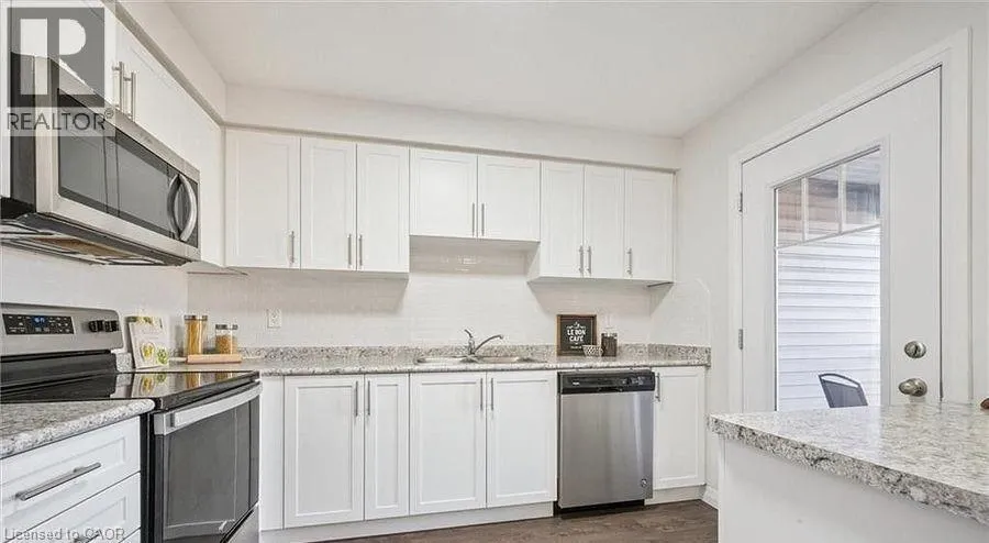 King Street East/Morrison Road Opportunity is knocking! Letâs get you into the market. You could be the owner of a turn key, ready to live in beautiful townhome. Step into this beautifully refreshed multilevel townhome, featuring exceptional versatility and modern comfort. This home features two bedrooms, two bathrooms, and a rare bonus of two parking spaces. The main floor room provides valuable flexibility and can serve as a third bedroom, home office, gym or an additional tv room, making it easy to tailor the space to your family's needs. The home has been freshly painted, new kitchen backsplash, new lighting throughout, with laminate flooring throughout for a clean, cohesive look. The bright, open kitchen opens to a terrace balcony. It also has a convenient upstairs laundry and two generously sized bedrooms. Centrally located in Kitchener, this property has quick access to Highway 8, the 401, Fairview Park Mall, Conestoga College, and everyday amenities. Move in ready and exceptionally functional, this is the perfect home for first time buyers, young families, or anyone seeking adaptable living in a prime location. (id:27476)