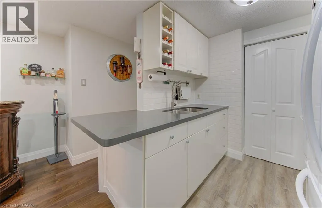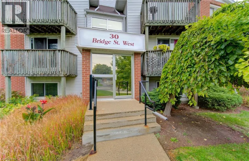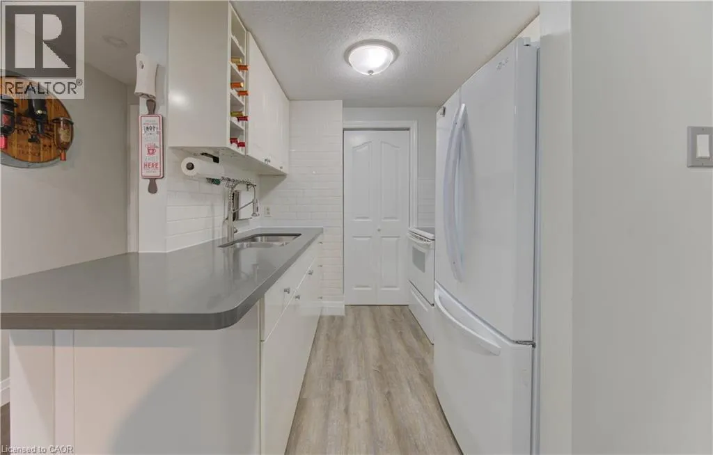 Bridge street West Welcome to this beautifully updated 810 square foot 2 Bedroom home, offering a bright and airy living space that blends comfort and modern style. Every detail has been meticulously refreshed - from the pristine ceramic tile flooring to the new contemporary pot lights that creat a warm inviting atmosphere. The living area features a built-in electric fireplace adding a touch of elegance and coziness. The kitchen shines with brand-new quartz-style countertops, a subway tile backsplash, and new appliances including a fridge and microwave (2025). You'll also enjoy the convenience of IN SUITE LAUNDRY and one dedicated parking space. Perfectly located with quick access to the Conestogo Expressway and public transit newarby, this home is ideal for empty nesters, first time or second-time buyers and savvy investors alike. Enjoy being close to schools, shopping, restaurants, and the scenic Grand River Trail System - everything you need is right at your doorstep! Move-in ready, modern and full of charm - this one checks all of the boxes! (id:27476)