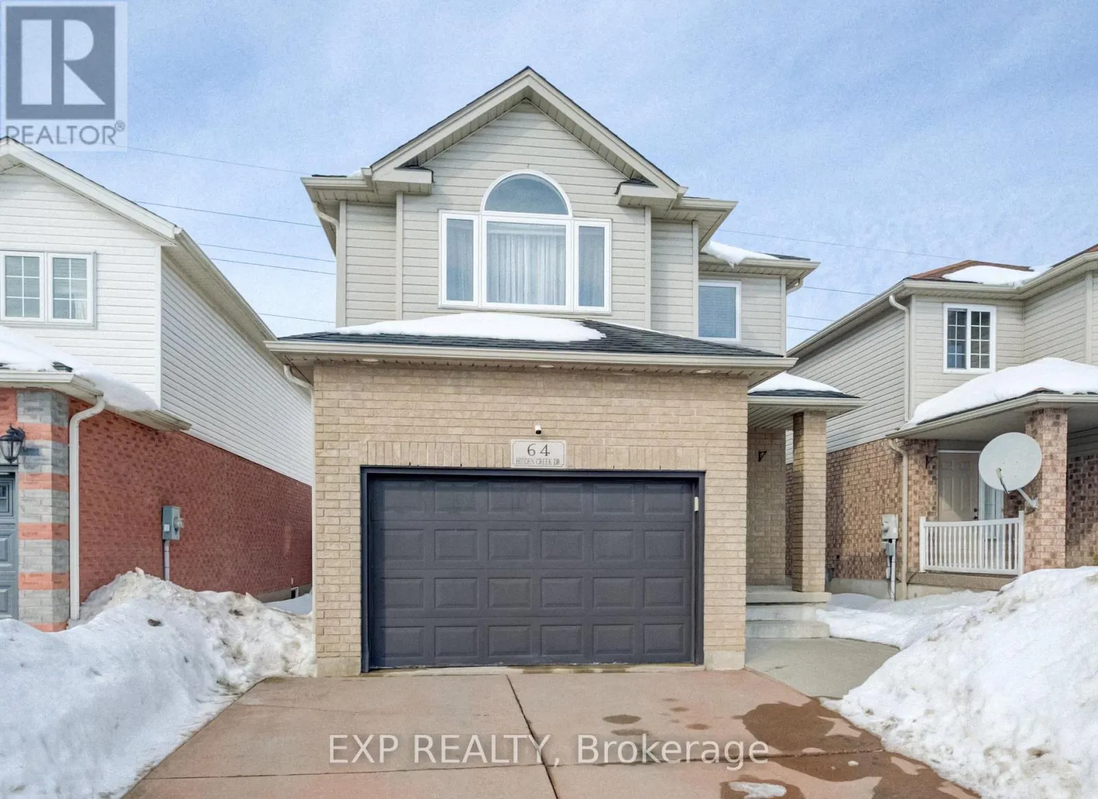 Cross Streets: Hollyridge Cres. ** Directions: Westforest Trail. Welcome to 64 Hidden Creek Drive, Kitchener, a beautifully upgraded two-storey brick home located in one of the city's most highly sought-after neighbourhoods. Perfectly situated close to top-rated schools, scenic walking trails, parks, public transit, and shopping and dining at The Boardwalk, this prime location offers the ideal blend of convenience and community. This stunning 3 bedroom, 3 bathroom home features a double car garage and a private double-wide driveway, providing ample parking for family and guests. Inside, you'll find a bright open concept main floor designed for modern living and entertaining. The dining area seamlessly flows into the kitchen and living room, all enhanced by engineered hardwood flooring and an abundance of natural light from large windows. The contemporary kitchen is a true showpiece, complete with stainless steel appliances, quartz countertops, a centre island, stylish backsplash, and modern hardware. Pot lights throughout the kitchen and living room add warmth and sophistication. Sliding glass doors off the living room lead to a fully fenced backyard, perfect for relaxing, entertaining, or enjoying summer evenings. A convenient 2 piece bathroom completes the main level. Upstairs, plush carpeting adds comfort to three spacious bedrooms, each with large windows. The primary bedroom features a walk-in closet, offering both functionality and style. The finished basement extends your living space with a generous recreation room, dedicated office area, and a 3 piece bathroom, ideal for working from home, hosting guests, or creating a private retreat. With modern upgrades throughout, exceptional living space, and an unbeatable location, this home is move in ready. (id:27476)