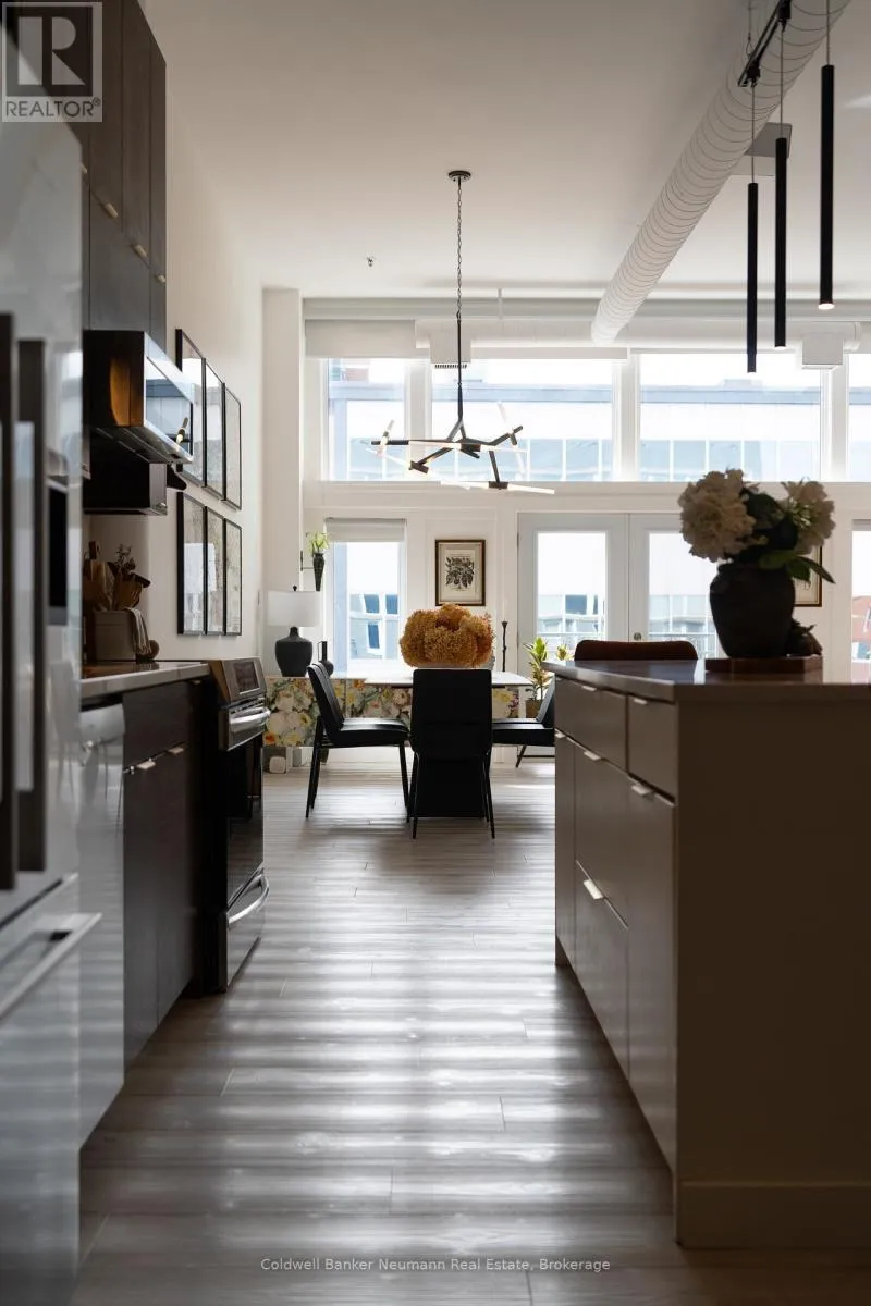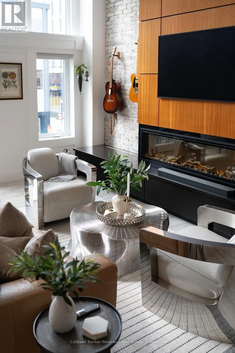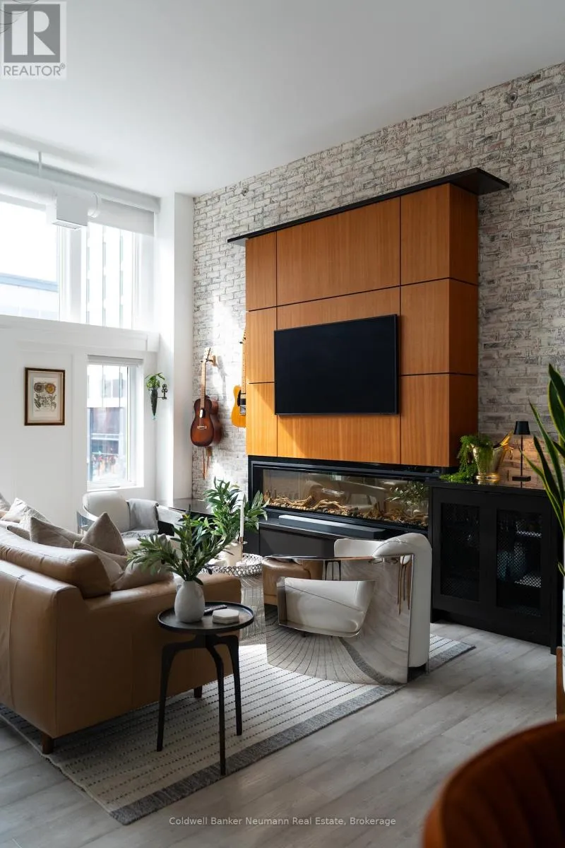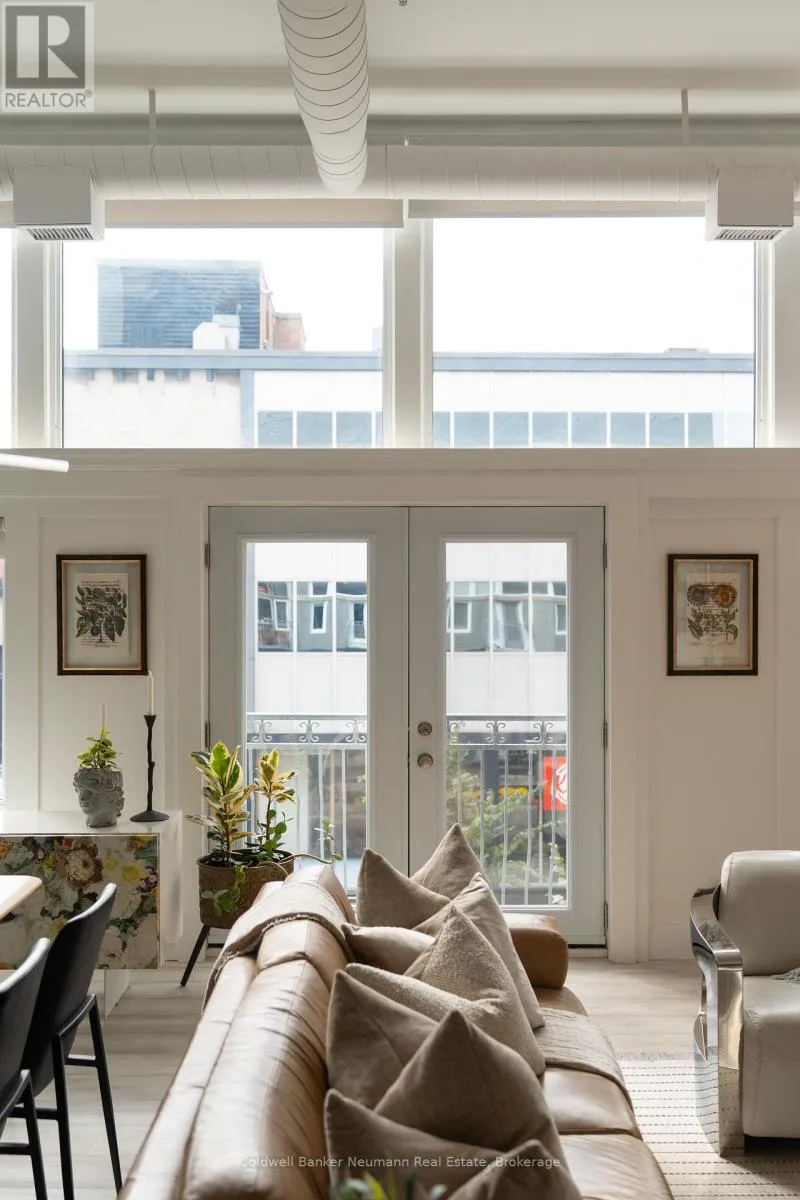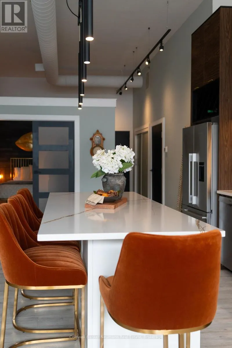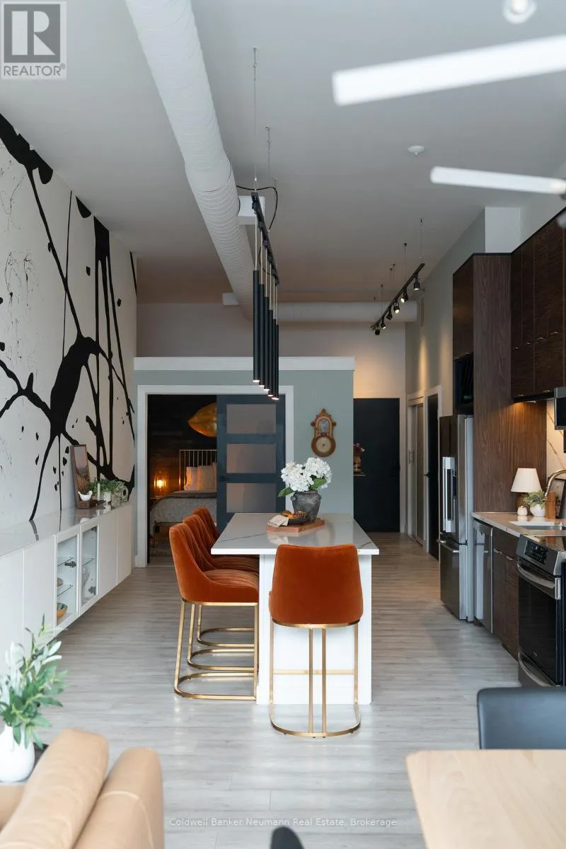 Cross Streets: King St W and Water St N. ** Directions: Victoria St N, Left on Water St N, Left onto King St W. One-of-a-Kind Loft in the Heart of Downtown Kitchener. Welcome to Unit 205 at The Lofts at 276, a stunning, modern, 1-bedroom, 2-bathroom suite that seamlessly blends industrial charm with luxurious finishes. This exceptional, one-of-a-kind space, offers soaring 12-foot ceilings, floor-to-ceiling windows, and garden doors that flood the open-concept living and dining area with natural light. Every detail has been thoughtfully curated, from the wide plank vinyl flooring to the custom design elements throughout. The gourmet kitchen is a chefs dream, featuring rich dark wood cabinetry, veined quartz countertops and backsplash, an oversized island with breakfast bar, custom wine rack, statement lighting and an eye-catching feature wall with built-in buffet. The expansive living area is perfect for both entertaining and relaxing, anchored by a custom fireplace surround with integrated dry bar, wine fridge, and complemented by a warm brick accent wall that adds character and texture. Elegant garden doors open to a Juliette balcony, adding a touch of European charm. The dining space comfortably accommodates family gatherings, offering the perfect setting for special occasions.The main bathroom offers a stylish vanity with a stone vessel sink and a tub with textured tile surround. Additional features include in-suite laundry, underground parking, and an oversized storage locker located just steps from your vehicle. Retreat to the primary suite through double doors to find a wood accent wall, sliding closet barn doors, a custom closet organizer, and a private ensuite. The spa-inspired bathroom includes a walk-in shower with striking black-framed glass doors, wood-look tile, and a generous niche with accent details. Set in a beautifully converted loft building with modern lobby, this home places you in the heart of vibrant Downtown Kitchener just steps from cafés, restaurants, transit, schools, entertainment, and Victoria Park. Urban luxury and everyday convenience await. (id:27476)
