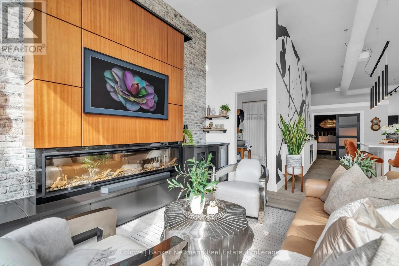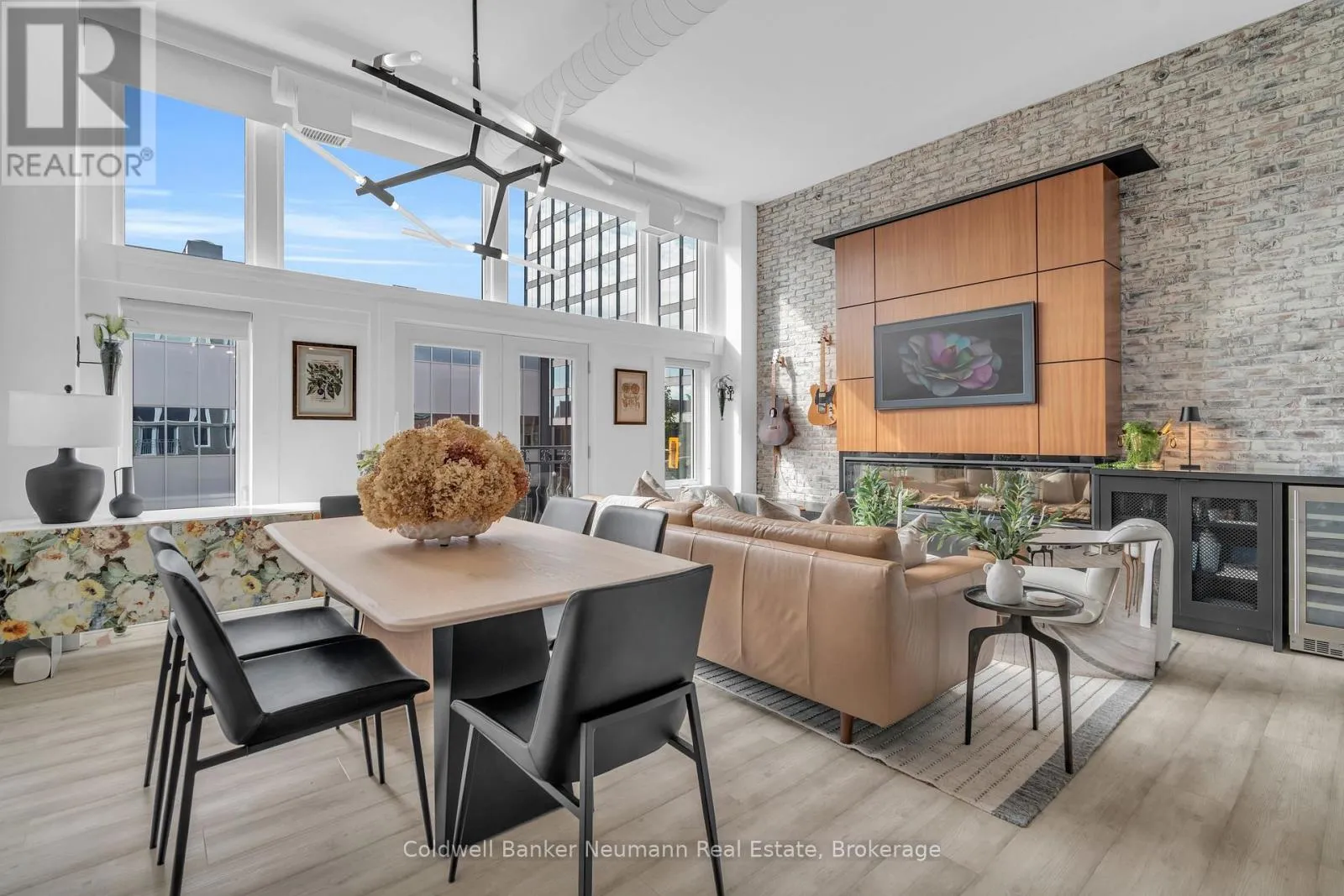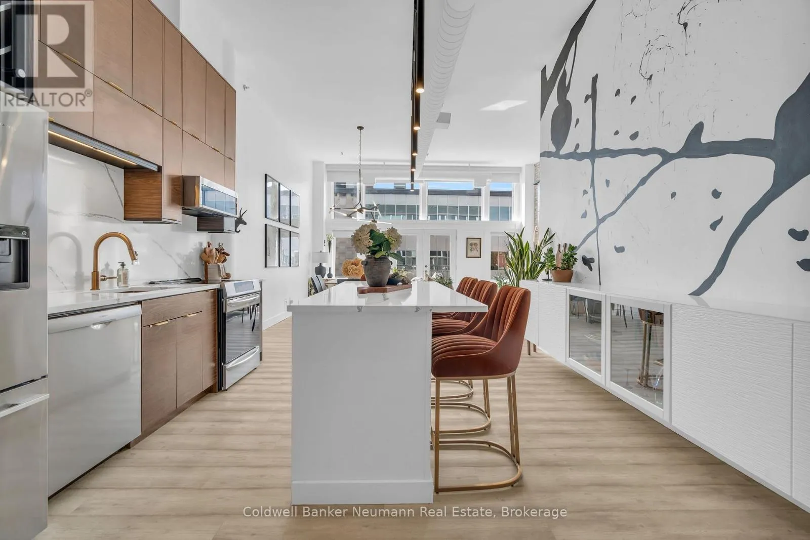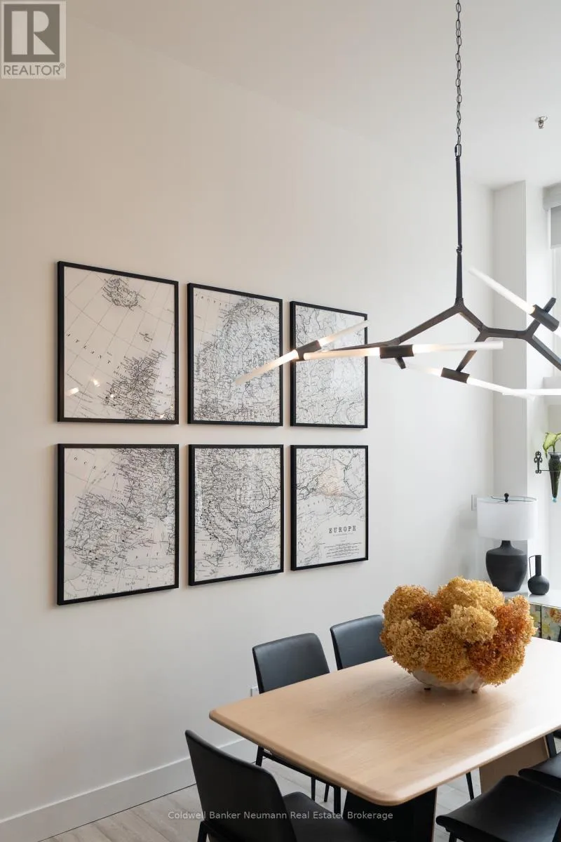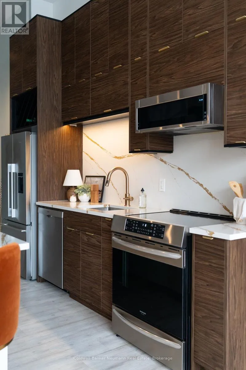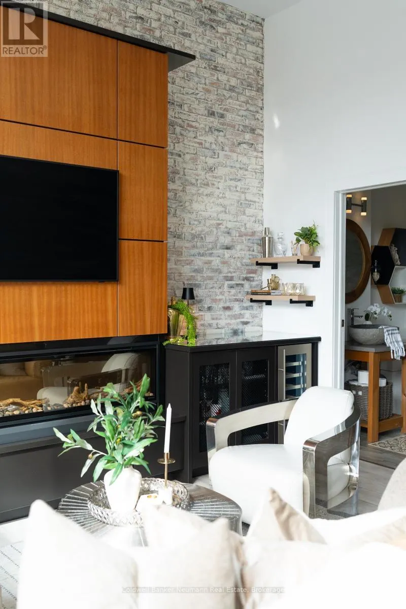 Cross Streets: King St W and Water St N. ** Directions: Victoria St N, Left on Water St N, Left onto King St W. One-of-a-Kind Loft in the Heart of Downtown Kitchener. Welcome to Unit 205 at The Lofts at 276, a stunning, modern, 1-bedroom, 2-bathroom suite that seamlessly blends industrial charm with luxurious finishes. This exceptional, one-of-a-kind space, offers soaring 12-foot ceilings, floor-to-ceiling windows, and garden doors that flood the open-concept living and dining area with natural light. Every detail has been thoughtfully curated, from the wide plank vinyl flooring to the custom design elements throughout. The gourmet kitchen is a chefs dream, featuring rich dark wood cabinetry, veined quartz countertops and backsplash, an oversized island with breakfast bar, custom wine rack, statement lighting and an eye-catching feature wall with built-in buffet. The expansive living area is perfect for both entertaining and relaxing, anchored by a custom fireplace surround with integrated dry bar, wine fridge, and complemented by a warm brick accent wall that adds character and texture. Elegant garden doors open to a Juliette balcony, adding a touch of European charm. The dining space comfortably accommodates family gatherings, offering the perfect setting for special occasions.The main bathroom offers a stylish vanity with a stone vessel sink and a tub with textured tile surround. Additional features include in-suite laundry, underground parking, and an oversized storage locker located just steps from your vehicle. Retreat to the primary suite through double doors to find a wood accent wall, sliding closet barn doors, a custom closet organizer, and a private ensuite. The spa-inspired bathroom includes a walk-in shower with striking black-framed glass doors, wood-look tile, and a generous niche with accent details. Set in a beautifully converted loft building with modern lobby, this home places you in the heart of vibrant Downtown Kitchener just steps from cafés, restaurants, transit, schools, entertainment, and Victoria Park. Urban luxury and everyday convenience await. (id:27476)