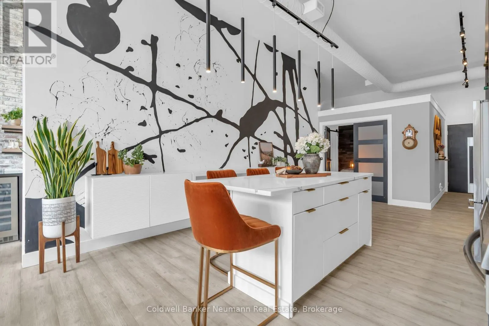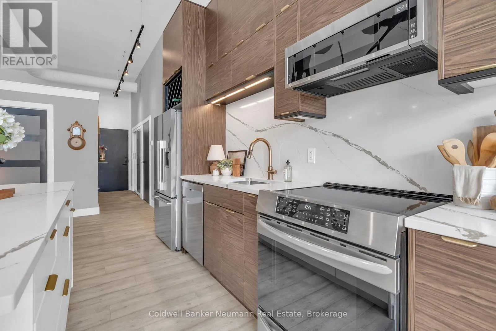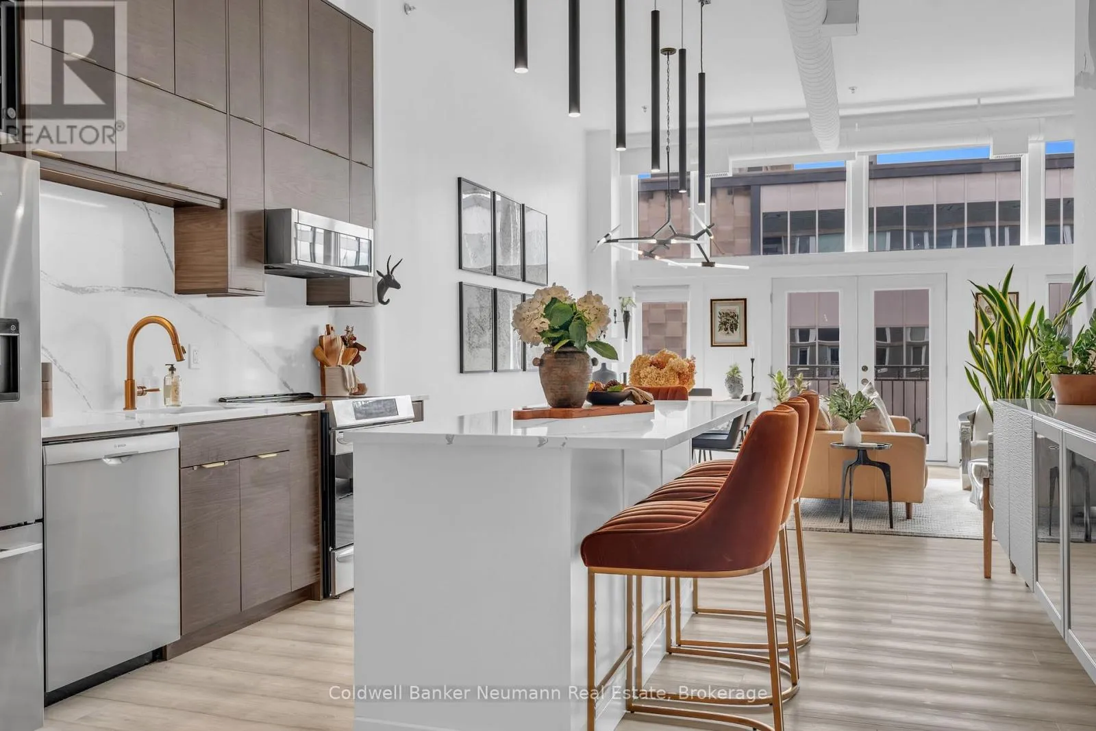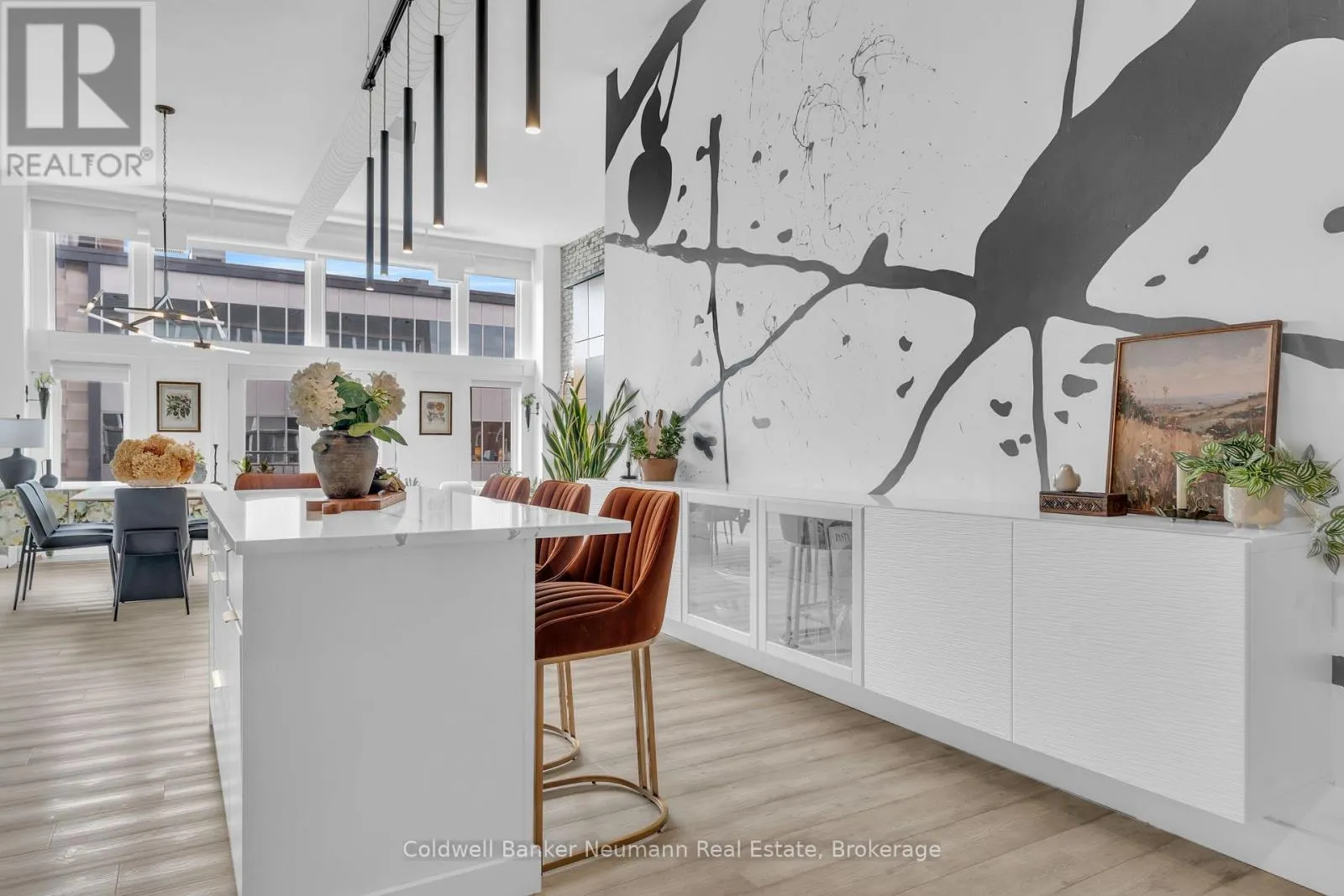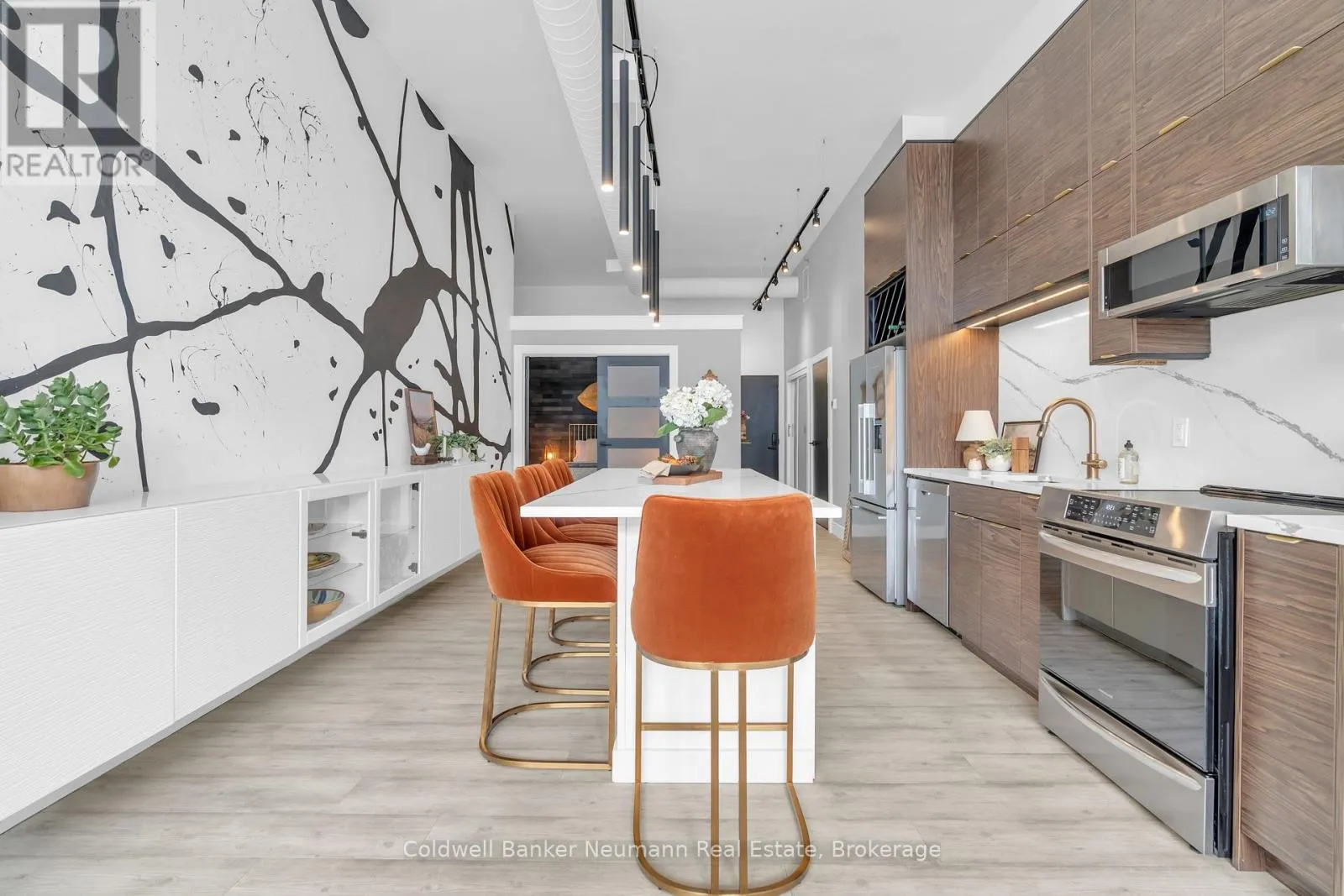 Cross Streets: King St W and Water St N. ** Directions: Victoria St N, Left on Water St N, Left onto King St W. One-of-a-Kind Loft in the Heart of Downtown Kitchener. Welcome to Unit 205 at The Lofts at 276, a stunning, modern, 1-bedroom, 2-bathroom suite that seamlessly blends industrial charm with luxurious finishes. This exceptional, one-of-a-kind space, offers soaring 12-foot ceilings, floor-to-ceiling windows, and garden doors that flood the open-concept living and dining area with natural light. Every detail has been thoughtfully curated, from the wide plank vinyl flooring to the custom design elements throughout. The gourmet kitchen is a chefs dream, featuring rich dark wood cabinetry, veined quartz countertops and backsplash, an oversized island with breakfast bar, custom wine rack, statement lighting and an eye-catching feature wall with built-in buffet. The expansive living area is perfect for both entertaining and relaxing, anchored by a custom fireplace surround with integrated dry bar, wine fridge, and complemented by a warm brick accent wall that adds character and texture. Elegant garden doors open to a Juliette balcony, adding a touch of European charm. The dining space comfortably accommodates family gatherings, offering the perfect setting for special occasions.The main bathroom offers a stylish vanity with a stone vessel sink and a tub with textured tile surround. Additional features include in-suite laundry, underground parking, and an oversized storage locker located just steps from your vehicle. Retreat to the primary suite through double doors to find a wood accent wall, sliding closet barn doors, a custom closet organizer, and a private ensuite. The spa-inspired bathroom includes a walk-in shower with striking black-framed glass doors, wood-look tile, and a generous niche with accent details. Set in a beautifully converted loft building with modern lobby, this home places you in the heart of vibrant Downtown Kitchener just steps from cafés, restaurants, transit, schools, entertainment, and Victoria Park. Urban luxury and everyday convenience await. (id:27476)