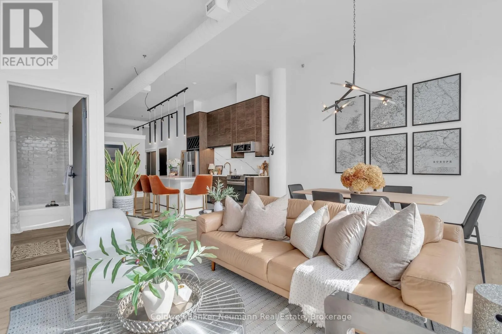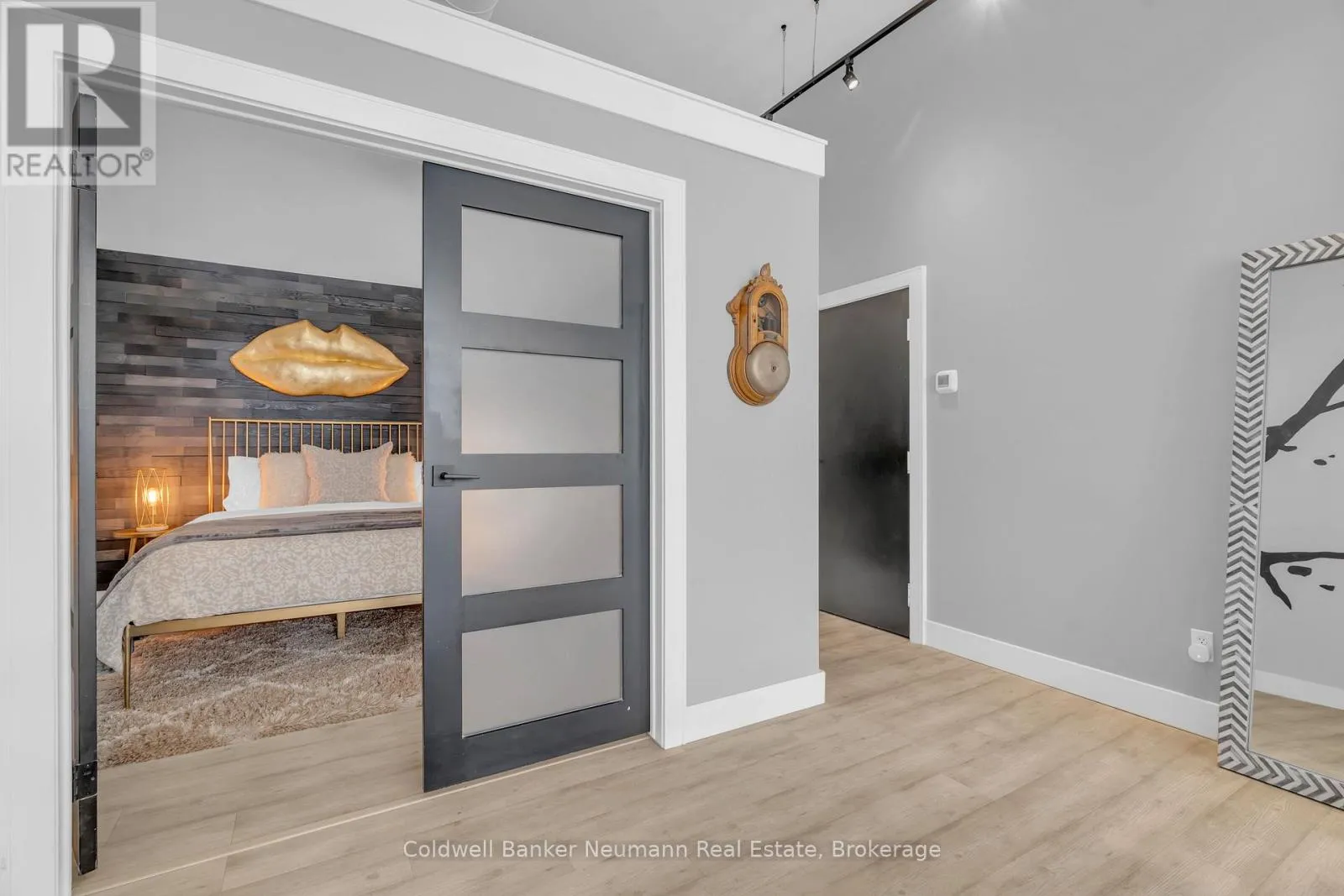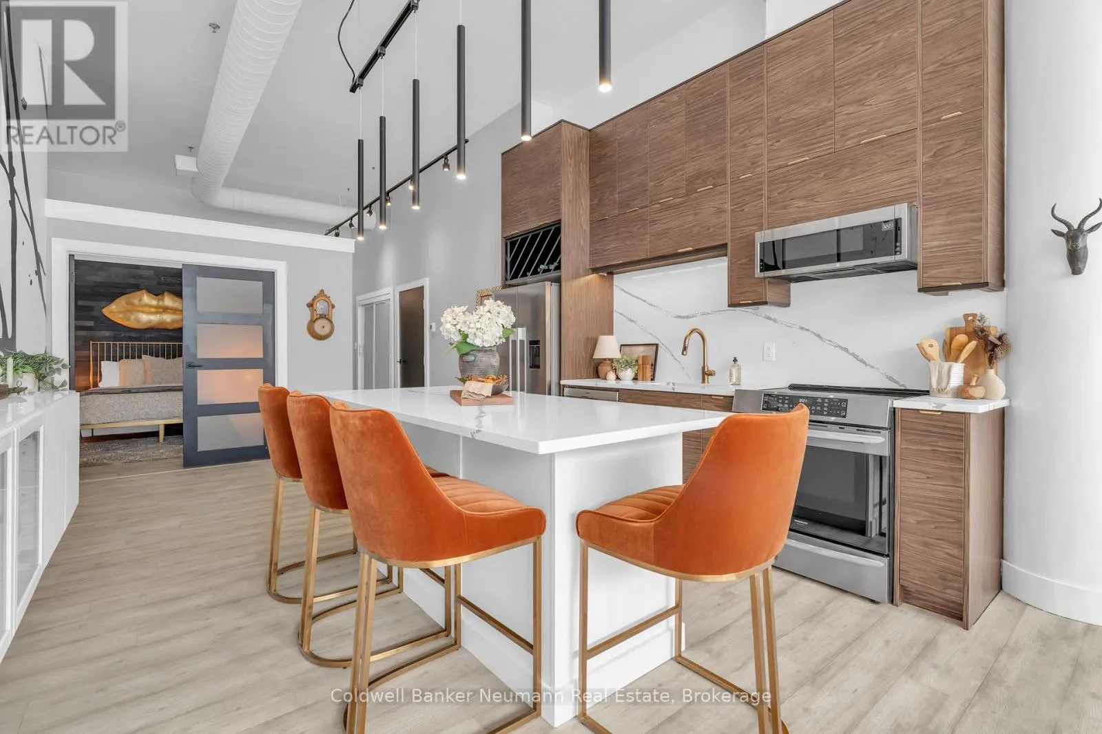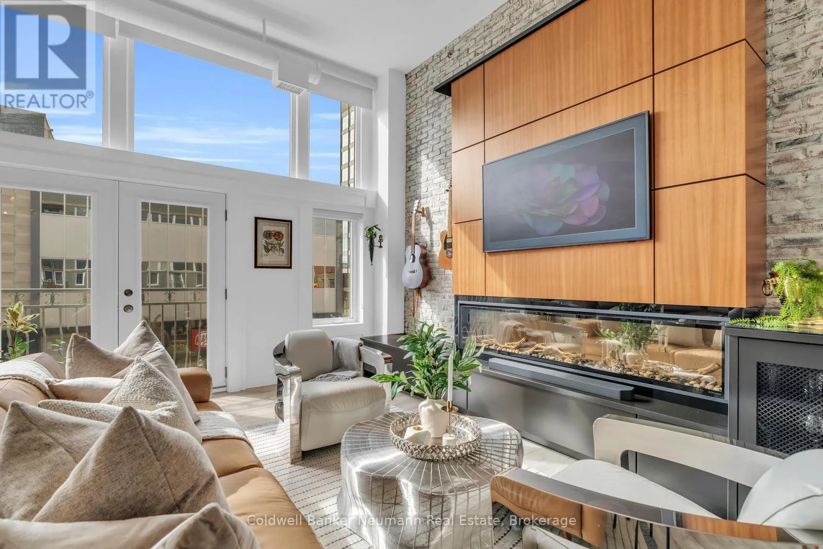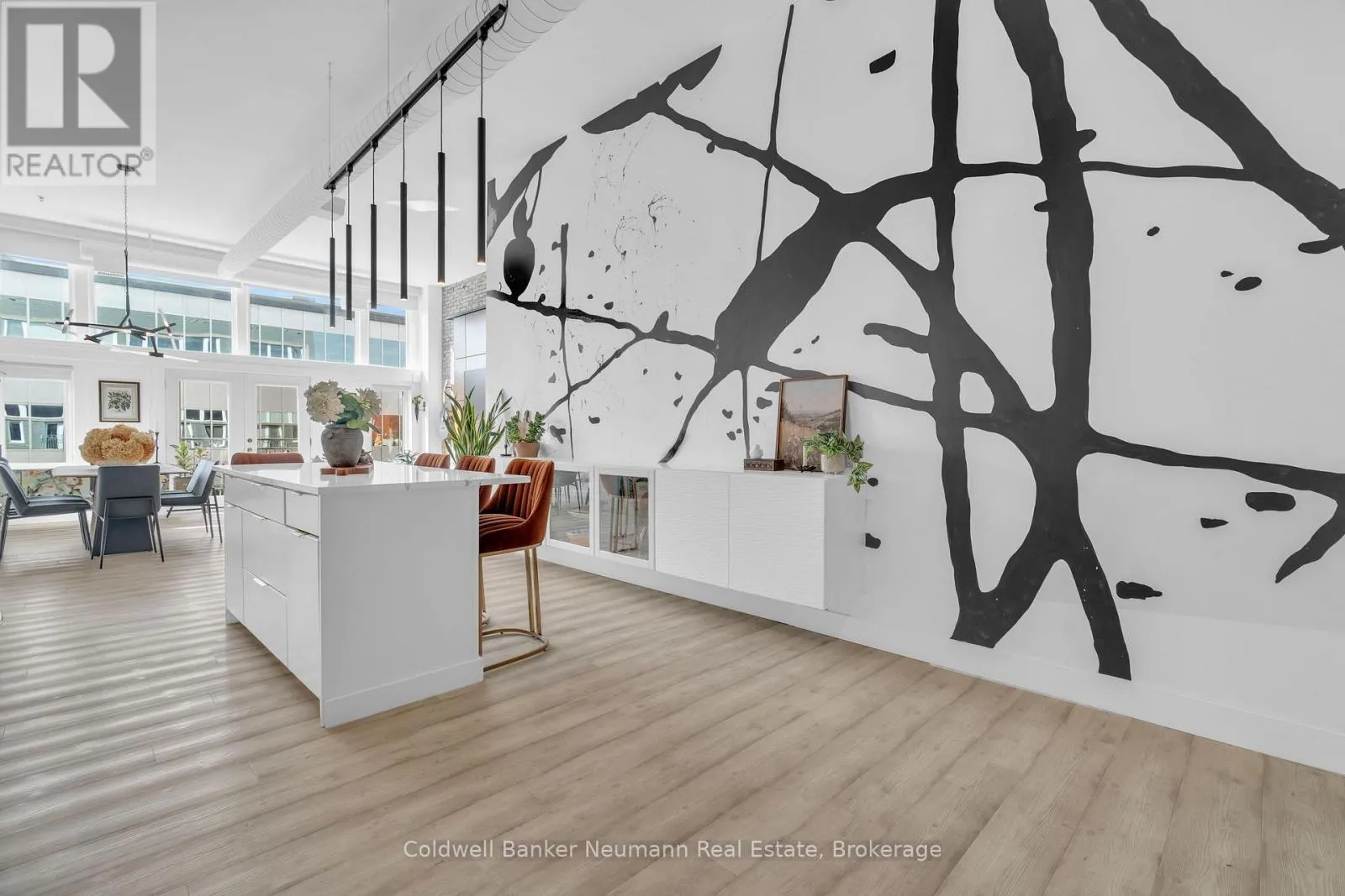 Cross Streets: King St W and Water St N. ** Directions: Victoria St N, Left on Water St N, Left onto King St W. One-of-a-Kind Loft in the Heart of Downtown Kitchener. Welcome to Unit 205 at The Lofts at 276, a stunning, modern, 1-bedroom, 2-bathroom suite that seamlessly blends industrial charm with luxurious finishes. This exceptional, one-of-a-kind space, offers soaring 12-foot ceilings, floor-to-ceiling windows, and garden doors that flood the open-concept living and dining area with natural light. Every detail has been thoughtfully curated, from the wide plank vinyl flooring to the custom design elements throughout. The gourmet kitchen is a chefs dream, featuring rich dark wood cabinetry, veined quartz countertops and backsplash, an oversized island with breakfast bar, custom wine rack, statement lighting and an eye-catching feature wall with built-in buffet. The expansive living area is perfect for both entertaining and relaxing, anchored by a custom fireplace surround with integrated dry bar, wine fridge, and complemented by a warm brick accent wall that adds character and texture. Elegant garden doors open to a Juliette balcony, adding a touch of European charm. The dining space comfortably accommodates family gatherings, offering the perfect setting for special occasions.The main bathroom offers a stylish vanity with a stone vessel sink and a tub with textured tile surround. Additional features include in-suite laundry, underground parking, and an oversized storage locker located just steps from your vehicle. Retreat to the primary suite through double doors to find a wood accent wall, sliding closet barn doors, a custom closet organizer, and a private ensuite. The spa-inspired bathroom includes a walk-in shower with striking black-framed glass doors, wood-look tile, and a generous niche with accent details. Set in a beautifully converted loft building with modern lobby, this home places you in the heart of vibrant Downtown Kitchener just steps from cafés, restaurants, transit, schools, entertainment, and Victoria Park. Urban luxury and everyday convenience await. (id:27476)