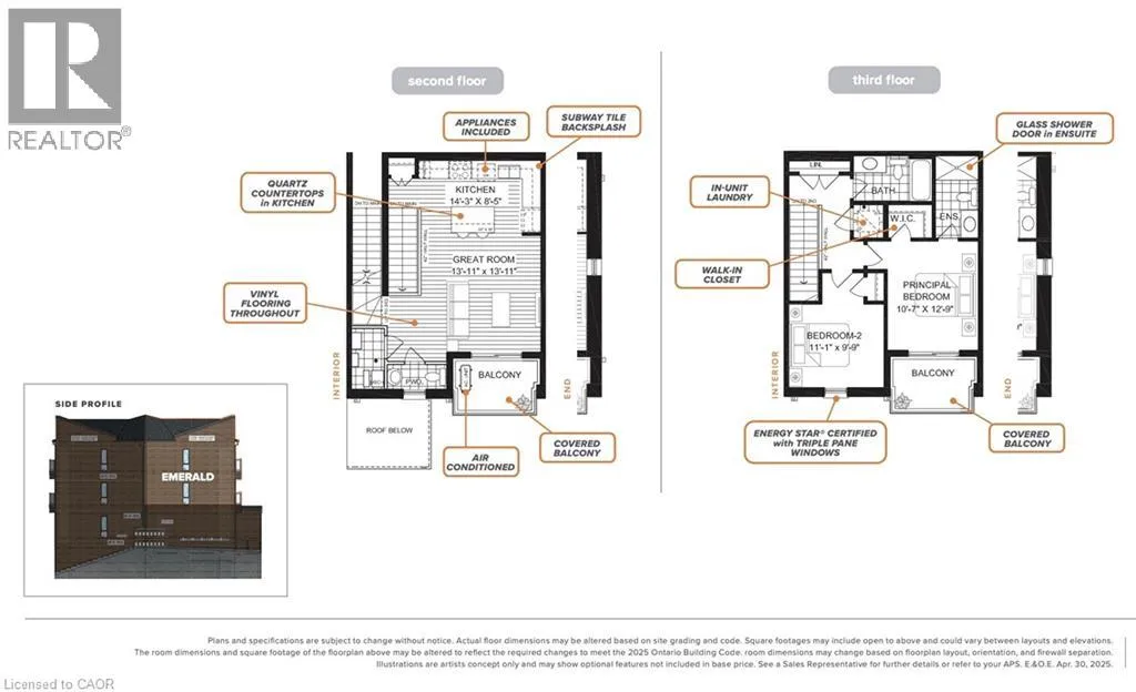 TRUSSLER RD. TO BENNINGER DR. FIRST MONTH RENT IS FREE WHEN YOU SIGN A 13-MONTH LEASE! TWO PARKING SPOTS AVAILABLE. New tenants receive exclusive discounts on Rogers TV, internet and mobile services. BRAND NEW ENERGY STAR® CERTIFIED two and three bedroom stacked townhomes near Sunrise Shopping Centre with flexible move-in. Reserve your favourite unit today and move in anytime from now through July. Welcome to THE EMERALD, a 2 bed, 2.5 bath suite with high ceilings, premium finishes, and a bright open concept layout. The brand new kitchen boast quartz countertops, subway tile backsplash, full-size stainless steel appliances, and an oversized island with breakfast bar seating. Enjoy the convenience of in-suite laundry and central air conditioning/heat for year round comfort. Enjoy two private balconiesâone off the living room and one off the master bedroomâoffering the perfect spot to relax and unwind. Just steps away, Trussler Woods features peaceful trailsâperfect for walking, jogging, and enjoying the outdoors. EV chargers and visitor parking available. Pet-friendly community. Located in a designated school bus zone, offering added convenience for families. Enjoy quick access to Highways 7/8 and 401. Actual units may vary in layout; interior finishes are consistent. Some photos may be virtually staged or taken from the model suite. Tenants pay utilities. Landlord is responsible for furnace filter replacements and water softener maintenance. Book a tour to explore all available layouts! (id:27476)