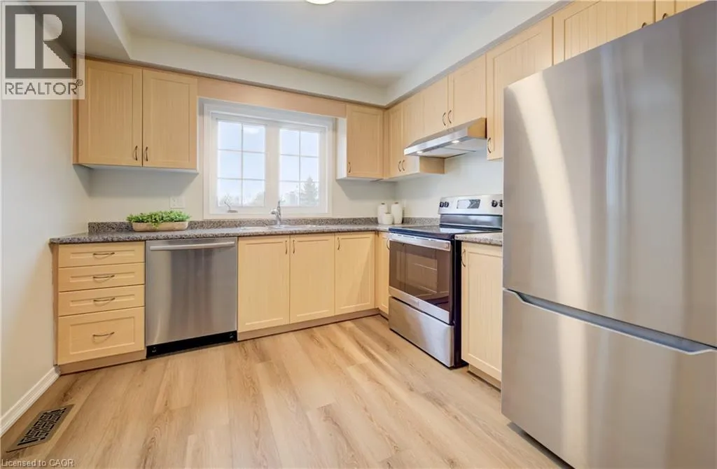 Step inside this thoughtfully designed free-hold condo townhome with over 1,500 sqft of living space, plus a private garage and driveway, this home delivers comfort without compromise, and a layout that offers both function and privacy. You enter at the ground level where the garage and a spacious laundry room with generous storage keep everyday life organized and tucked away. From here, head upstairs to the heart of the home, a bright, open-concept kitchen, dining, and living space elevated above the street for added privacy and quiet. The well-appointed kitchen joins seamlessly with a dining area large enough for a full family table, making entertaining effortless. The airy living room is filled with natural light from oversized windows and patio sliders that lead to a sun-soaked deck, perfect for morning coffee, summer barbecues, or relaxing with a good book in the afternoon sun. A convenient powder room completes this level. Upstairs, 3 bright and welcoming bedrooms each offer their own closet and a sense of comfort and retreat. The primary bedroom is privately positioned at the rear of the home, creating a quieter, tucked-away sanctuary, while the two additional bedrooms overlook the front, ideal for children, guests, or a home office. A well-appointed 4-pc bathroom and convenient linen closet complete the upper level. This location truly shines for convenience. Walk to Food Basics, Real Canadian Superstore, cafes, restaurants, and everyday essentials on Highland Road in minutes. The transit hub at the Superstore plaza provides easy access to multiple Grand River Transit routes, making commuting to Uptown Waterloo, Downtown Kitchener and the universities simple. Filsinger Park and nearby trails offer beautiful green space for evening walks, bike rides and connections through to Victoria Park. With quick access to the Conestoga Parkway linking you to Waterloo, Cambridge and the 401, daily errands are effortless and everything you need is truly at your doorstep. (id:27476)