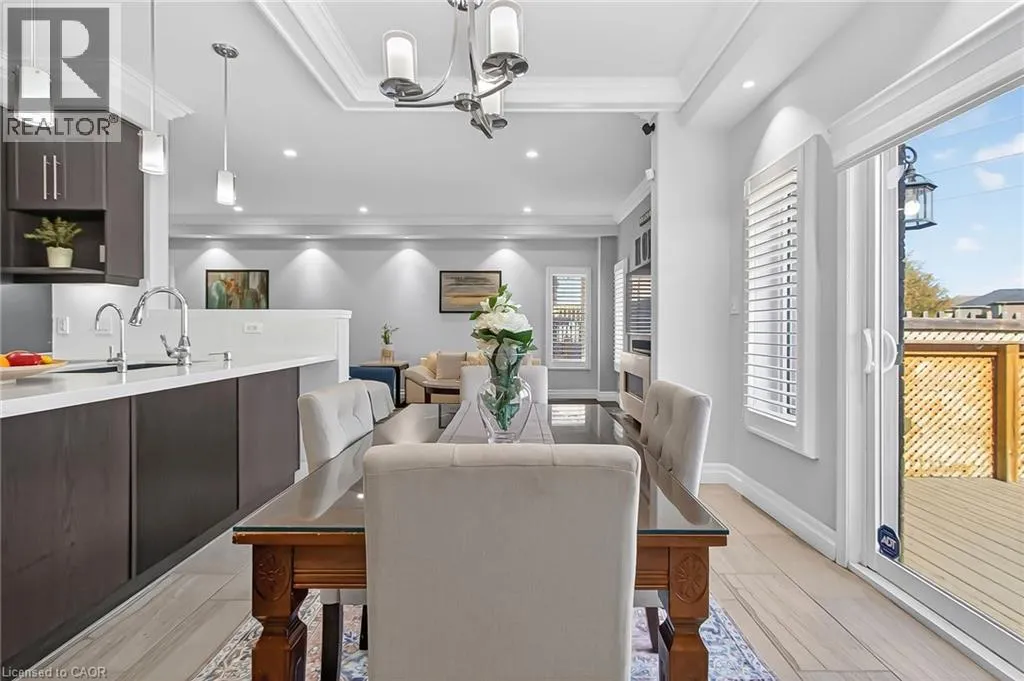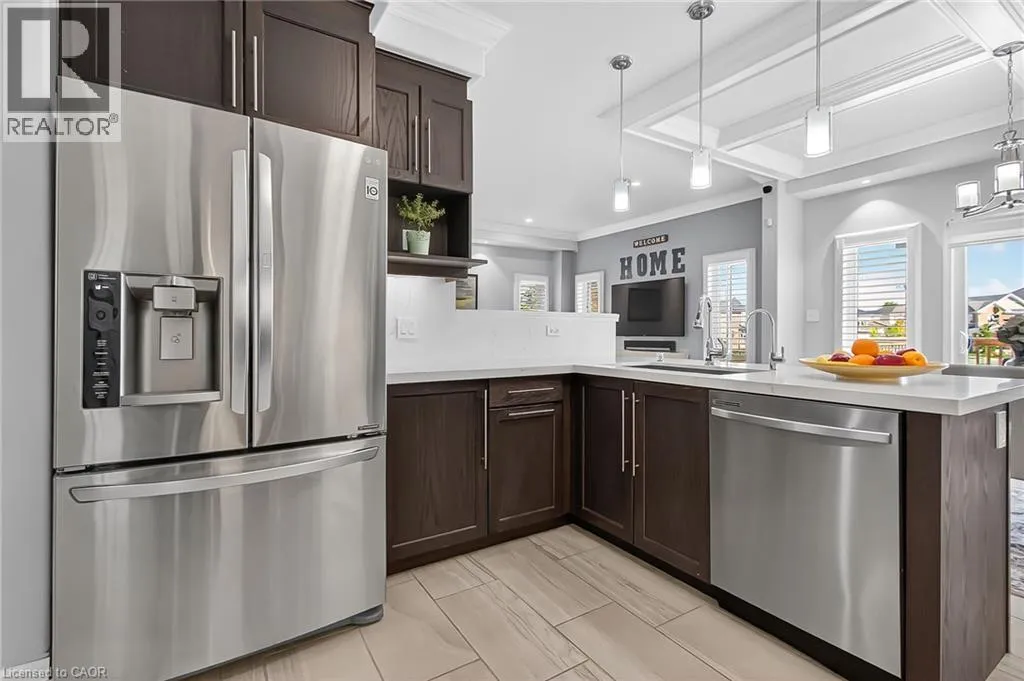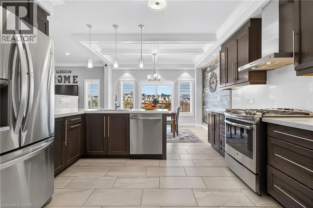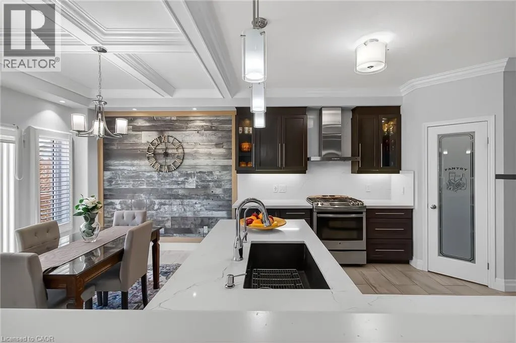 From New Dundee Rd. Left on Blair Creek Dr. Left on Netherwood Rd Welcome to 59 Netherwood Rd., Immaculate, updated 2-storey detached home in one of Kitchener's most sought-after neighborhoods. Offering 5 bedrooms, 4 bathrooms, and 3,516 sq. ft. of total living space (per Mpac) 2,463 sq. ft. above grade + 1,053 sq. ft. finished basement), this home offers a functional floor plan and itâs perfect for families who value space and convenience. Treat yourself to hardwood floors, luxury tile, and vaulted 11-ft ceilings with integrated speakers in the family room. The open-concept chef's kitchen features quartz countertops, a matching full slab backsplash, a pantry, stainless steel appliances, spectacular Accent wall and coffered ceiling in the dining area. The professionally finished basement includes a spacious rec room, bedroom, and 3-pc bath with large lookout windows for natural light. Situated on an oversized pie-shaped lot with no rear neighbors, the backyard is a private haven with an extended wooden deck, ideal for entertaining. Additional highlights include a 2-car garage + 2 driveway spaces, a 200-amp electrical panel, and numerous upgrades: A stucco/ rustic front façade, a custom oversized European style front entryway, coffered ceilings, California shutters, pot lights, security cameras, central vacuum, central humidifier, HRV system and more! Everything about this home is carefully done with functionality and comfort in mind! Located minutes from top-rated schools, parks, trails, shopping, restaurants, Conestoga College, golf courses, and Hwy 401, this home truly has it all. Room measurements are approximate. (id:27476)