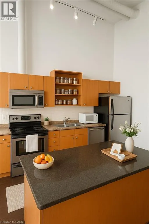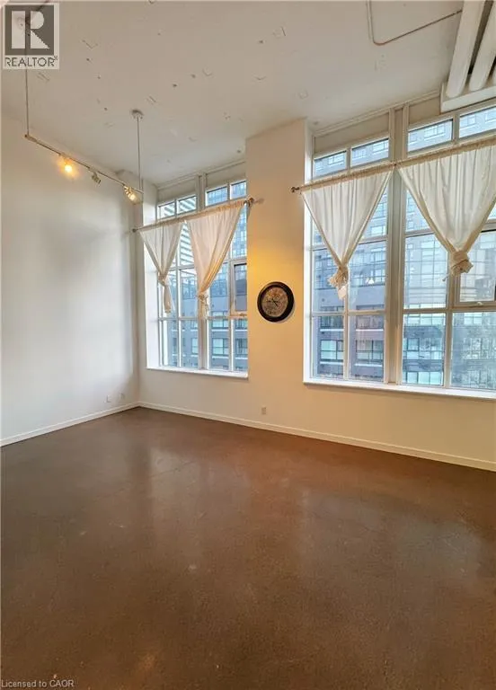 King and Victoria BrighBright and beautifully updated loft in Kitchenerâs vibrant Innovation District, just steps from Google and the University of Waterloo School of Pharmacy! A full wall of south-facing windows fills the space with natural light, highlighting the soaring 14-foot ceilings, polished concrete floors, and sleek open-concept layout. The modern kitchen features a granite island, contemporary cabinetry, and stainless steel appliancesâperfect for everyday living and entertaining. Enjoy the convenience of in-suite laundry, a storage locker, parking, and access to a rooftop patio with BBQ. Walk to the LRT, The Tannery, Victoria Park, and an array of shops and restaurants. Professionally painted and move-in readyâbook your showing today! Some photos are virtually staged. (id:27476)