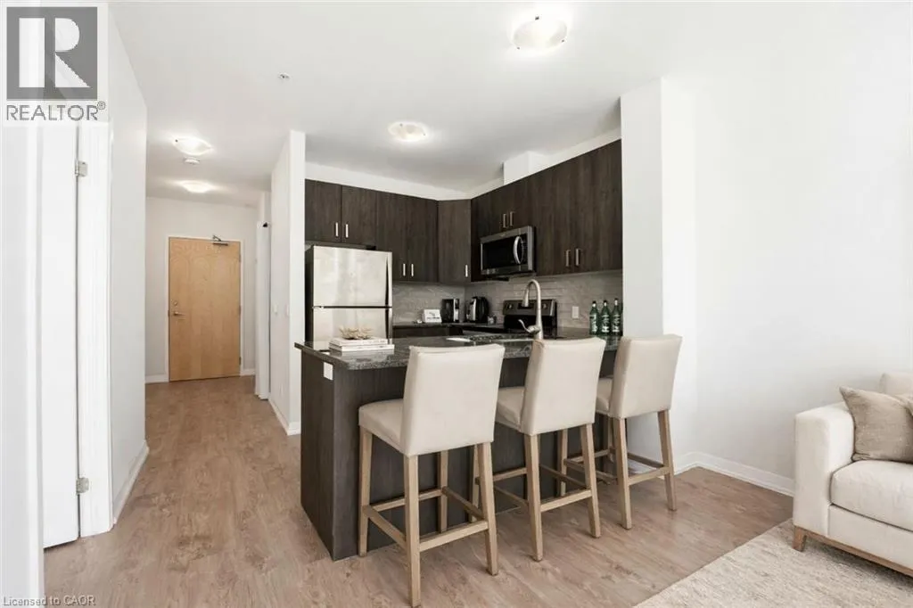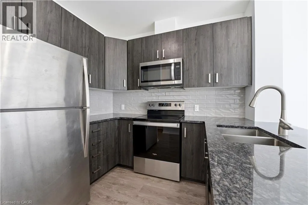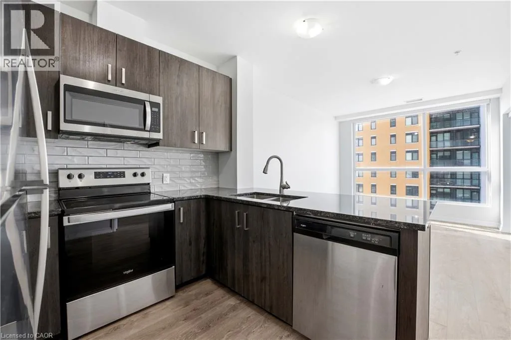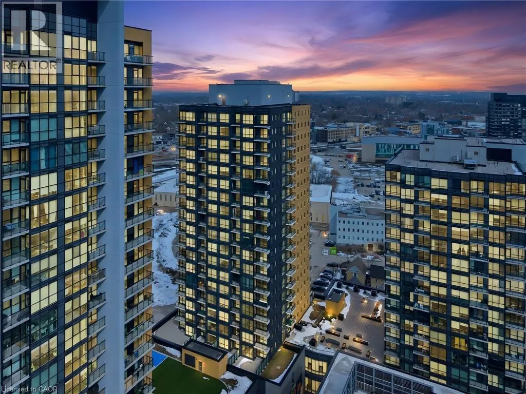 King Street & Victoria St Perched high above the vibrant Kitchener skyline, this ONE-BED + DEN condo at 104 Garment St, Unit 1206 offers an exceptional opportunity in Downtown Kitchenerâs most sought-after addresses. BRIGHT OPEN-CONCEPT LAYOUT enhanced by PREMIUM FLOORING AND FRESHLY PAINTED neutral tones. The contemporary kitchen offers GENEROUS GRANITE COUNTERTOPS, STAINLESS STEEL APPLIANCES, A TASTEFUL TILE BACKSPLASH, & a breakfast bar that overlooks the main living area. The spacious living room is flooded with natural light from IMPRESSIVE FLOOR-TO-CEILING WINDOWS and offers direct access to a private balcony overlooking the terrace below. The PRIMARY BEDROOM IS BOTH COMFORTABLE AND FUNCTIONAL, featuring a large walk-in closet and a GENEROUS WINDOW FRAMING ELEVATED CITY VIEWS. A versatile den provides the perfect space for a home office, reading nook, or guest area, also offering a full 4-piece bathroom, convenient in-suite laundry, and additional storage. Residents of this highly desirable building enjoy an impressive array of PREMIUM AMENITIES INCLUDING A ROOFTOP TERRACE with stunning city views, a fully equipped fitness centre, private theatre room, party room, and a stylish media loungeâperfectly suited for todayâs dynamic professional lifestyle. The unit also comes complete with one underground parking space for added convenience. Ideally situated in the heart of Downtown Kitchenerâs Innovation District, this prime location places you just steps from the ION LRT, Grand River Hospital, Victoria Park, and an incredible selection of restaurants, cafés, and boutique shops. With major employers such as Google and the thriving tech hub nearby, THIS LOCATION IS PERFECTLY POSITIONED FOR PROFESSIONALS SEEKING BOTH CONNECTIVITY AND LIFESTYLE. Offering the perfect blend of modern design, functional living space, and unbeatable downtown convenience, this impressive condominium is a remarkable opportunity to enjoy the very best of city living. (id:27476)