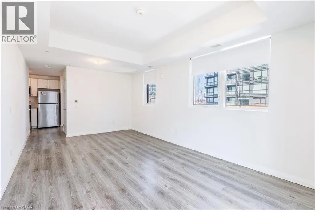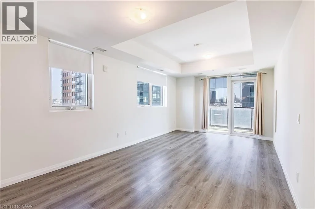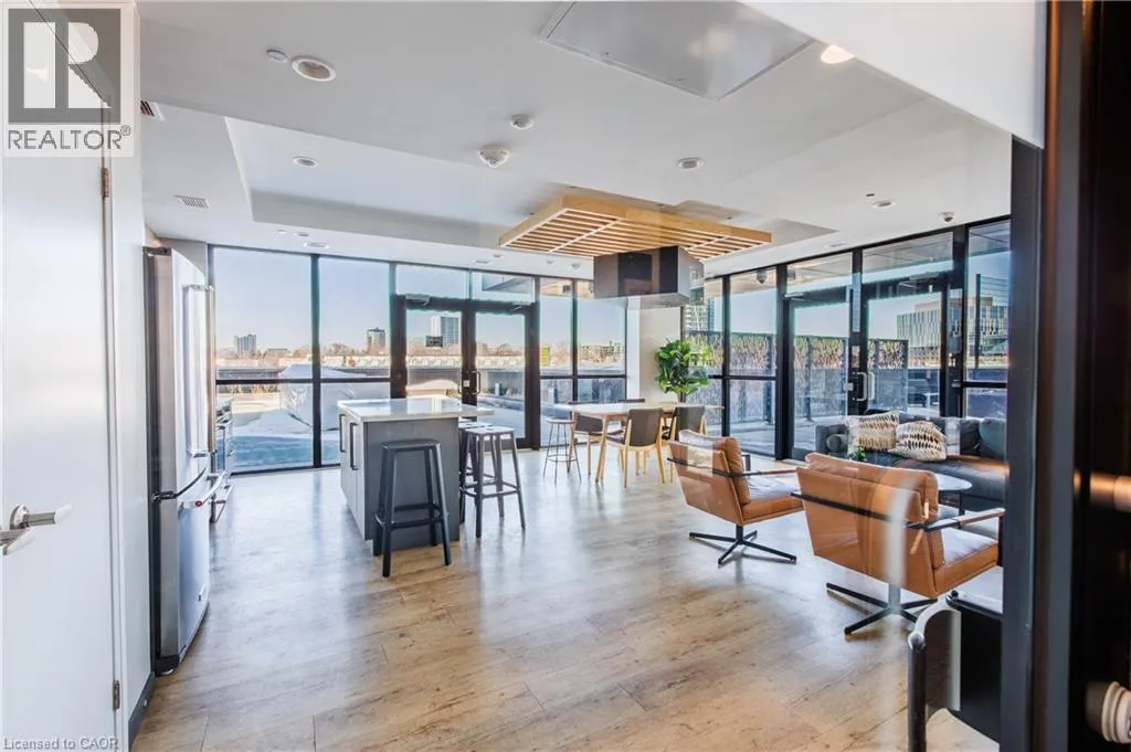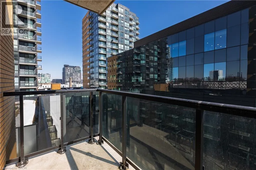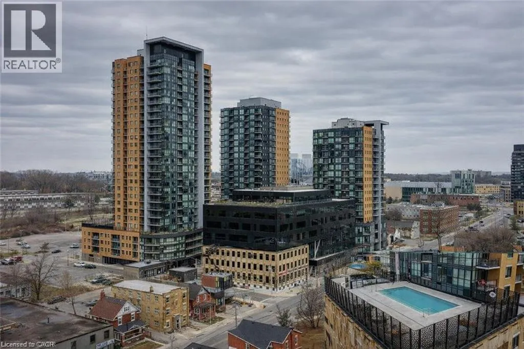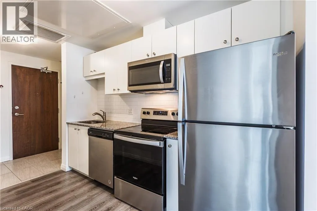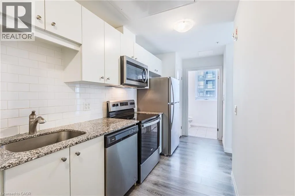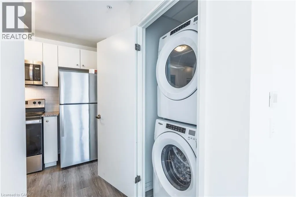 Welcome to Garment Street, Kitchenerâs vibrant Innovation District! This modern bachelor/studio-style condo offers a thoughtfully designed open-concept layout. The bright living area is filled with natural light from large windows and features engineered flooring throughout, creating a clean and contemporary feel. The kitchen is beautifully finished with modern cabinetry, granite countertops, backsplash, and stainless steel appliances. The in-suite washer and dryer add everyday convenience. Residents of this sought-after building enjoy exceptional amenities including an outdoor swimming pool, half-court basketball court, landscaped terrace with BBQ area, party room with private patio, outdoor dog run with pet washing stations, fitness room, and a yoga/wellness studio. Located steps from the ION Light Rail Transit, GO Station, and bus routes. This unbeatable location is within walking distance to Tech Hubs including Google. Youâll also be just minutes from Downtown Kitchener, Victoria Park, restaurants, shopping, and more. Donât miss this fantastic opportunity. (id:27476)