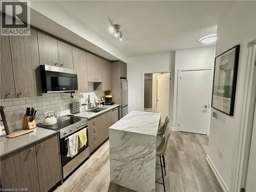KING ST. W. TO WELLINGTON ST. S. FULLY FURNISHED 1 Bedroom Condo in Station Park with an Exceptional Layout. This stylish unit features a spacious bedroom, an oversized bathroom, in-suite laundry, and an elegant kitchen with an island that opens to a cozy living room. Step out onto the terrace to enjoy breathtaking sunrise and sunset views. Residents have access to top notch amenities, including 24/7 concierge, swim spa, Peloton studio, fully equipped gym, bowling alley, party room with wet bar and private dining, and a terrace with firepits and BBQs. Thereâs even a spa station for pets! Ideally located just minutes from Downtown Kitchener, Uptown Waterloo, the LRT station, Google, and more. Parking is available for an extra charge. HEAT & INTERNET included in condo fees! (id:27476)