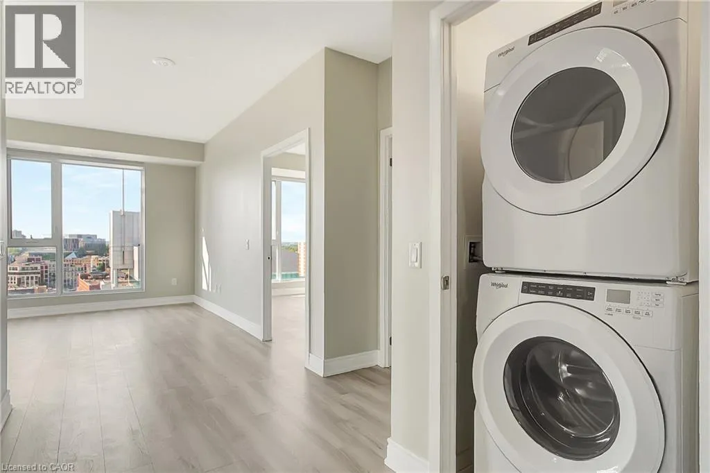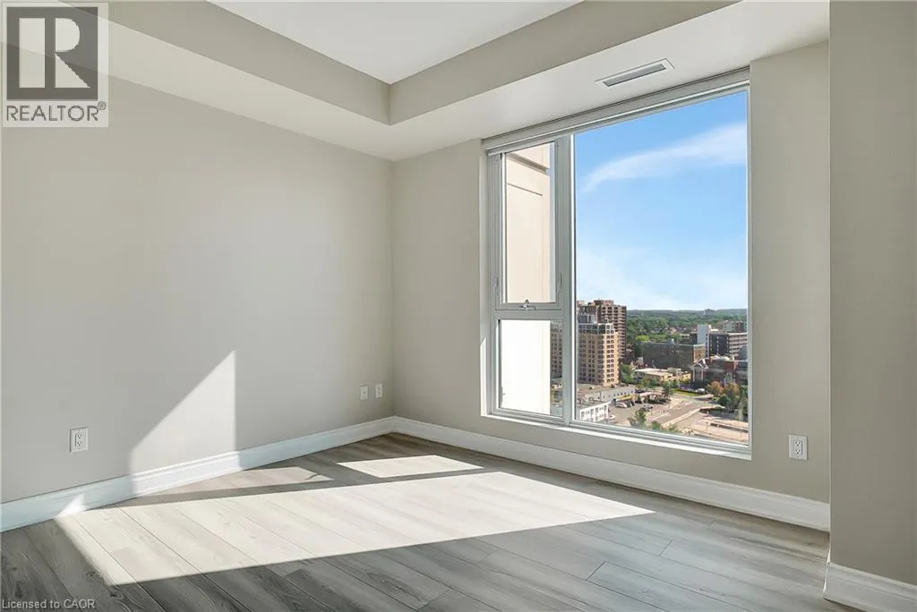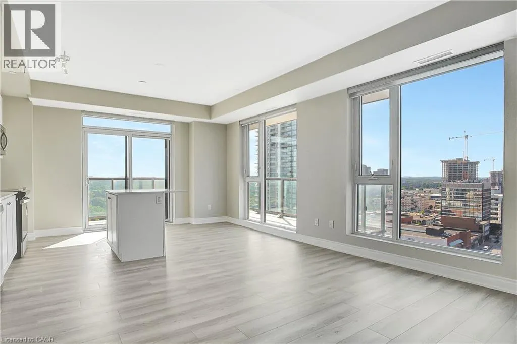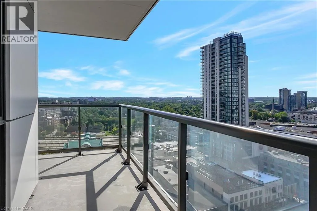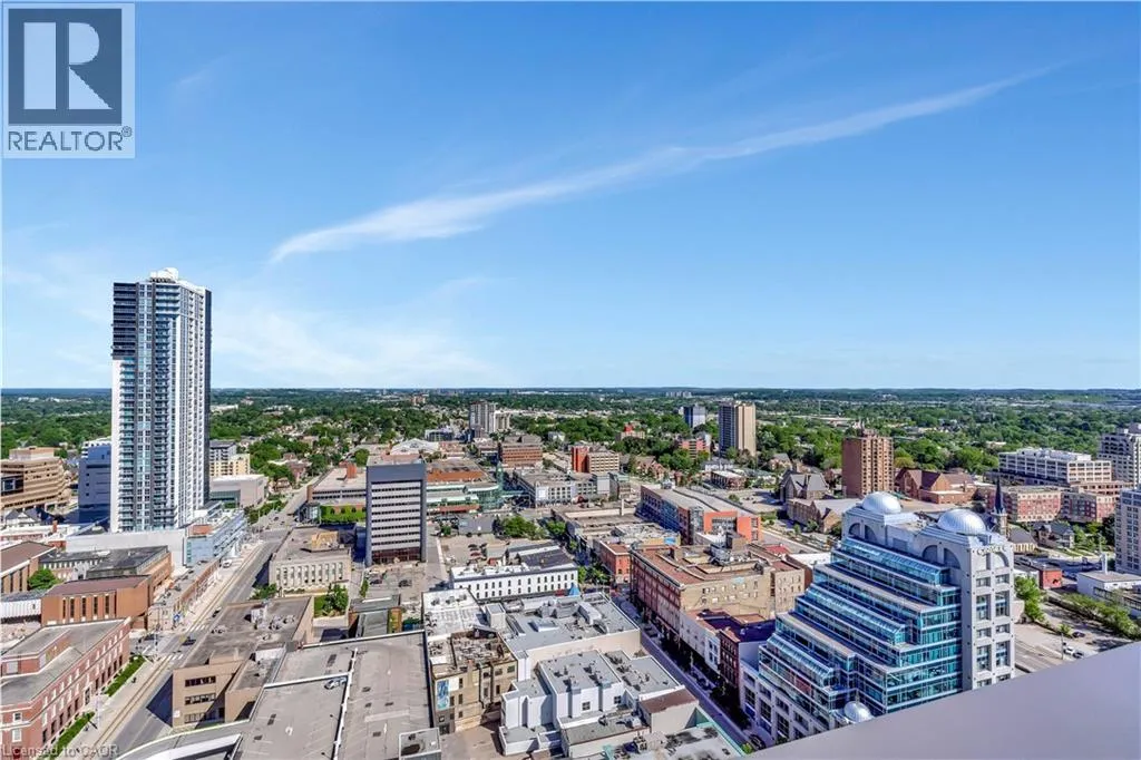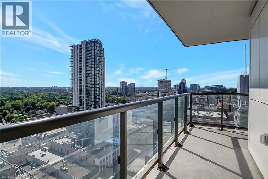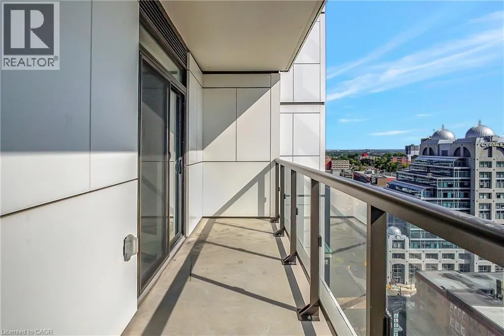 King St. W. to Young St. Experience elevated downtown living in this beautifully designed 2-bedroom, 2-bathroom condo in the heart of Kitchener. Offering 1,163 sq. ft. of bright, thoughtfully planned living space, this spacious unit features large windows that fill the home with natural light and showcase sweeping city views. The modern kitchen is both stylish and functional with quartz countertops, ample cabinetry, and a layout that flows seamlessly into the open living and dining areas, creating a comfortable space for everyday living or entertaining. Step outside to the impressive wrap-around balcony, providing plenty of room to relax and enjoy the skyline from multiple vantage points. Inside, upgraded flooring adds a polished feel throughout the unit, while the primary bedroom offers a well-appointed ensuite with a spacious walk-in shower. Ensuite laundry and a dedicated parking space add to the convenience. Located in one of Kitchenerâs most connected neighbourhoods, this home places you just steps from the LRT, City Hall, Google, and the regionâs thriving tech hub, along with an incredible selection of restaurants, cafés, and shops. Victoria Park is also nearby, offering beautiful green space and year-round events. Residents enjoy a wide range of amenities including a rooftop jogging track, fully equipped exercise room with spin bikes, outdoor yoga space, dog wash station, third-floor sun terrace, and a shared BBQ area. A fantastic opportunity to enjoy modern condo living in the centre of it all. (id:27476)