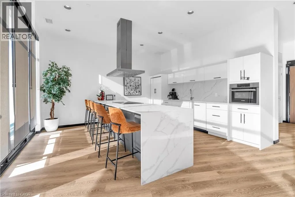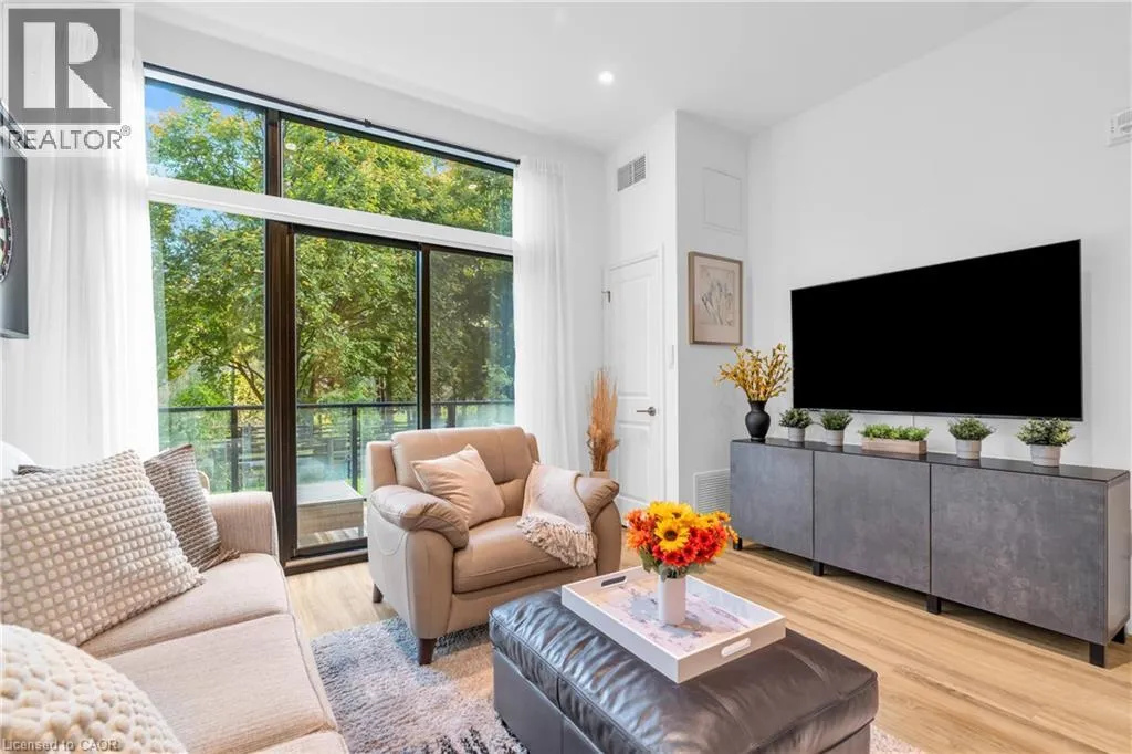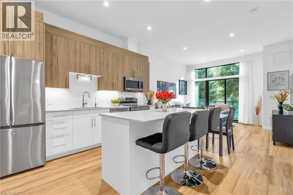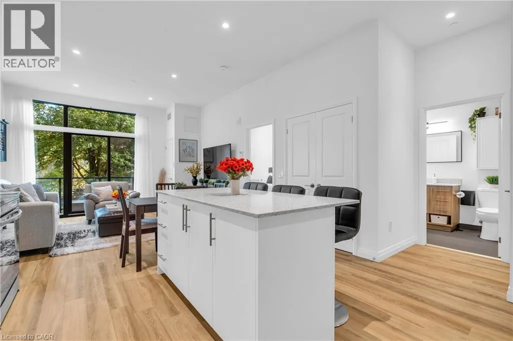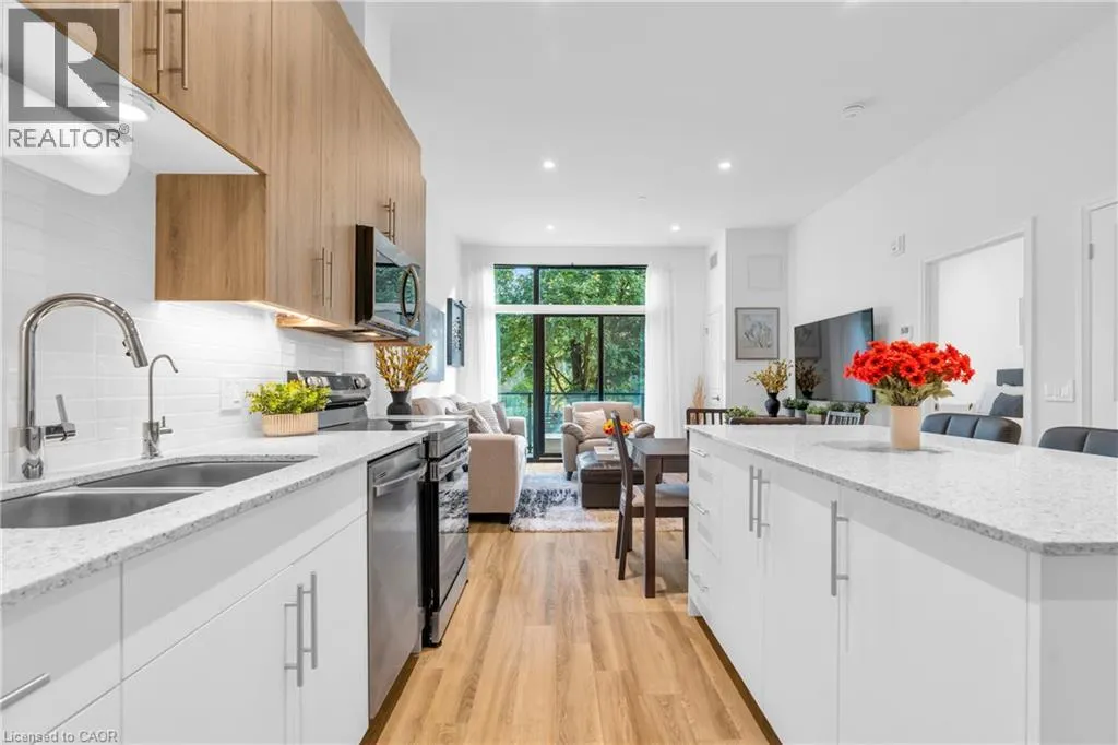 Homer Watson to New Dundee Rd Welcome to 525 New Dundee Road, Unit 101. A modern and bright one-bedroom condo located on the main floor of a newly built building. This spacious unit features impressive 10-foot ceilings and a thoughtfully designed open-concept layout, creating an airy and inviting living space. Step out onto your private balcony, where you can enjoy peaceful views of the forest and walking trail just beyond. The stylish kitchen is equipped with stainless steel appliances, sleek cabinetry, and a reverse osmosis water system, offering both functionality and modern appeal. The living area is enhanced with power remote-control blinds, providing effortless comfort and convenience. This well-appointed unit also includes in-suite laundry, ample storage, and contemporary finishes throughout. Residents enjoy access to exceptional building amenities including a fitness centre, sauna, party room, library, pet wash station, and a beautifully designed outdoor patio with BBQs. Perfect for entertaining or unwinding. Ideally located just minutes from Highway 401, Conestoga College, shopping, restaurants, and scenic walking trails, this home offers the perfect balance of comfort, nature, and accessibility. A fantastic opportunity for first-time buyers, down-sizers, or investors looking for low-maintenance living in a growing community. (id:27476)