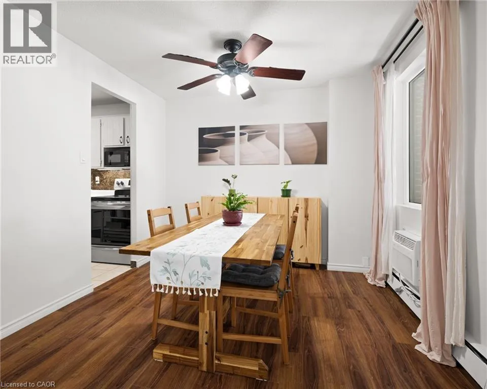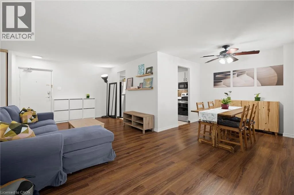 Welcome to Unit 203 at 279 Chandler Drive, a bright and spacious 2-bedroom condo in Kitchenerâs convenient Laurentian Hills neighbourhood. Offering approximately 814 sq ft of well-designed living space, this second-level unit features a generous living room, separate dining area, and an efficient kitchen layoutâperfect for first-time buyers, downsizers, or investors. Step outside to your private terrace and enjoy fresh air and outdoor relaxation. The building includes elevator access, a sauna, common laundry, and secure underground parking with one assigned space. Condo fees conveniently cover heat, hydro, water, building insurance, parking, and common elements, helping simplify monthly budgeting. Solid brick construction and a well-managed building add long-term peace of mind. Located close to shopping, schools, parks, trails, public transit, and with quick access to major highways, this home offers excellent value in a central, commuter-friendly location. (id:27476)