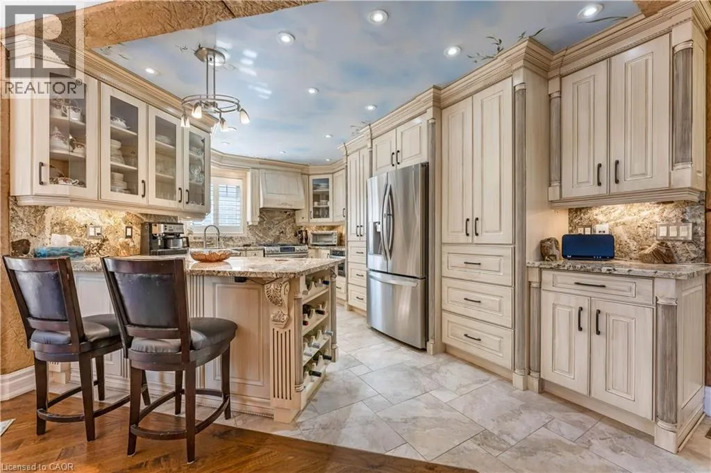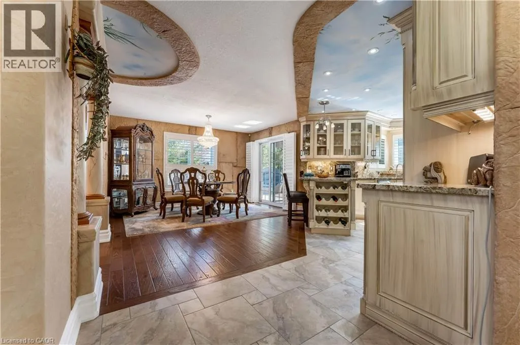 Grand River Blvd To chandos Dr Welcome to 60 Chandos Drive, Kitchener: A Timeless Masterpiece. Step into a home where European elegance meets modern comfort. Situated on an impressive 52 x 143 ft lot, this beautifully maintained detached home showcases quality craftsmanship and thoughtful design. From the moment you arrive, the homeâs striking curb appeal stands out, complemented by parking for up to 5 vehicles: 2-car garage, 3-car driveway. Inside, you are welcomed by a grand foyer with soaring ceilings along with Elegant finishes, custom wall details and vintage-style ceiling work. The inviting living room features a cozy gas fireplace, perfect for relaxing or entertaining. The gourmet kitchen offers granite countertops, stainless steel appliances and oak cabinetry with ample storage. A wine display with glass cabinetry adds a sophisticated touch. Adjacent is the dining area, perfect for family gatherings. The main floor also features a laundry room. Upstairs, there are 3 generously sized bedrooms. The primary suite includes a walk-in closet with organizers and a luxurious 5pc ensuite with jacuzzi tub and separate shower. The additional bedrooms are bright and complemented by another 4pc bathroom. The fully finished basement offers extra living space with a large rec room with gas fireplace, a bedroom or office, full bathroom and a wet bar, perfect for throwing parties. There is also walk-up access to the garage. Step outside to an exceptional, fully fenced backyard, finished with low-maintenance concrete, it features a composite deck with glass railings, gazebo seating area, above-ground pool, storage shed and decorative pond with waterfall, creating a peaceful outdoor oasis. Additional upgrades include a generator plug at the electrical panel for added convenience during power outages. Ideally located just minutes from Chicopee Ski & Summer Resort, the Grand River, scenic trails, Highway 401, and public transit. This extraordinary home truly checks every box. Book your private showing today. (id:27476)