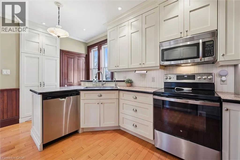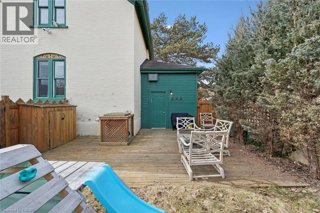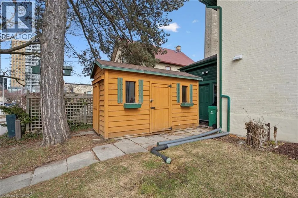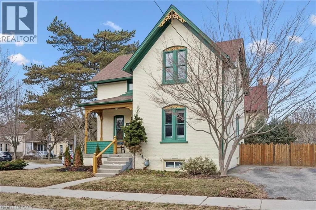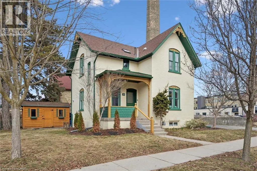 VICTORIA ST S TO OAK STREET, LT ONTO LINDEN AVE This home is a rare blend of historic character and modern livingâquietly set on a tree-lined street in the heart of the cityâs tech hub, just steps from Victoria Park. The double-brick exterior offers undeniable curb appeal, complimented by a covered front porch and parking for 3 cars. Inside, the foyer welcomes you with a curved birch staircase with the original banister, showcasing the exceptional craftsmanship this area is known for. To the right, the spacious living room features maple hardwood flooring that flows seamlessly into the formal dining room and continues into the beautifully designed kitchenâboth stylish and highly functional. Thoughtful details like elegant trim and baseboards enhance the homeâs timeless appeal throughout. From the kitchen, a door leads to the former summer kitchen, open to lots of possible uses and even has a loft and a separate heating system. Step outside to discover your fenced yard with deck and room for gardening! The back room also has convenient access to the side yard and a shed complete with a barn door and rampâperfect for easy storage. Upstairs, youâll find 4 well-sized bedrooms and a 4 pc bathroom. Walk to work, shops, dining, and green space, with The Tannery and its restaurants, cafés, and services just around the corner. For the history buffs: This Ontario Gothic classic home was built in 1889 for Henry Wildfong: a 19th century builder, contractor, and local politician. This is a truly move-in-ready heritage style home in a convenient location. Book your private showing today! (id:27476)