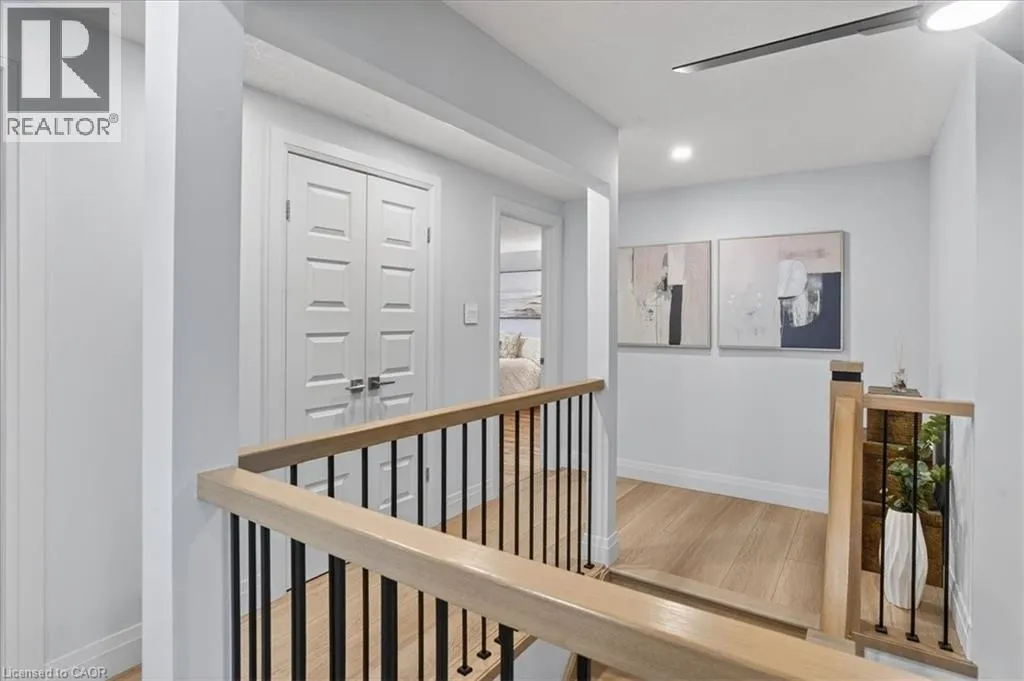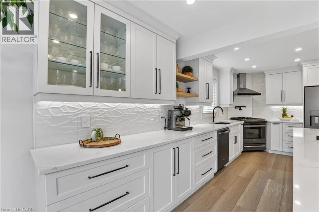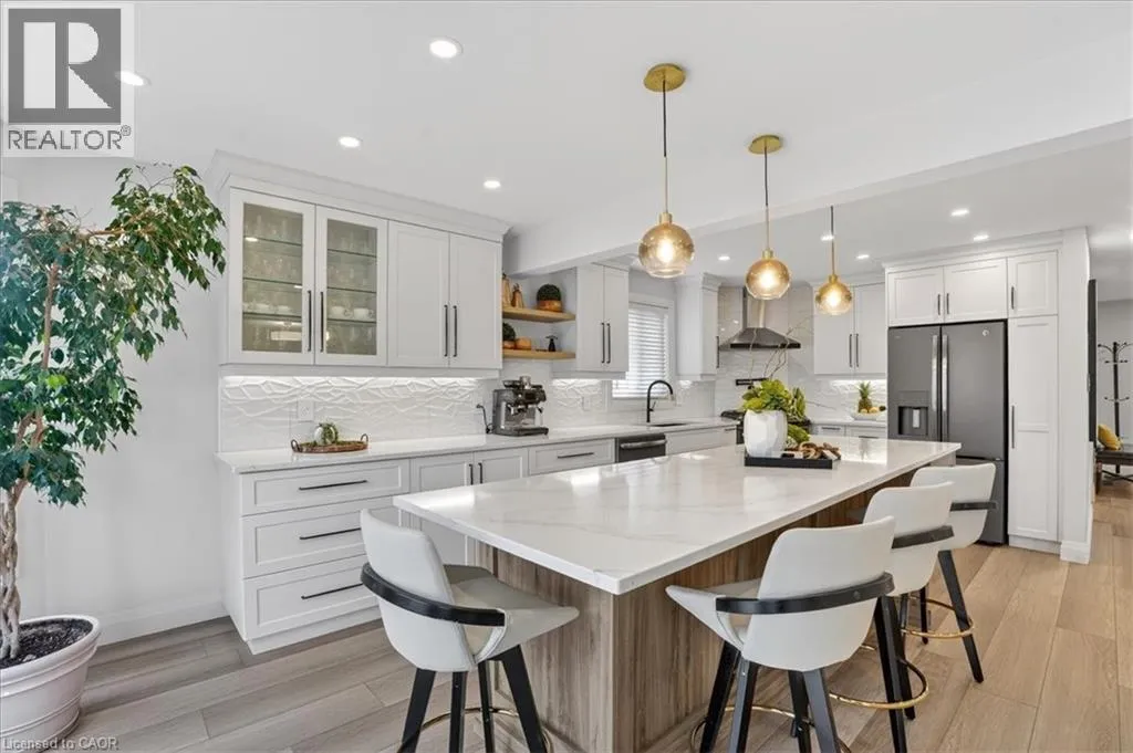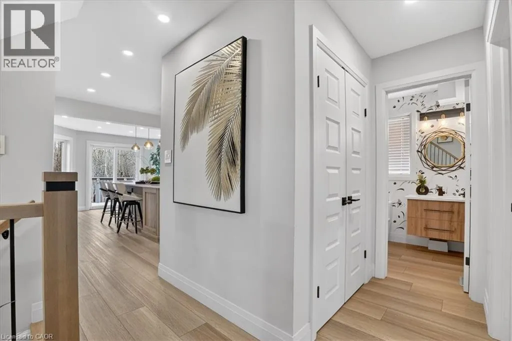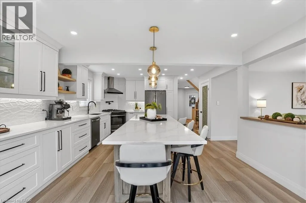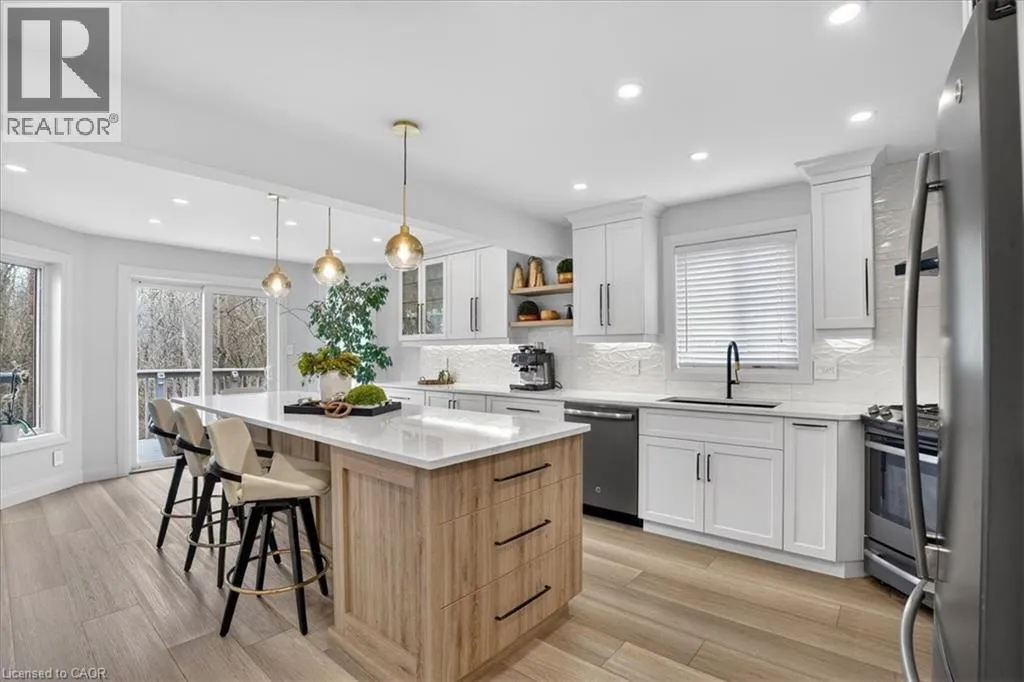 Fairway Road North to Idle Creek Drive to Ardwood Place Stunning, professionally renovated 3 bedroom, 4 bathroom home in a superior Idlewood location. Nestled on a premium court walk-out lot, backing onto Briarfield Park Natural Area. Meticulously maintained and loved by original owners. The interior has been beautifully transformed with recent extensive upgrades throughout, including exceptional kitchen by Polwood Kitchens with abundance of full height cabinetry, large island (11' long), quartz countertops, Stainless Steel appliances (gas stove/oven) and walk-in pantry (all in 2022). Very bright, with large windows and sliding doors to upper deck with full forest views. The kitchen is open to an elegant Living Room with electric, modern Napoleon fireplace. Spacious, formal Dining Room is perfect for friends and family dinners. The 2 piece Powder Room and Laundry Room, conveniently located on the main floor. New luxury plank flooring throughout and wholly new white oak staircase with black metal spindles (2022). The second floor features 3 bedrooms with large windows and new hardwood flooring, including huge Primary with his/her closets and spectacular spa-like 5 piece luxury Ensuite with large glass walk-in shower, free standing tub, wall-mounted double vanity with makeup table, quartz countertops and large porcelain flooring tiles throughout (2021). The walkout basement provides lots of light as well as access to the rear patio and forest. Spacious Recroom, Games Room, wet bar, Office and 3 piece Bathroom. Don't forget the stairs from the garage to the basement and abundant storage/workshop under the garage. Additional updates include: Furnace and A/C (2013), interior shaker style doors (2022), all stainless steel appliances (2019), 2 gas lines to BBQ. Two car garage and concrete driveway for 4 cars. No sidewalk to shovel! A Great Family Home on a safe court. Minutes to Chicopee Ski Hill, Grand River Trails, Springmount, Lackner and Idlewood Creek Parks, schools, shopping and easy access to Highway 6, Highway 8 & 401. (id:27476)