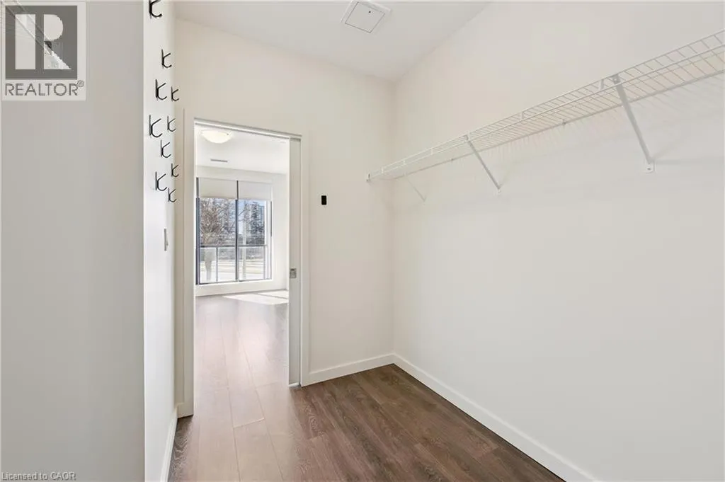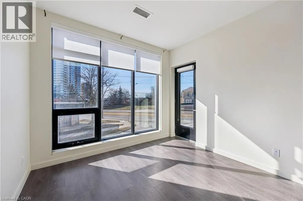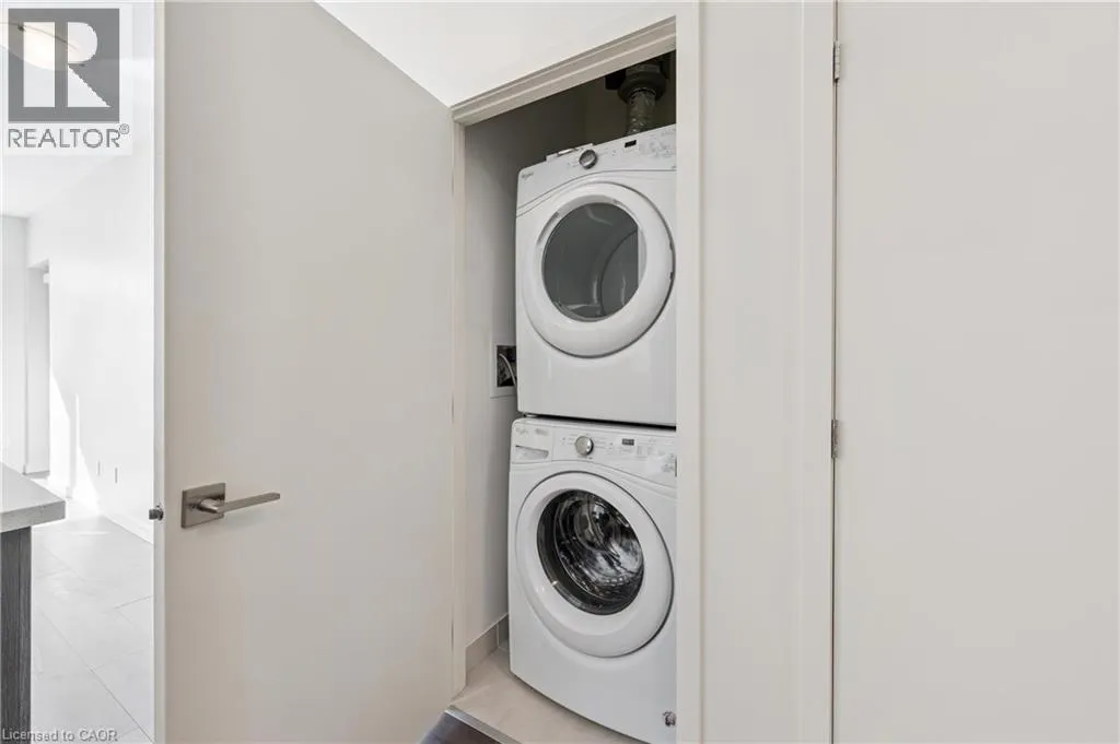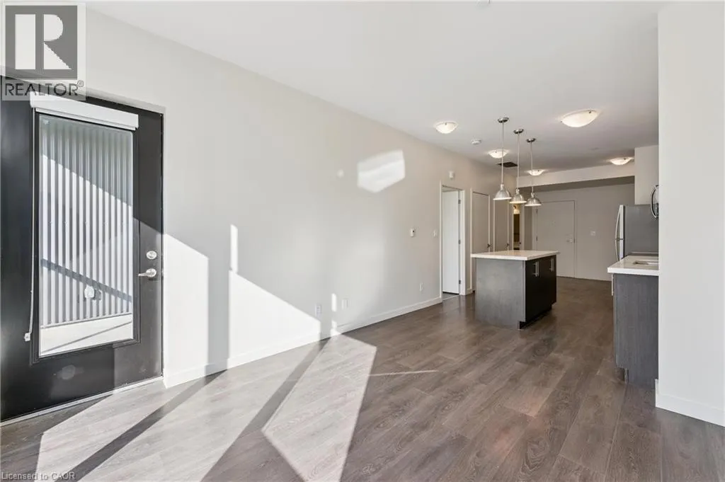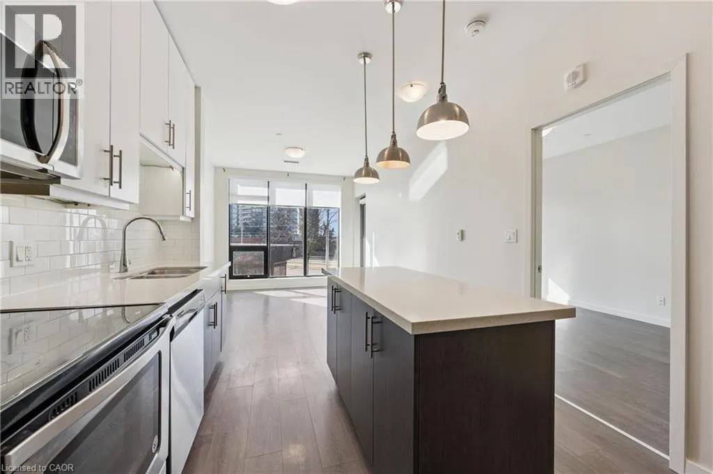 Welcome to Midtown living at its best - this beautifully upgraded one-bedroom condo offers a bright, modern space in one of Kitchenerâs most sought-after boutique buildings. Thoughtfully designed with a functional open-concept layout, the unit is filled with natural light from expansive floor-to-ceiling windows, creating an airy and inviting atmosphere throughout. The kitchen is both stylish and practical, featuring quartz countertops, a breakfast island ideal for casual dining or entertaining, a sleek backsplash, and stainless steel appliances. The living area extends seamlessly to a private balcony, offering open city views and the perfect spot to unwind. The spacious bedroom includes a walk-in closet, while the well-appointed four-piece bathroom is finished with quartz countertops for a clean, elevated look. Carpet-free throughout with a combination of porcelain tile and laminate flooring, the unit also includes the convenience of in-suite laundry. This rental includes one underground parking space and a storage locker, adding everyday practicality. Residents enjoy access to premium building amenities, including a fitness centre, lounge space, and a landscaped outdoor terrace complete with BBQs. Ideally located in the heart of Midtown, youâre just steps from the LRT, Victoria Park, shopping, restaurants, cafés, and Kitchenerâs thriving tech hub - including Google, The Tannery, Vidyard, and Sun Life. Available April 1st. (id:27476)