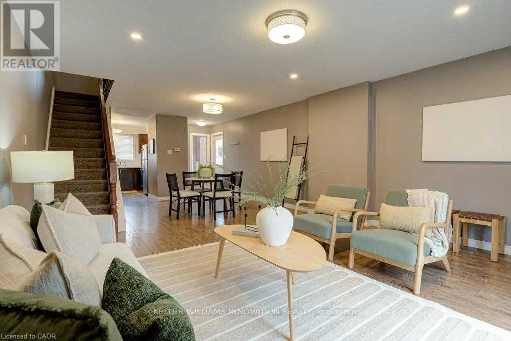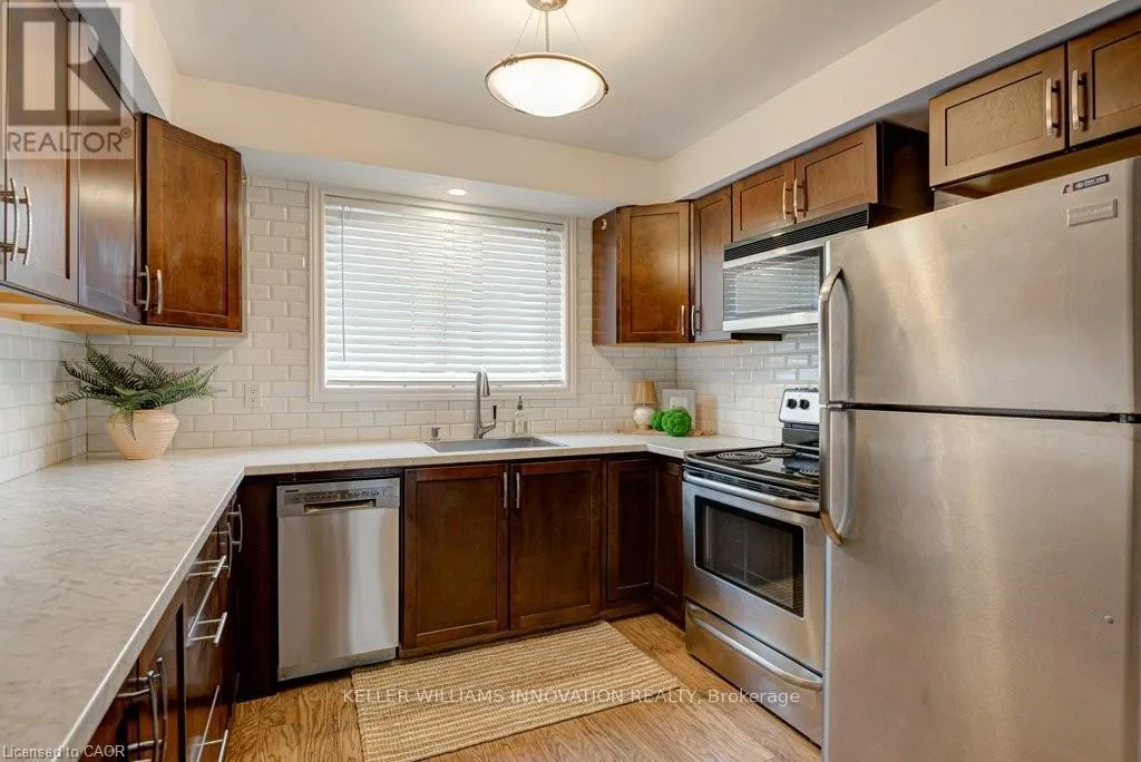 Cross Streets: Highland Rd W. ** Directions: In between Highland Rd W and Queen's Blvd. Welcome to Unit 23 at 50 Westmount Rd W, a well-maintained townhouse in Kitchener's established Victoria Hills neighbourhood. Perfect for first-time buyers or those looking to downsize without giving up functional space, this home offers a practical layout in a convenient location. The main floor features a bright, open-concept living and dining area with warm flooring and large windows that bring in natural light. The kitchen offers ample cabinetry and workspace, ideal for everyday living. A rare and valuable feature at this price point, the main floor also includes a full bathroom for added flexibility. Upstairs, you'll find two spacious bedrooms with good closet space and a full bathroom. The finished basement provides additional living space that can be used as a rec room, home office, or guest area. Enjoy your own private outdoor space, perfect for relaxing or entertaining during the warmer months. Located in Victoria Hills, this home is surrounded by parks, schools, and everyday amenities. You're just minutes from Victoria Park, Westmount Golf & Country Club, shopping, and transit, with easy access to downtown Kitchener and major routes for commuting. A great opportunity to enter the market or simplify your lifestyle in a well-connected, family-friendly neighbourhood. (id:27476)
