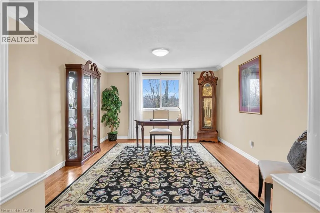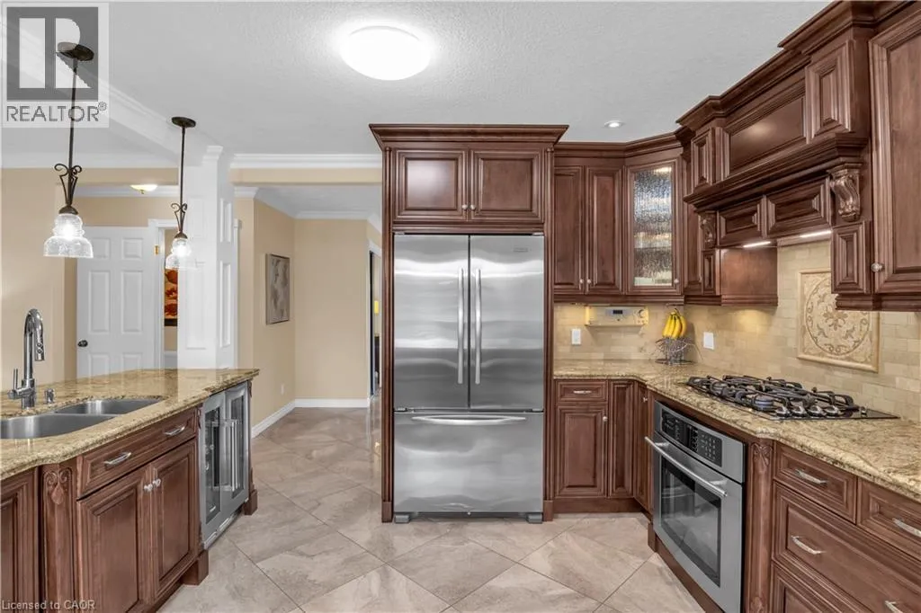 Lackner to Oldfield to Michener Welcome to 228 Michener?Crescent, an elegant two-storey brick home on a quiet crescent in Idlewood. Nestled among mature trees, it offers over 2,600 sq ft above grade plus a finished walk-out basement for roughly 3,800 sq ft of living space. Double doors open to a tiled foyer with a curved oak staircase and detailed trim, setting a refined tone. Formal living and dining rooms showcase hardwood floors, crown moulding and wainscoting. French doors from the breakfast room open to a deck that blends indoor-outdoor entertaining. The chefâs kitchen features rich cabinetry, granite counters, stainless appliances, a large island and a bright breakfast area overlooking the backyard. A sun-filled family room with a gas fireplace invites relaxed evenings, while a main-floor powder room and laundry room with cabinetry add convenience. Upstairs, three bedrooms provide restful retreats. The primary suite boasts a five-piece ensuite and walk-in closet. A main bath and dedicated office complete this level. The walk-out basement extends your living space with a recreation room, bar, bonus room and three-piece bath, all with direct access to the backyard. An entrance from the garage into the basement and a fully excavated garage provide exceptional storage. Outside, mature landscaping, a generous deck and private yard create a tranquil retreat. Outside, mature landscaping, a generous deck and walk-out patio create private spaces for entertaining and relaxation. Idlewood offers parks and trails like Idlewood Park and Chicopee Hills Trail, great schools, shopping at Fairview Park Mall, and easy access to Chicopee Ski & Summer Resort and Highway8. Idlewood is known for its family-friendly atmosphere and lush greenery. This beautifully crafted residence blends classic details with modern comforts. If youâre seeking a warm, inviting and luxurious family home in one of Kitchenerâs most desirable communities, 228 Michener Crescent awaits your visit. (id:27476)