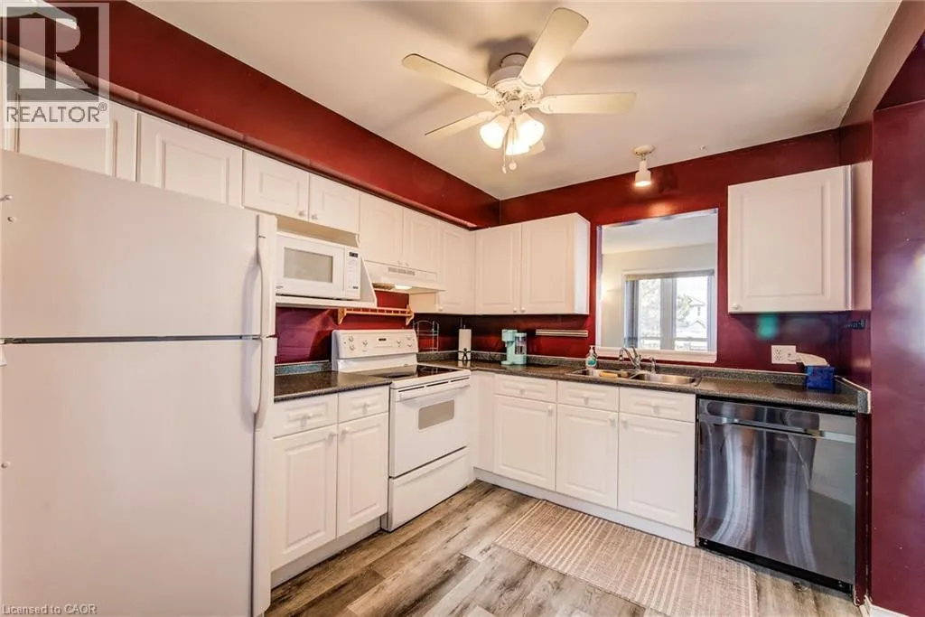 East off Hazelglen, near Victoria. Welcome to this affordable two-storey condo townhome offering a smart layout, generous living space, and low-maintenance living. Featuring 2 spacious bedrooms and 1.5 bathrooms, this home is ideal for first-time buyers, downsizers, or investors. The open living and dining area is bright and inviting, finished with newer laminate flooring and paint, creating a clean, modern feel. Sliding doors from the living room lead to your deck and fully fenced backyard, complete with artificial turf for virtually maintenance-free outdoor enjoymentâperfect for relaxing, entertaining, or pets. The functional kitchen offers efficient workspace and the cabinet doors have been refreshed in timeless white. Upstairs, youâll find two generously sized bedrooms, including a comfortable primary bedroom featuring both a walk-in closet and an additional double-door closet, providing excellent storage. The main 4-piece bathroom includes a durable acrylic tub/shower surround and offers ensuite privilege to the primary bedroom. The finished lower level adds valuable extra living space with a rec room ideal for a media space, home office, or hobby area. Thereâs also a two-piece powder room, and utility/laundry room with washer and dryer. A newly repaved asphalt driveway and a freshly poured concrete walkway to the main entrance (2025) enhances curb appeal and convenience. The condo fees are very reasonable, and includes roof, snow removal, private garbage removal, and common area lawn maintenance. Additional highlights include a newer furnace, and owned water softener (2021). The single garage, with additional storage, has a MyQ Wi-Fi enabled smart garage door opener. Centrally located near Victoria Street and Westmount, this location is handy to public transit, schools, restaurants, healthcare clinic, two hospitals, and shopping in the downtown Kitchener core. Get your start on the property ladder at an affordable price or enhance your investment portfolio. Book your showing today! (id:27476)