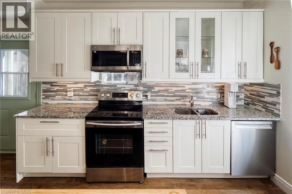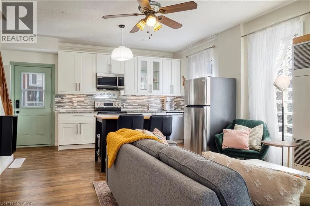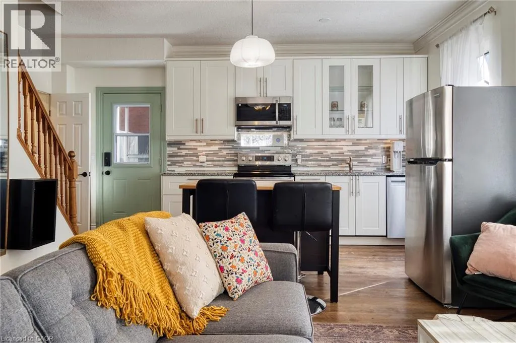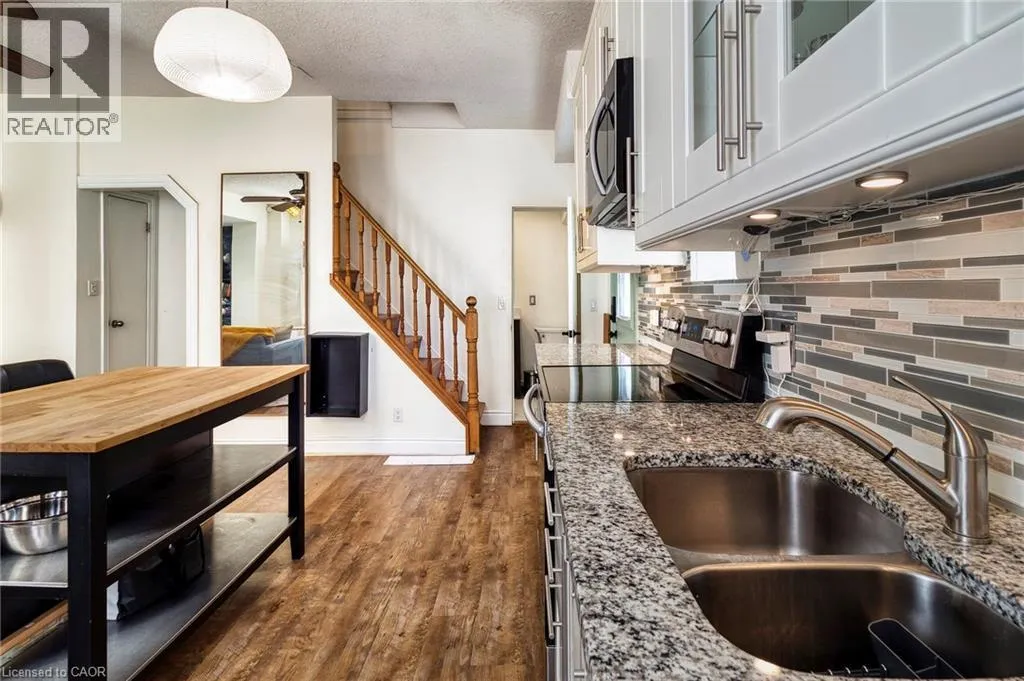 Finally, a creative and cozy 1-bedroom+den option offered in Midtown! This delightful semi-detached house brings you home to 4x parking spaces, old-growth mature trees, a private 2nd-floor suite, updated kitchen and flooring, finished basement den, and so much more. Near Google, Grand River Hospital, UW School of Pharmacy, McMaster School of Medicine, UW Velocity, and Communitech, this location has major employers and institutions within reach and the amenities to support these at your fingertips. Enjoy a collection of excellent cafes, restaurants, shops, fitness centres, pubs, and more within a few blocks. Just steps from King Street, and a few blocks from the LRT line, you will find this convenient location pays dividends to your everyday life. You won't find anything like this one, with an open-concept main floor, complete with an updated kitchen featuring stainless-steel appliance package, granite counters, kitchen island, and new kitchen cabinetry. Find serenity in the sunroom, which might just become your favourite spot to read a good book or setup your home office. The finished basement delivers on an additional den that could serve as additional hobby, fitness, or storage room, with insuite laundry available nearby. Upstairs, a spacious and bright primary bedroom suite offers dual closets and an ensuite 4-piece bath with shower-tub combination, upgraded vanity, and stylish fixtures. A private backyard deck is enclosed to allow for privacy when hosting friends or enjoying starry nights. Enjoy a space that is unique and manicured, in a location that is fit for urban life in Kitchener. Make it yours, today! (id:27476)