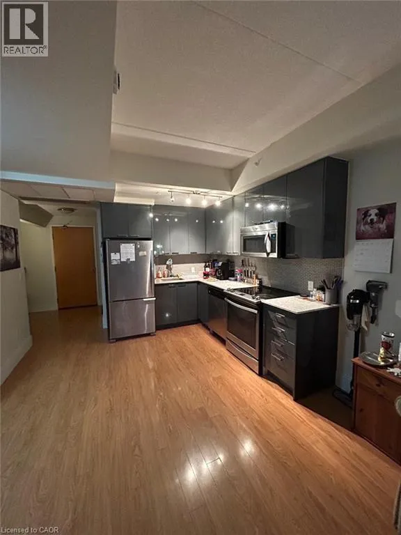 Victoria/ St. Ledger Large one bedroom plus den unit offers high ceilings, good den size can be used as office space, modern laminate flooring, floor to ceiling windows, large balcony, green technology includes geothermal heating and cooling system, stainless steel appliances in the modern kitchen, ensuite laundry, fully-equipped fitness room, luxurious entertainment room and underground parking. Close to downtown kitchener. Ideal for young professionals working near the core. (id:27476)