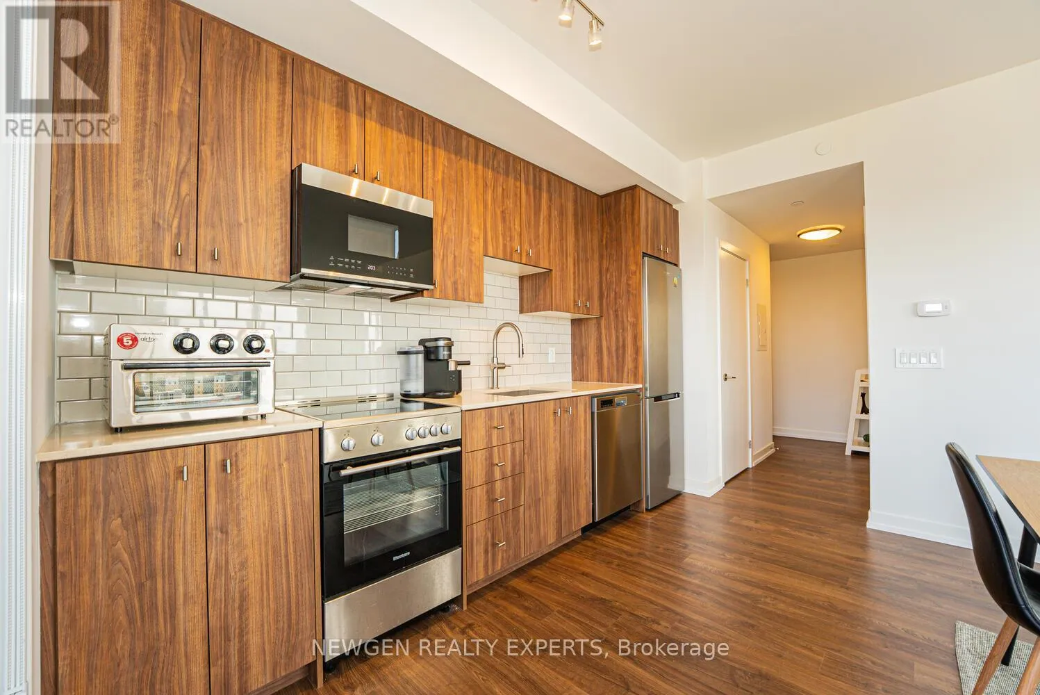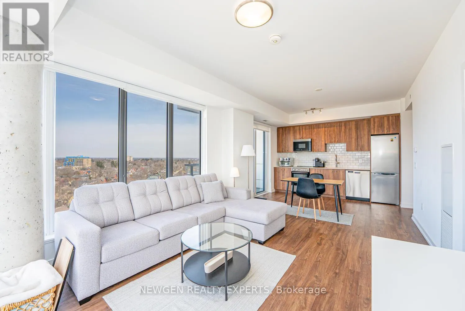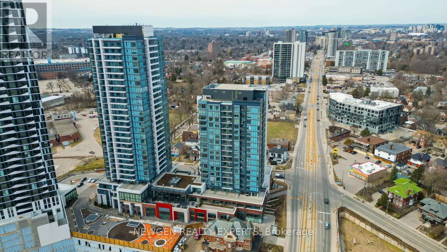 King St. W. & Wellington St. S Step Into This Spectacular Corner Unit Condo In The Highly Desirable Station Park Towers, One Of Waterloo Region's Newest And Most Prestigious Residences, Ideally Located In The Heart Of The Kitchener-Waterloo Downtown Tech And Innovation District. Offering 625 Sq Ft Of Living Space With An Additional 60 Sq Ft Balcony. Total 685 Square Feet, This Modern 1 Bedroom, 1 Bathroom Unit Showcases Elegant & Luxurious Finishes, Keyless Entry & 11Ft. Ceilings Throughout, And Breathtaking Panoramic North And West City Views. The Open Concept Living Space Is Perfect For Entertaining Guests Or Unwinding After A Busy Day. The Kitchen Features Sleek Quartz Countertops, Stainless Steel Appliances, And Sliding Doors To The Private Balcony. The Living Room Boasts Large Floor-To-Ceiling Windows Allowing Lots Natural Light To Flood The Space. The Bedroom Features A Large Closet, Floor to Ceiling Window, And The Bathroom Thoughtfully Designed With Modern Finishes. Additional Features Include In-Suite Laundry And One Underground Parking Space. Amenities include: Two-lane Bowling Alley with lounge, Premier Lounge Area with Bar, Pool Table and Foosball, Private Hydro pool Swim Spa & Hot Tub, Fitness Area with Gym Equipment, Yoga/Pilates Studio & Peloton Studio , Dog Washing Station / Pet Spa, Landscaped Outdoor Terrace with Cabana Seating and BBQs, Concierge Desk for Resident Support, Private bookable Dining Room with Kitchen Appliances, Dining Table and Lounge Chairs, A Smart Parcel Locker System for secure parcel and food delivery service. Located Just Steps Away From The Go Train, Ion Light Rail Transit, Google, Trendy Shops, And Vibrant Nightlife. This Condo Delivers The Perfect Blend Of Style, Comfort, And Urban Convenience. (Heat and Internet Is Included, Hydro and Water not included) (id:27476)