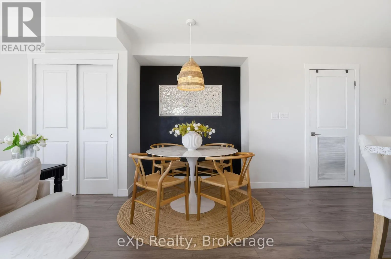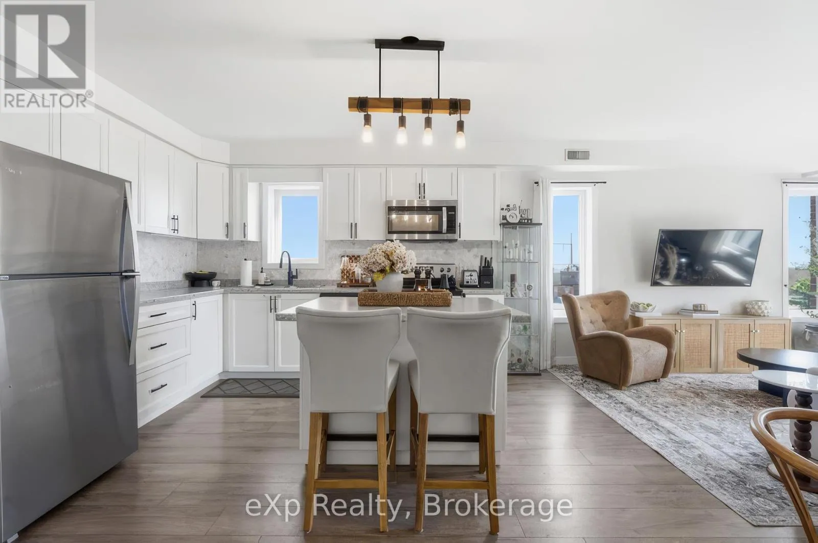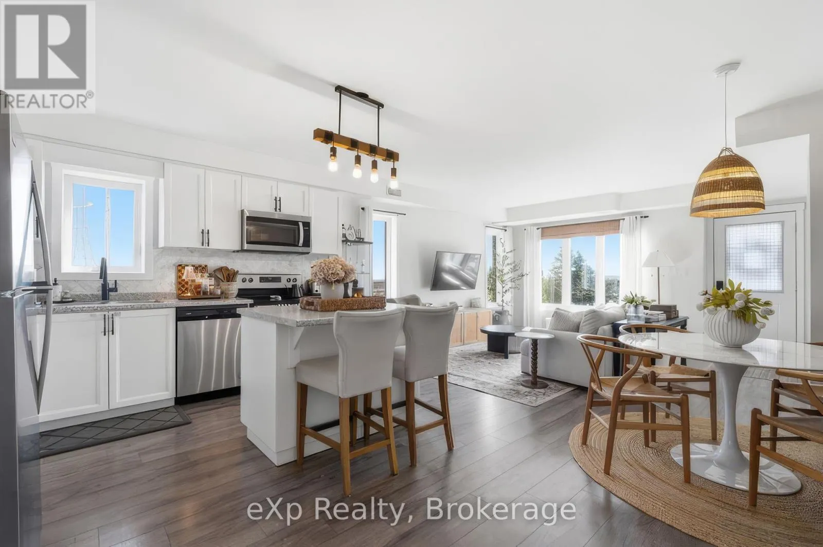 Cross Streets: Parkvale Dr & Huron Rd. ** Directions: Huron Rd to Parkvale Dr to Maitland St to Rochefort St. Welcome to stylish living in one of Kitchener's most desirable Huron communities. This nearly new 2-bedroom, 2 full bathroom condo townhome offers the perfect blend of modern design and everyday comfort. Step inside to a bright, open-concept layout where natural light fills the spacious living and dining area, creating an inviting space to relax or entertain. The kitchen is complete with stainless steel appliances, lots of cabinet space, and an island with breakfast bar. Enjoy carpet free living throughout, with quality laminate flooring in the main areas and bedrooms, complemented by stylish tiles in both bathrooms. The primary bedroom offers a private retreat with a 3 piece ensuite and direct access to a generous covered balcony-perfect for morning coffee or unwinding at the end of the day. A second bedroom and full bath provides flexible space for guests, family, or a home office. Additional highlights include a full-size in-suite laundry, one dedicated parking space, and ample visitor parking. Located just steps from parks, trails, and green space, including RBJ Schlegel Park and Huron Natural Area. Close to schools, shopping, and Conestoga College, this home also offers quick access to Highways 7/8 and 401 for easy commuting. (id:27476)