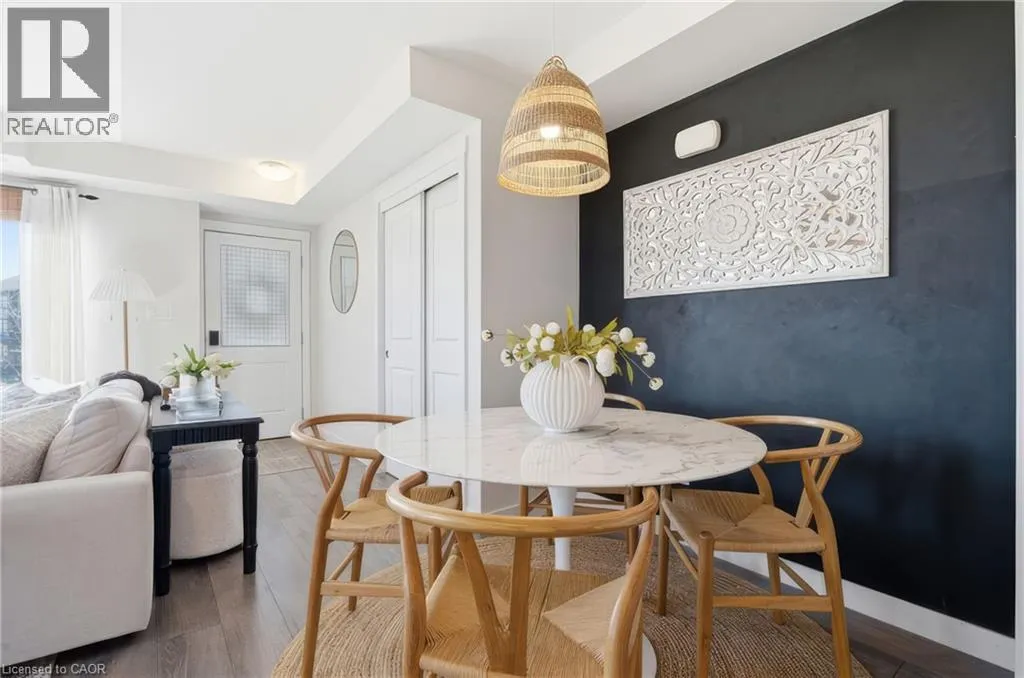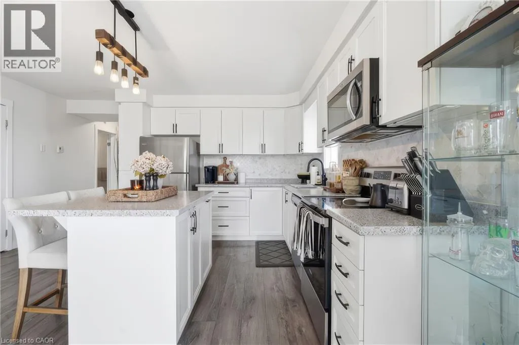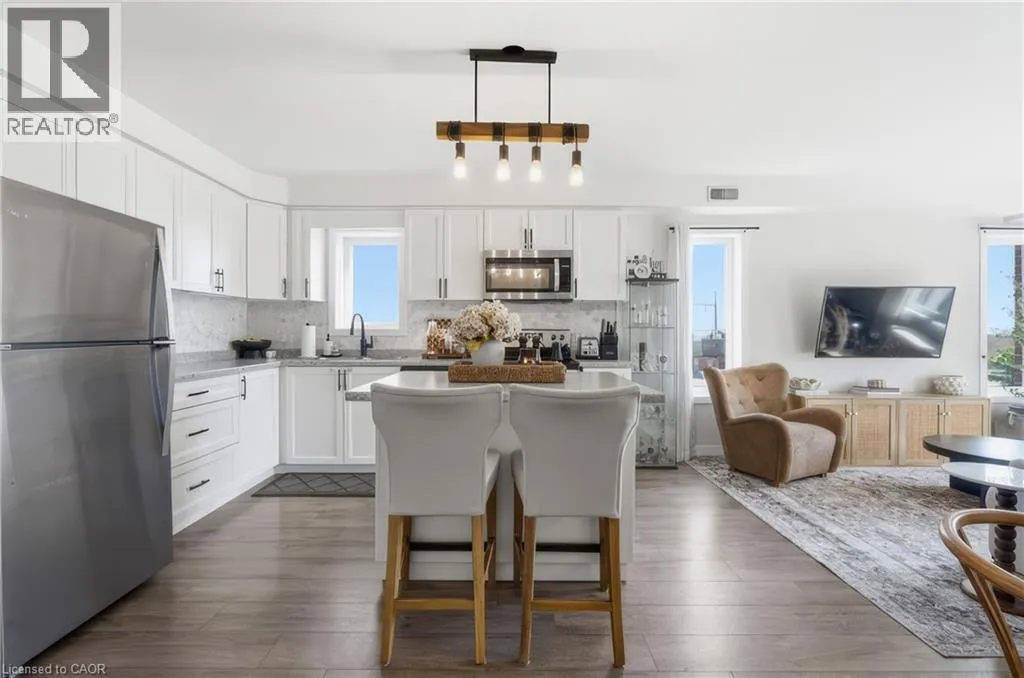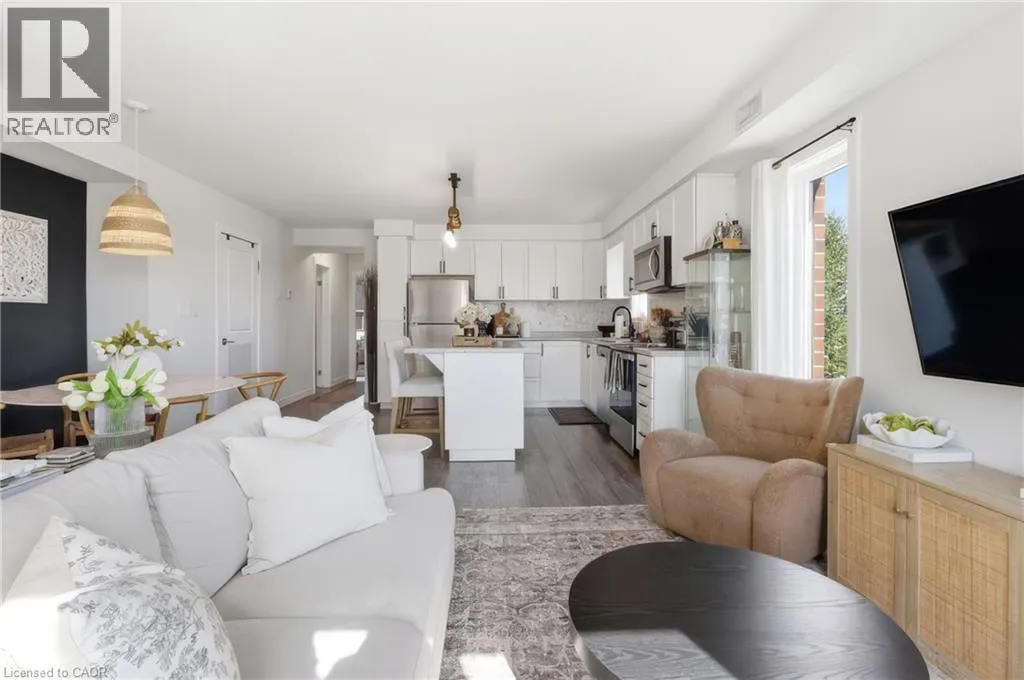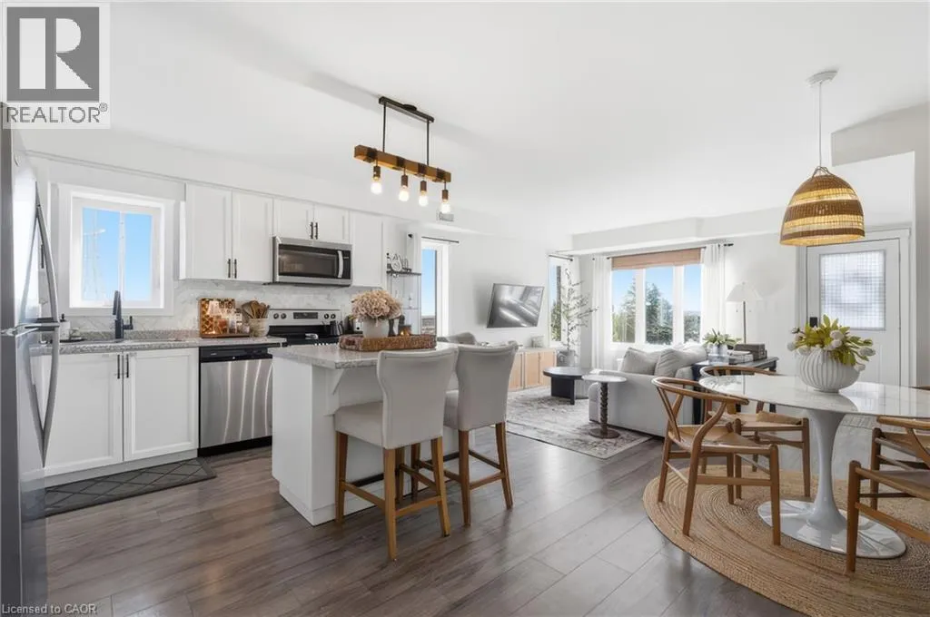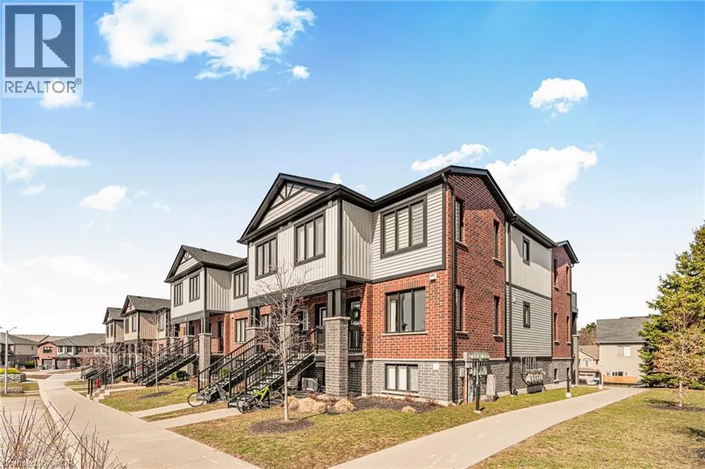Huron Rd to Parkvale Dr to Maitland St to Rochefort St Welcome to stylish living in one of Kitchener's most desirable Huron communities. This nearly new 2-bedroom, 2 full bathroom condo townhome offers the perfect blend of modern design and everyday comfort. Step inside to a bright, open-concept layout where natural light fills the spacious living and dining area, creating an inviting space to relax or entertain. The kitchen is complete with stainless steel appliances, lots of cabinet space, and an island with breakfast bar. Enjoy carpet free living throughout, with quality laminate flooring in the main areas and bedrooms, complemented by stylish tiles in both bathrooms. The primary bedroom offers a private retreat with a 3 piece ensuite and direct access to a generous covered balcony-perfect for morning coffee or unwinding at the end of the day. A second bedroom and full bath provides flexible space for guests, family, or a home office. Additional highlights include a full-size in-suite laundry, one dedicated parking space, and ample visitor parking. Located just steps from parks, trails, and green space, including RBJ Schlegel Park and Huron Natural Area. Close to schools, shopping, and Conestoga College, this home also offers quick access to Highways 7/8 and 401 for easy commuting. (id:27476)