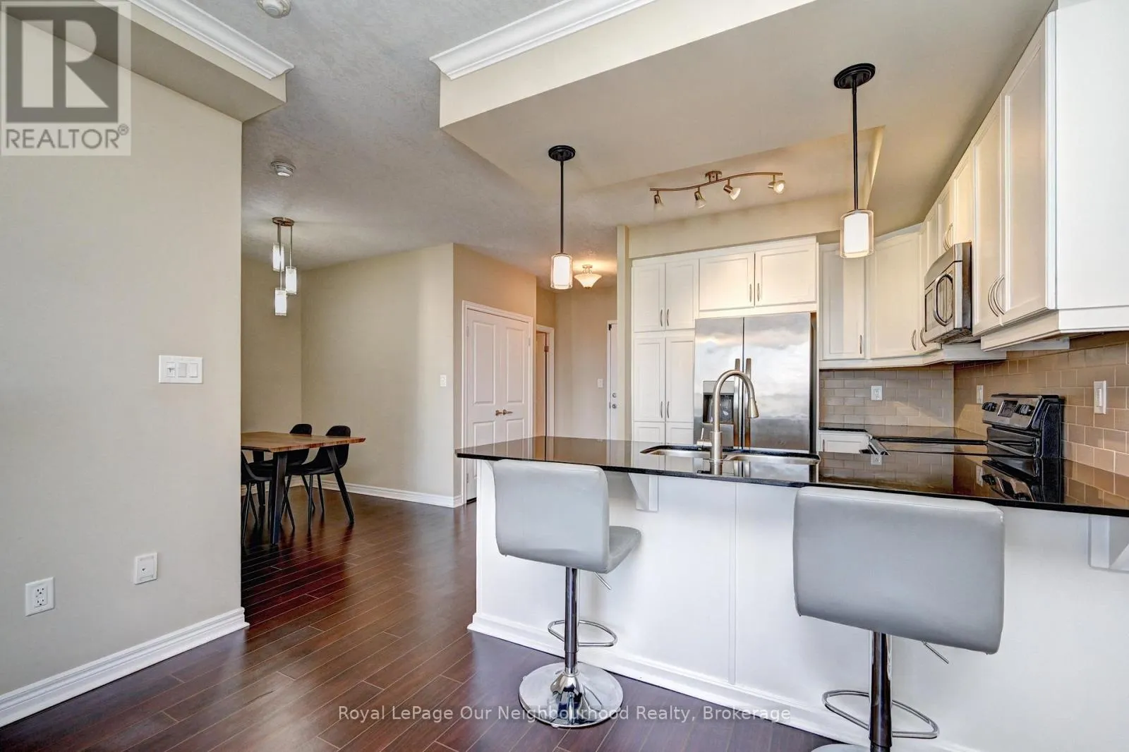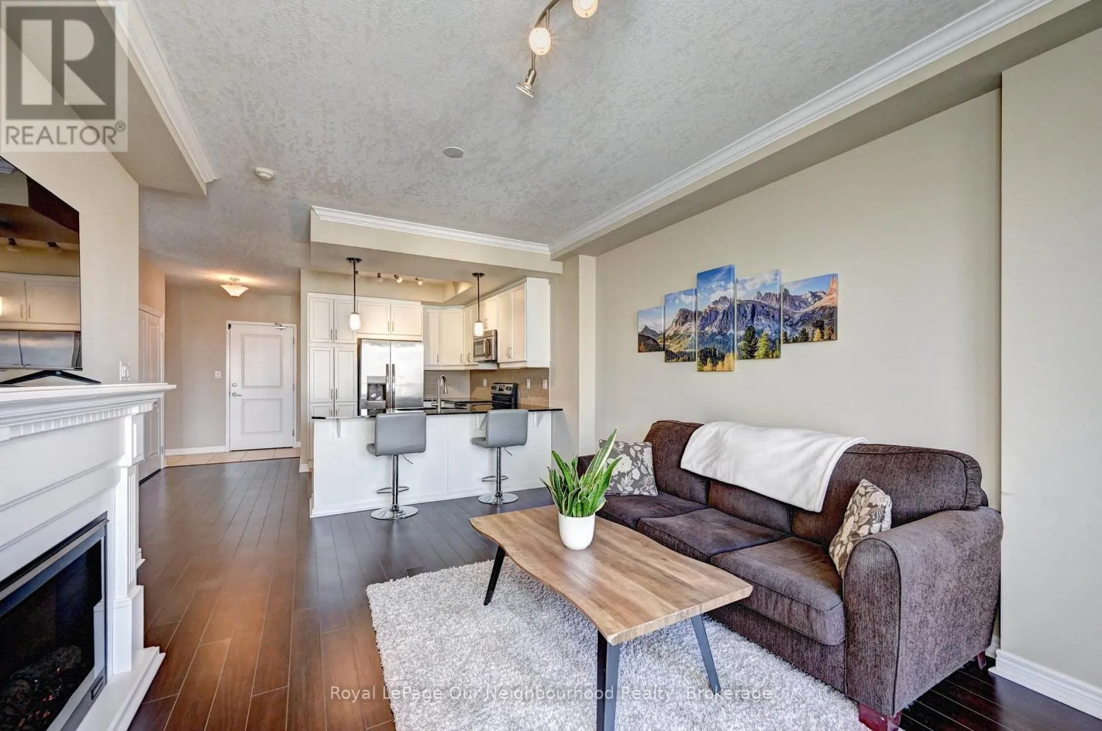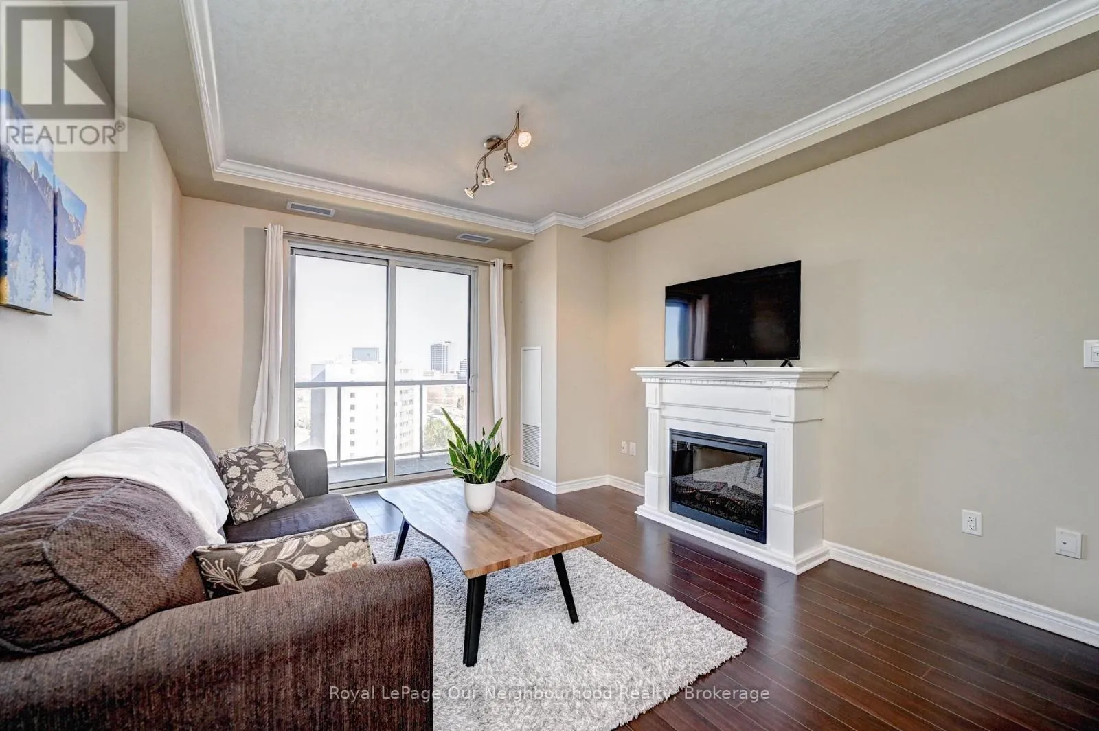 Cross Streets: Belmont Village. ** Directions: Glasgow. Discover modern, urban living in this stunning TOP-FLOOR 1-bedroom + den condo, offering over 750 square feet of bright, open-concept living space. Featuring 9-foot ceilings, an electric fireplace, in-suite laundry, a walk-in shower, and high-end finishes throughout, this home blends comfort and style effortlessly. The updated kitchen boasts granite countertops, stainless steel appliances, ample counter space, and a breakfast bar-perfect for everyday living or entertaining. The oversized living area provides plenty of room to relax, while the versatile den is ideal for a work-from-home setup or additional dining space. Step outside onto your private DOUBLE BALCONY with northwest exposure and enjoy panoramic sunset views. Perfect for morning coffee, evening wine, or hosting BBQs with friends and family. The building offers an array of amenities, including a billiards/games room, theatre room, party room, outdoor BBQ patio, gym, library, guest suite, and ample visitor parking. Located in the heart of Belmont Village, you're just steps from restaurants, bars, boutique shops, and the Iron Horse Trail. The unit owns one COVERED PARKING space, with a second space currently rented and potential to continue. The low condo fees include heat, water, and A/C. Don't miss your chance to experience this exceptional condo book your private showing today! (id:27476)