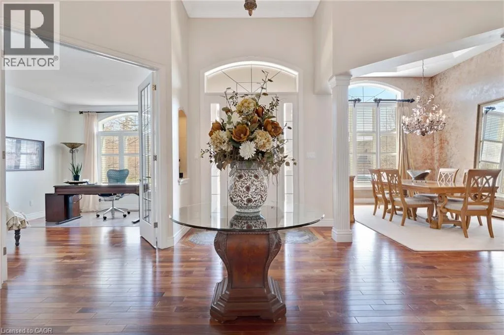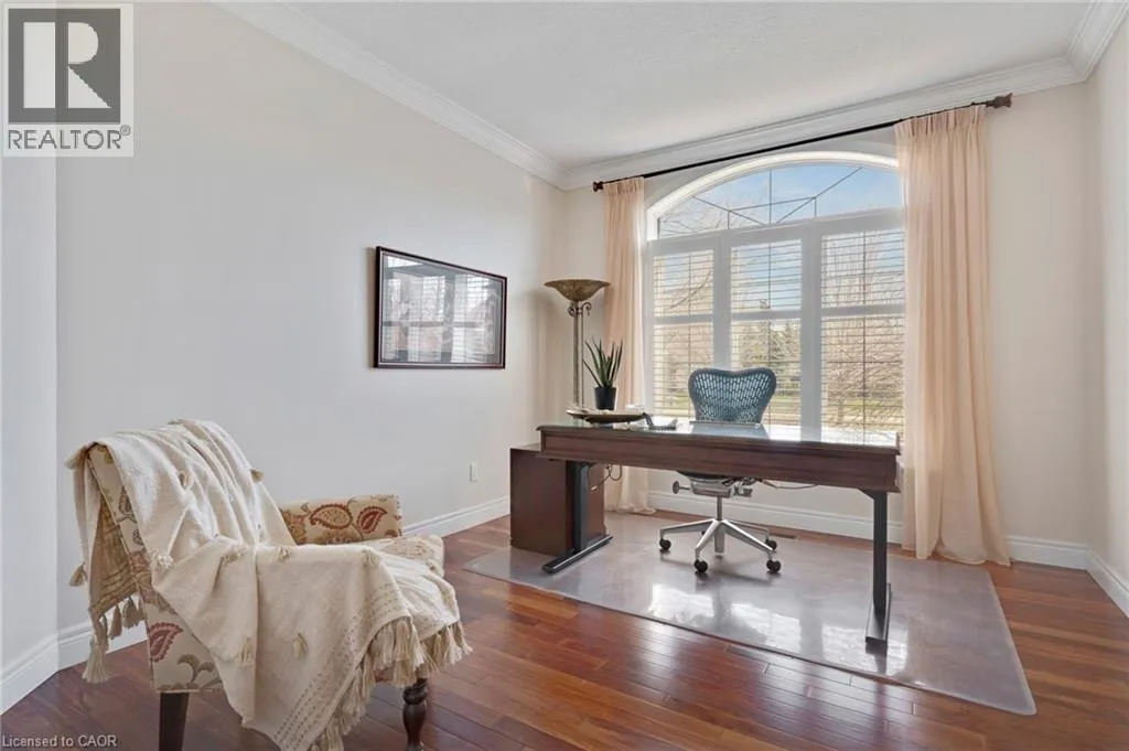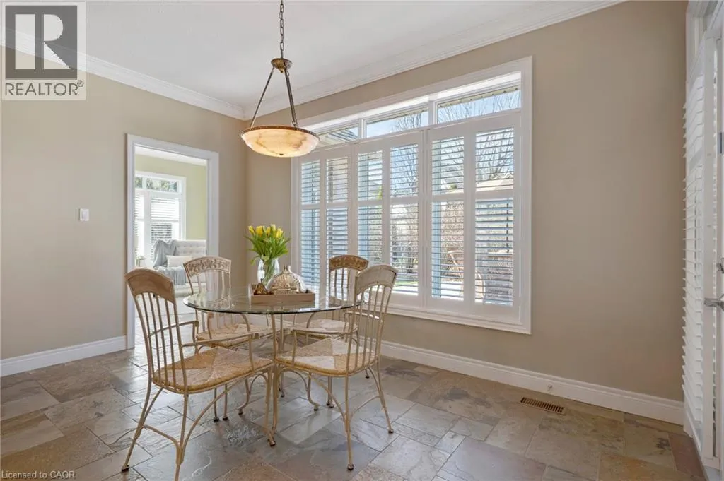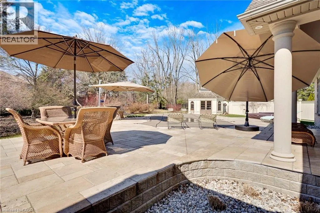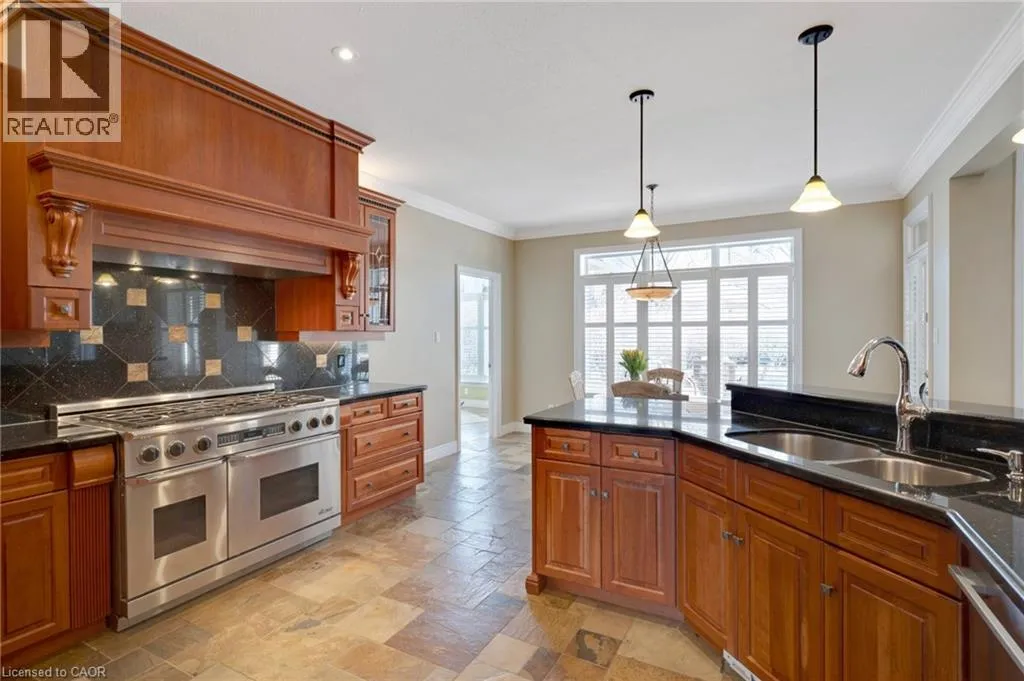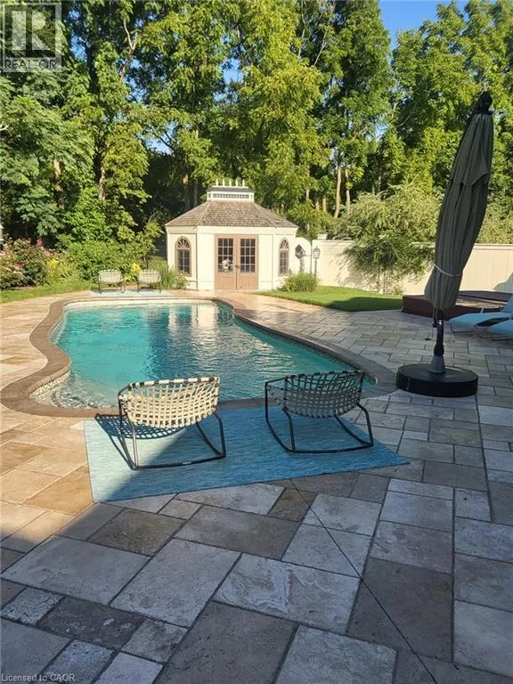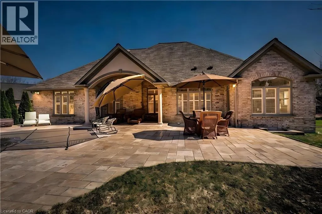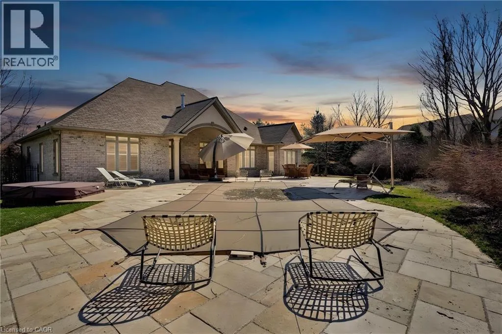 Doon Village Rd to Oregon Crt Located in the highly sought-after Doon Village area, this spacious bungalow is tucked away on an exclusive private court with just six homes, offering a quiet setting surrounded by mature trees and scenic walking trails. Set on a fully landscaped pie shaped lot of over 0.6 acres, the property provides exceptional privacy along with convenient access to amenities, Conestoga College, and Highway 401. With over 5,400 square feet of total living space, this home offers a well-designed layout with room for a variety of living arrangements. The main floor features an open and welcoming foyer, leading into bright principal rooms finished with hardwood floors, slate tile, 9-foot ceilings, and California shutters throughout. A large living room with gas fireplace anchors the space, complemented by a separate home office and a formal dining room with a built-in servery. The kitchen is both spacious and functional, equipped with high-end appliances including a six-burner gas range, and an eat-in area that opens to a sunroom overlooking the backyard. The main level includes three well-sized bedrooms, including a large primary suite set privately with a walk-in closet and a 5-piece ensuite. The fully finished lower level adds even more versatility, featuring two additional bedrooms, an oversized bathroom, a recreation room, home gym, playroom, and a sitting area/ office with rough-in for a wet bar. With direct access from the garage, this level is well suited for extended family or multi-generational living. Outside, the backyard offers a private retreat with an in-ground pool, patio, and hot tub, all surrounded by mature landscaping. A rare opportunity to own a well-appointed home in a quiet, established pocket of Doon. (id:27476)