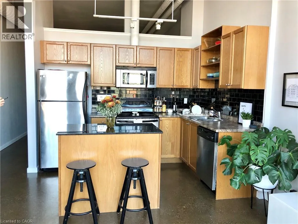 Parking Lot Access Off of Victoria St N or Francis St Location, Location, Location! This 1 bed + den/1 bath Penthouse Suite in the Historic Kaufman Lofts is awaiting it's new owner. Offering up contemporary living with 13 Foot ceilings, exposed pipes/duct work, polished concrete floors, an abundance of floor-to-ceiling windows and a private terrace. With an open concept design including a large kitchen with island open to a spacious living room great for entertaining guests, or a fantastic place to unwind and relax. A large bedroom, 4 piece updated bathroom and den/office/second bedroom round out the living space with the added convenience of in-suite laundry and storage closet. This unit includes 1 parking space and 1 owned locker. With incredible amenities, such as a roof-top patio and party room, and prime urban convenience, sitting right in the heart of Downtown Kitchener mere steps to the tech community (Tannery, Google, Vidyard, Atomic, Sunlife, School of Pharmacy, and countless other starts-ups), and everything it has to offer (LRT, shopping, restaurants, caféâs, Victoria Park and more.) Donât miss your chance to own this spectacular loft with incredible views, located at the historic Kaufman Lofts, and situated right in the heart of the âinnovation districtâ of Downtown Kitchener! (id:27476)
