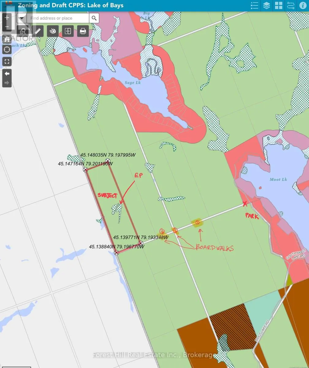 Cross Streets: Muskoka Road 117 and Moot Lake Road. ** Directions: Muskoka Rd 117 to the trailhead off Moot Lake Road, then walk in, snowshoe or ATV on a concession line (unopen road allowance). Wilderness and wildlife enthusiasts take note of this unique and special parcel of land in Muskoka, if you seek absolute tranquility and oneness with nature and away from it all! This maturely forested 68-acre area of land is an off-grid sanctuary of serenity, located approximately .8 mile from Moot Lake Road, where access is by way of foot, ATV and/or snowmobile/snowshoe on an unopen road allowance or concession line that is 66 feet wide ...that results in a heavily discounted price. The trek over a man-made nature trail is quite scenic and adventuresome with short sections that cross marshy wetlands that use an ingenious log corduroy pathway. Evidence of wildlife abounds in all directions, including a vast variety of birds, white-tailed deer, moose and much more! The subject land's interior boasts a captivating water system that includes a large pond and stream network, enormous beaver dam, meandering stream and granite rock bluffs and outcrops of every imaginable kind, many sections of which are covered in smooth, vibrant green moss. The forest floor is covered in patches of flowers, mushrooms and flora & fauna of so many descriptions! This sort of opportunity doesn't come along often! An oasis of intrigue awaits to enliven your senses! Drive north to Muskoka, only 2 hours from the GTA, to embrace this mecca of Muskoka's finest woodlands, located off Highway 117 between Bracebridge and Baysville. There is also a groomed network of trails for ATVing and snowmobiling in the not-too-distant vicinity that goes for miles and miles in all directions. Keep your boat at a nearby marina on Lake of Bays! Visit nearby towns for great restaurants, shopping and other cool amenities. It's all here, at a fraction of the cost of similar acreage parcels with 4-season road access! Come see for yourself why the likes of Indiana Jones would be envious! (id:27476)