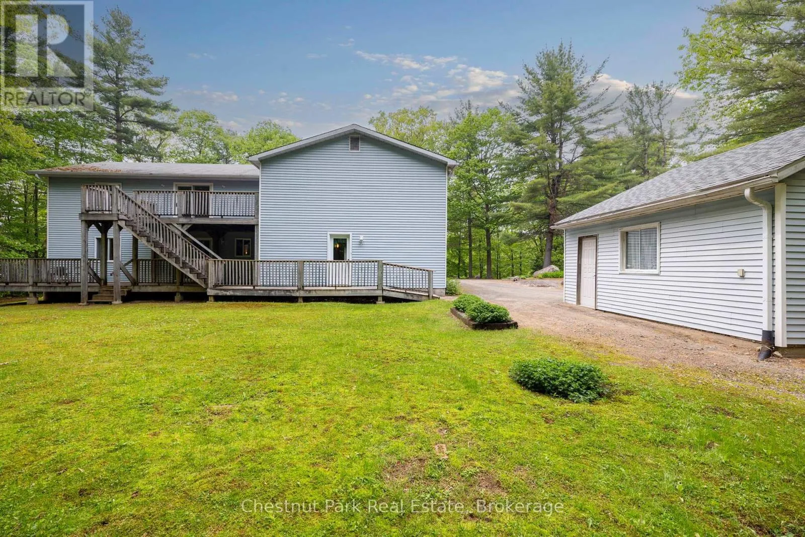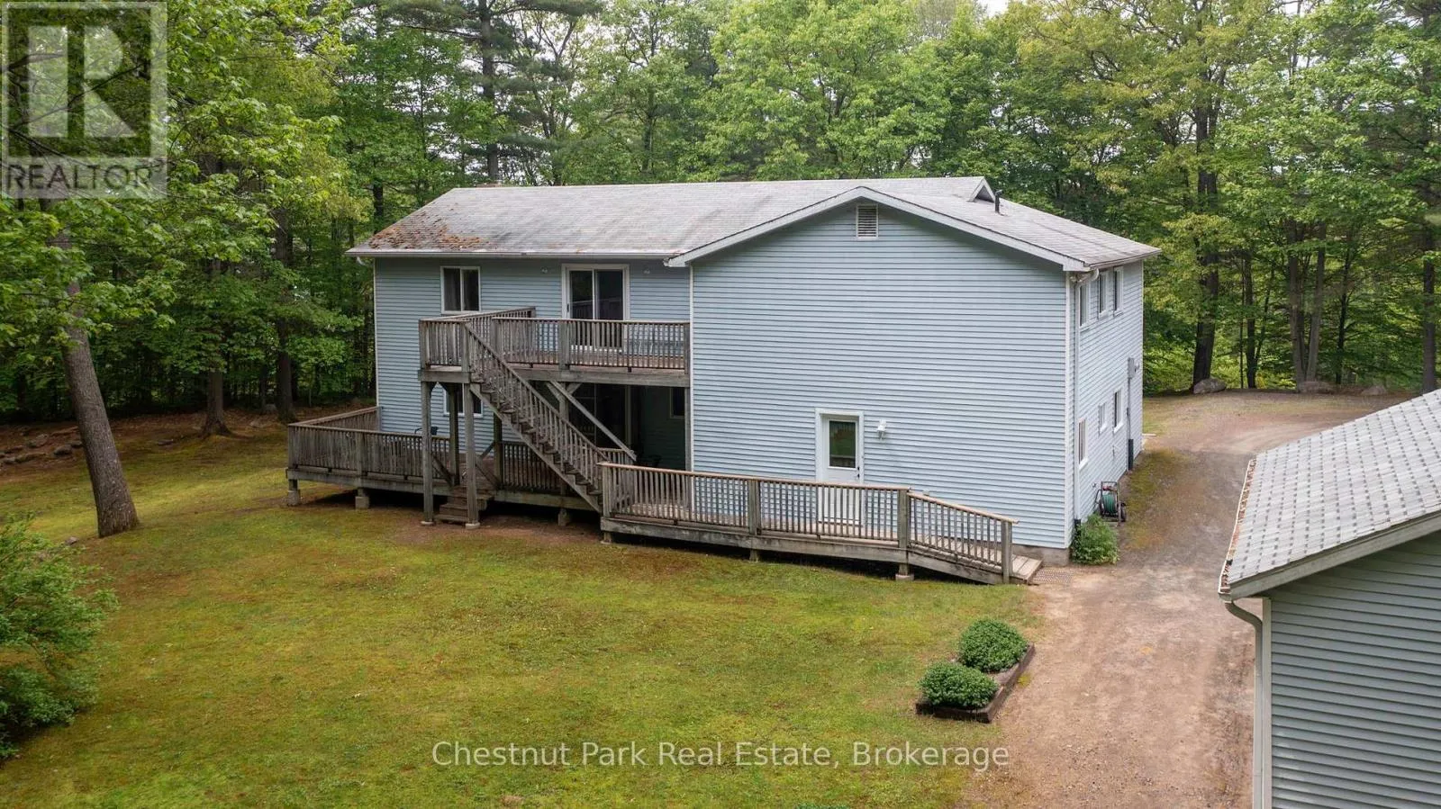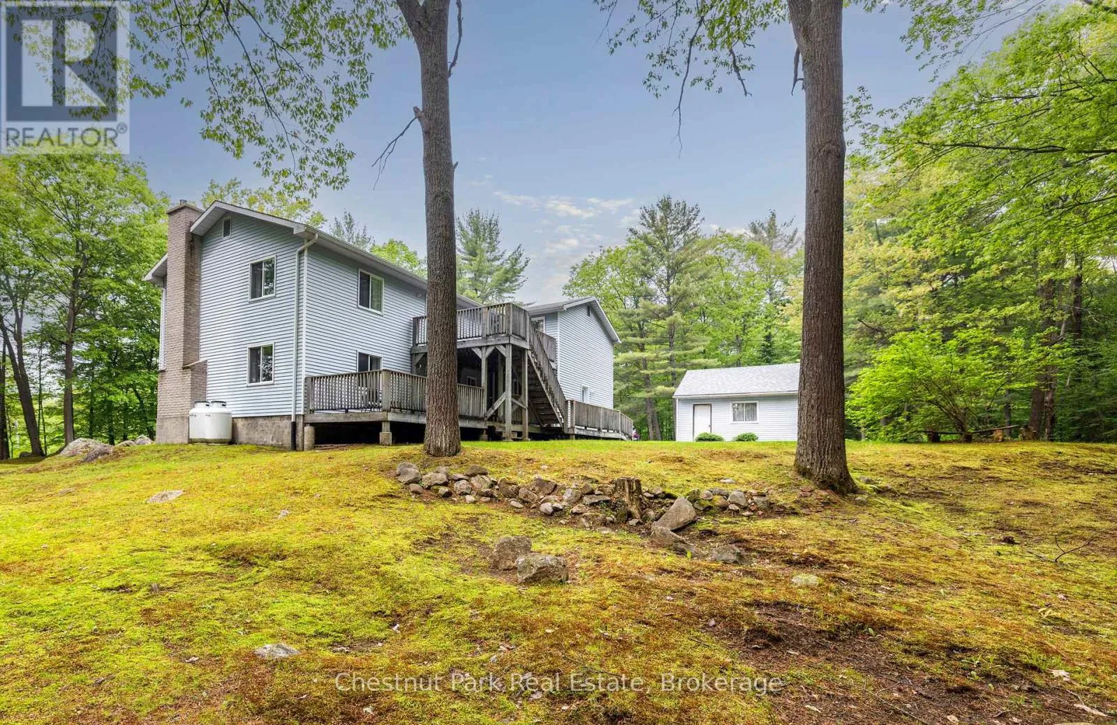 Cross Streets: Brunel Rd and Muskoka Rd 117. ** Directions: Take Brunel Rd north towards Huntsville, property is on your right. Spacious, serene, and surrounded by Muskoka beauty - this is where your next chapter begins. Set on 8.86 acres of peaceful forest and wildlife, this 3275 sq ft year-round home offers space, seclusion, and scenery in equal measure. A large circular driveway winds through the trees to a detached 2-car garage, tool shed, and sprawling yard, framed by tall pines and lush hardwoods. Expansive upper and lower decks invite you to relax outdoors and soak in the tranquil surroundings - moose, deer, and foxes are your closest neighbours. With Lower Schufelt Lake just steps from the edge of the property and picturesque Tooke Lake across the road, you'll feel immersed in nature at every turn. Step inside to a spacious foyer that opens into a warm and inviting den with a cozy propane fireplace framed by brick, and a generous formal dining room with lovely backyard views. The galley-style kitchen offers ample counter space and a sunny eat-in area, perfect for casual meals and morning coffee. Also on the main floor: a 3-piece bathroom, laundry room, furnace room, mudroom off the back entrance, and a 5th bedroom that could easily be used as a home office, gym, or guest space. Upstairs, a wide staircase leads to a bright and airy living area - an ideal flex space for a media room, playroom, or studio with walkout to the upper deck. Four bedrooms include a large primary with a beautifully updated 3-piece ensuite and walk-in shower, a huge second bedroom with his-and-hers closets, and two more generously sized bedrooms. A 4-piece bathroom rounds out the upper level. This expansive lot offers a world of possibilities. With flexible zoning and generous space, it's ready to adapt to your ideas whether that means multi-generational living, income potential, a home-based business, future guest bunkie or studio, trails and gardens, or simply room to spread out and explore. Live, work, create, or grow with this property - it welcomes it all. All just 5 minutes from the heart of Baysville. (id:27476)