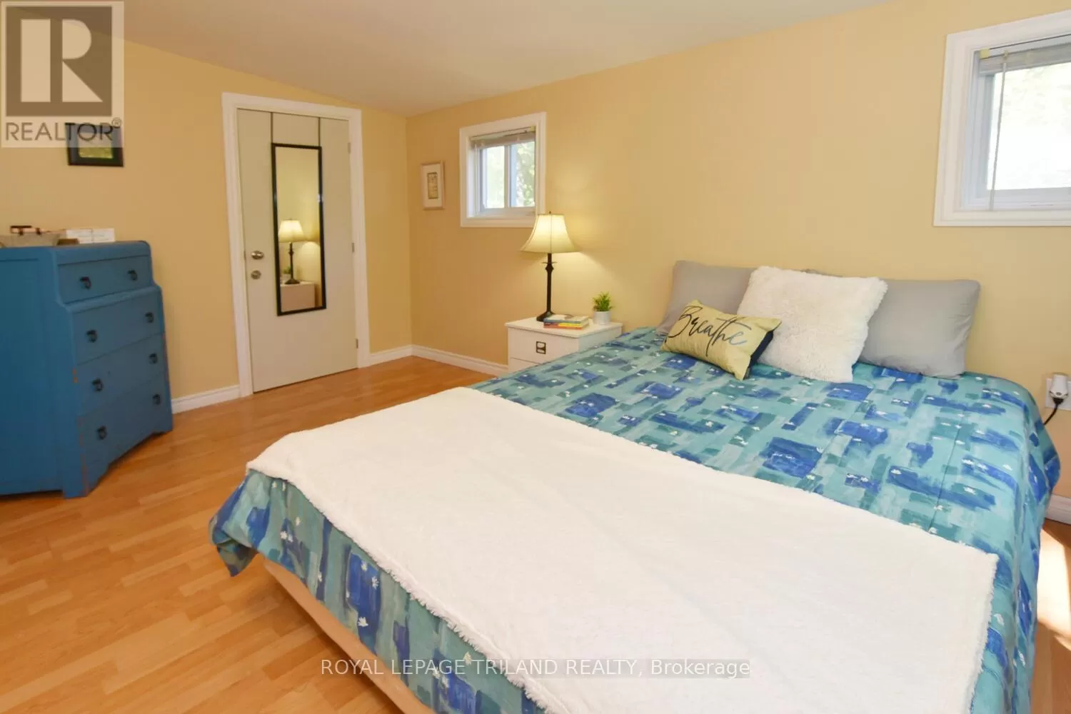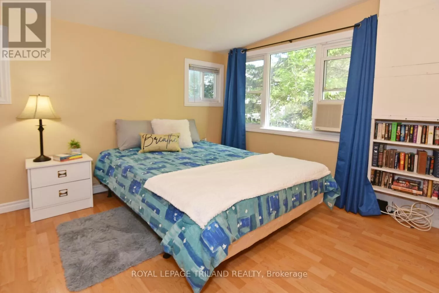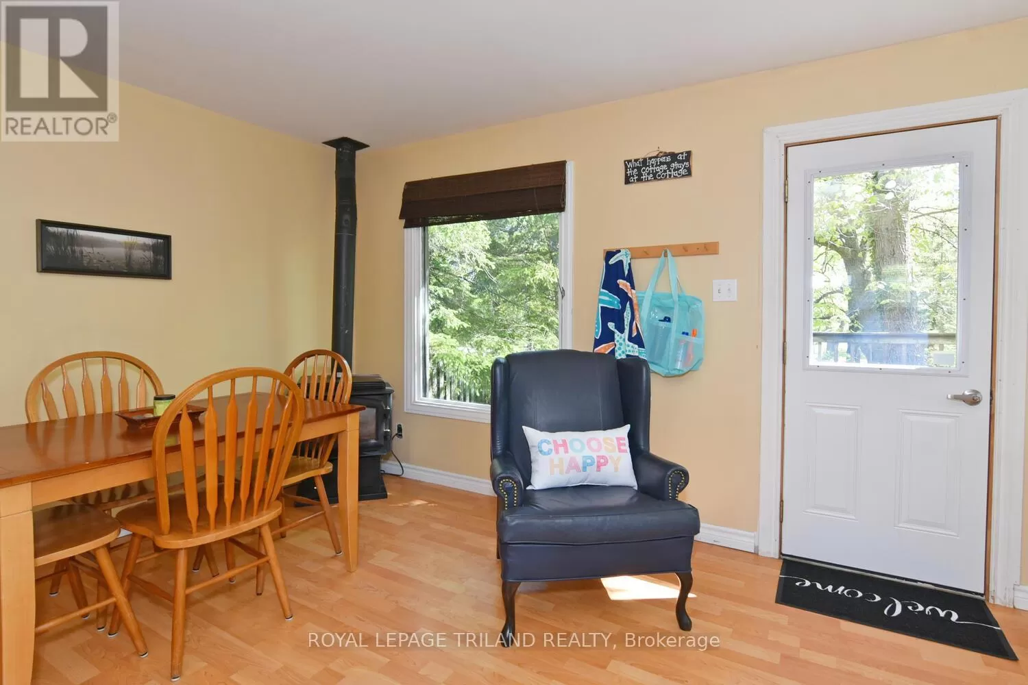 Herbert St. & Katharine St. Cozy 2 bedroom cottage in Port Franks. Open-concept kitchen, dining and living area with a gas fireplace. White wooden cabinets in the kitchen. Laminate & linoleum floors throughout. Lots of windows allow an abundance of natural light. Bright primary bedroom with large window and walk-in closet. Decent sized 2nd bedroom with window and closet. Bathroom with shower. Front deck surrounded by large trees is great for entertaining. Shed out back. Deed for docking included. Close to river, walking trails, marinas, golf, restaurants and the beach! (id:27476)
