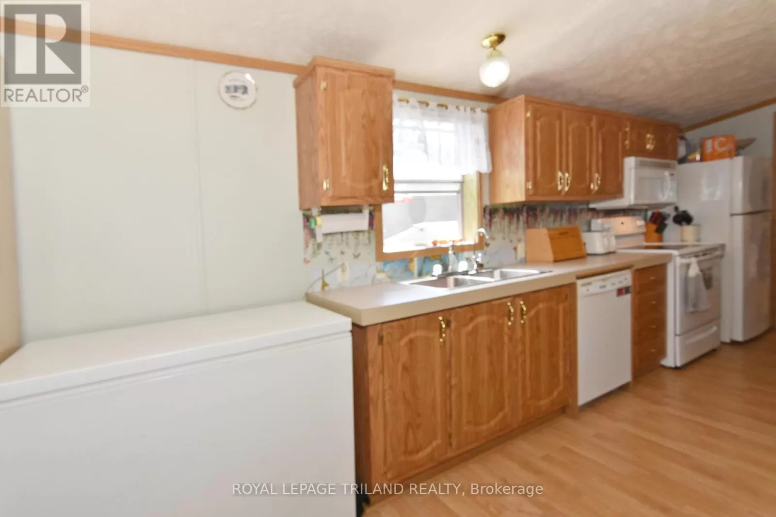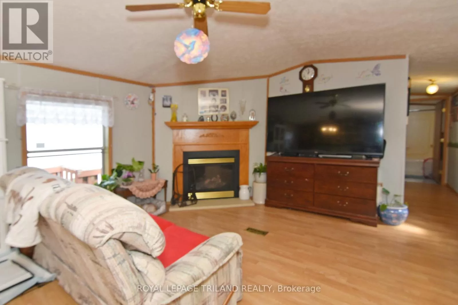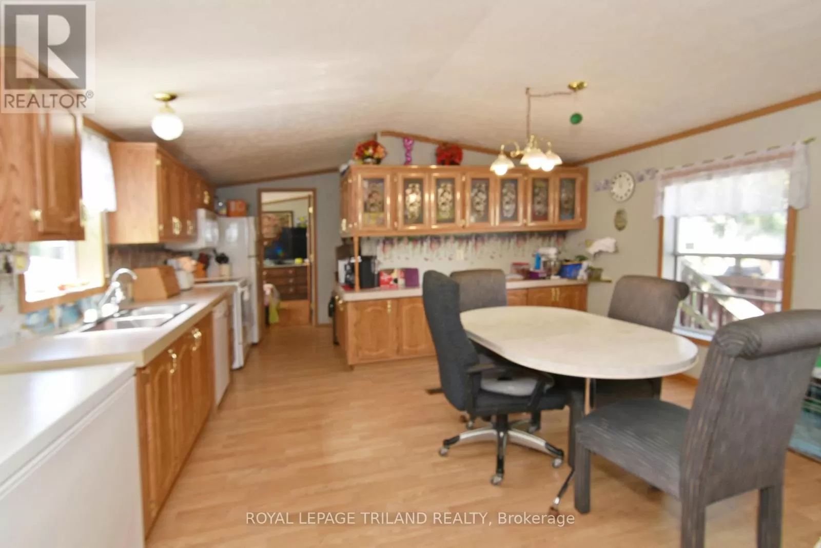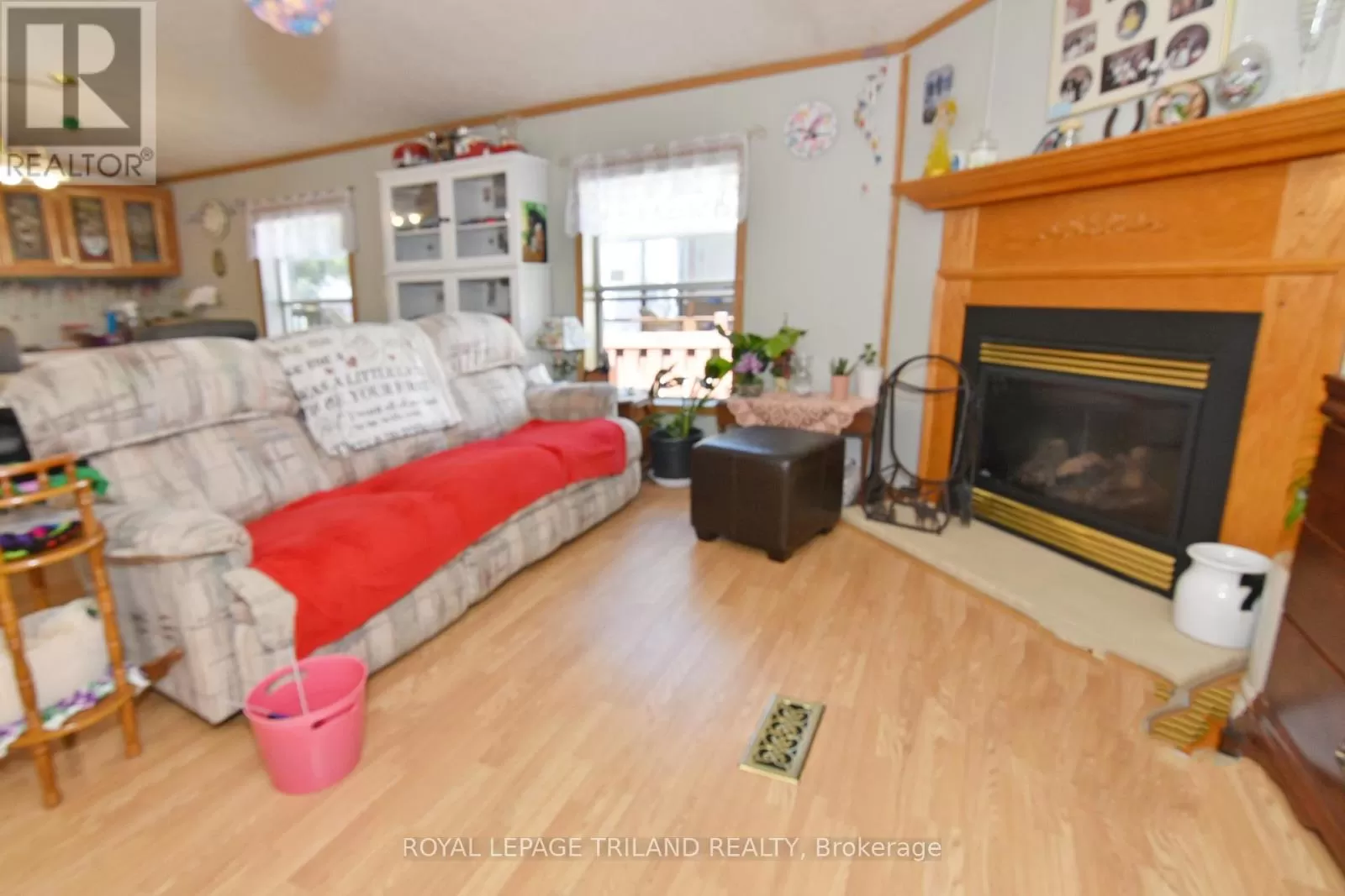 Cross Streets: HWY 21 & IPPERWASH ROAD. ** Directions: HWY 21 TO IPPERWASH ROAD, TURN LEFT INTO WOODHAVEN PARK. FOUR SEASON - 3 Bedroom / 2 Bath Mobile Home in Woodhaven Resort. Near Ipperwash Beach. Open concept kitchen / dining / living room with vaulted ceiling, laminate floors and propane gas fireplace. Large kitchen has plenty of cupboards and counter space, lots of windows and a Reverse Osmosis water filtration system. Primary bedroom includes 3 piece ensuite with shower and walk in closet. The second & third bedrooms are at the other end of the unit near the 4 piece bathroom with tub/shower. Separate laundry room/mudroom area. Propane furnace & central air. Large wooden deck with gazebo. Shed stays. Stamped concrete driveway. Land lease is $575/month (to be confirmed). Park amenities include inground pool, playground and laundry facilities. Only 50 minutes to London, 40 minutes to Sarnia, 20 minutes to Grand Bend. (id:27476)
