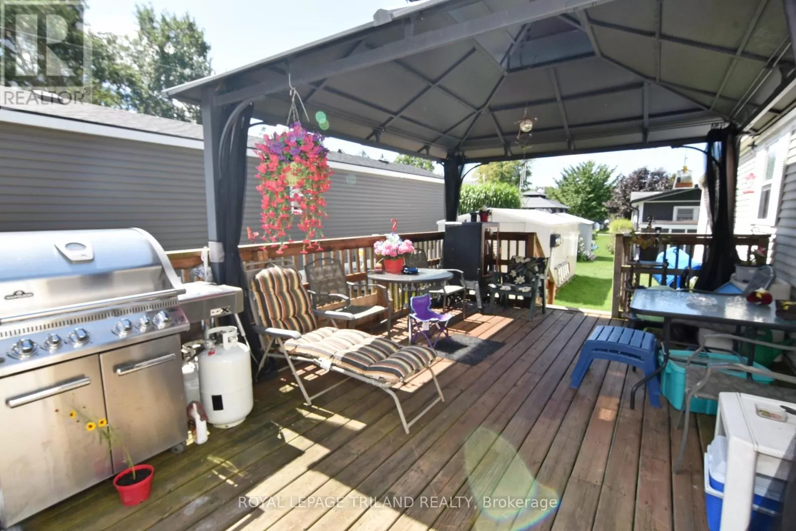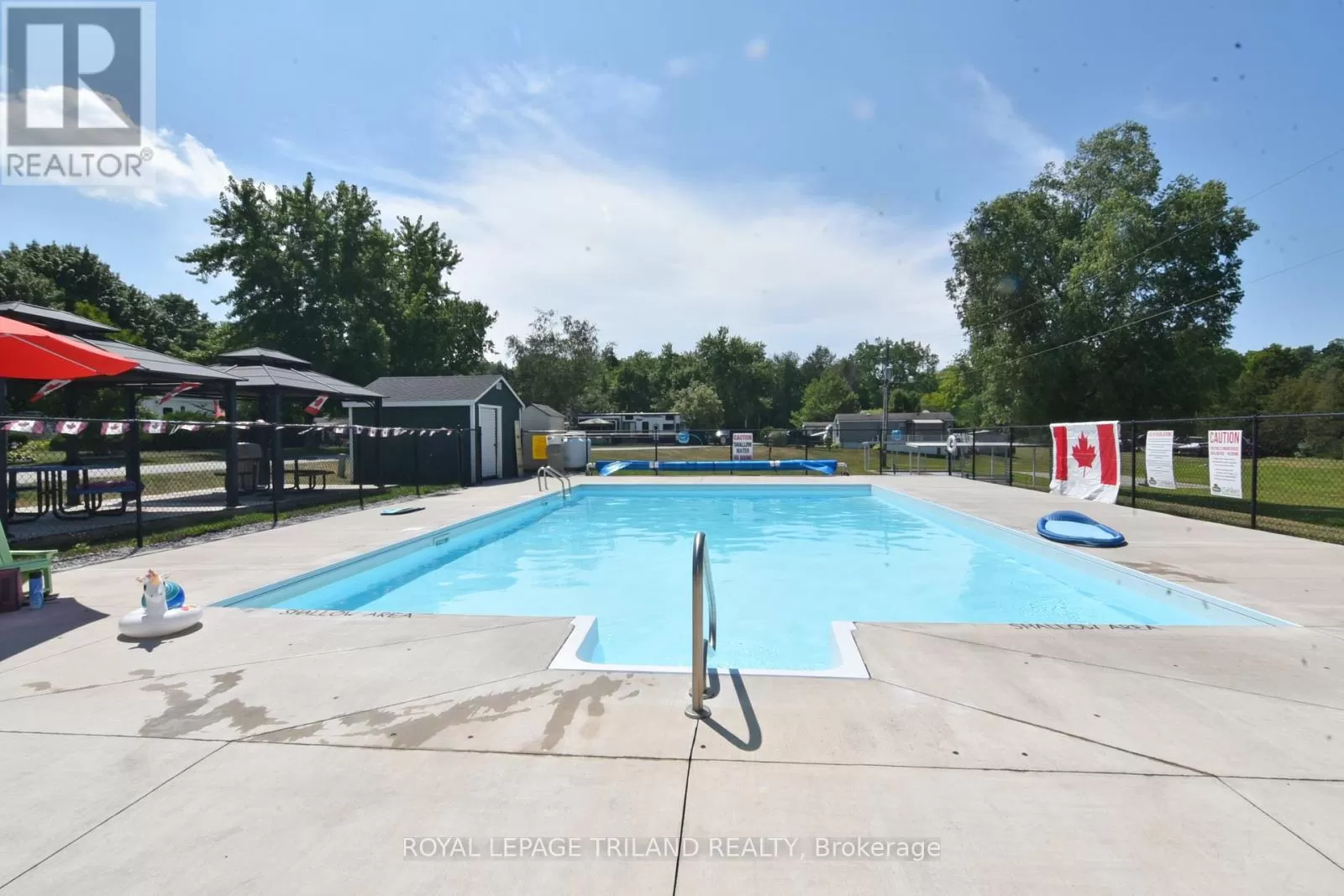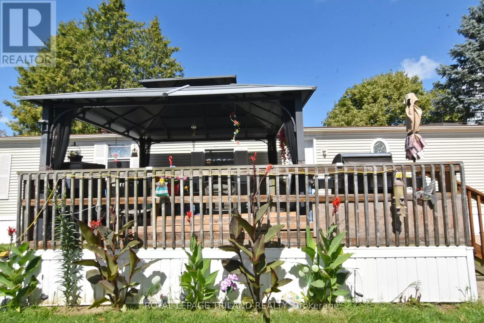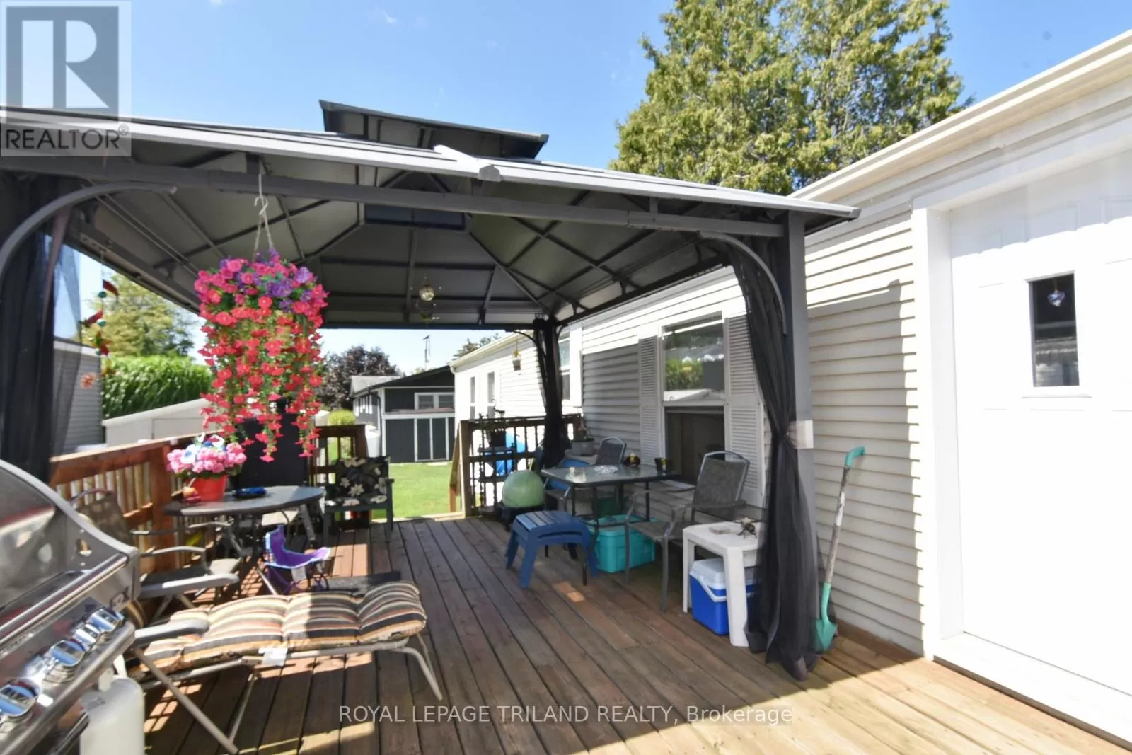 Cross Streets: HWY 21 & IPPERWASH ROAD. ** Directions: HWY 21 TO IPPERWASH ROAD, TURN LEFT INTO WOODHAVEN PARK. FOUR SEASON - 3 Bedroom / 2 Bath Mobile Home in Woodhaven Resort. Near Ipperwash Beach. Open concept kitchen / dining / living room with vaulted ceiling, laminate floors and propane gas fireplace. Large kitchen has plenty of cupboards and counter space, lots of windows and a Reverse Osmosis water filtration system. Primary bedroom includes 3 piece ensuite with shower and walk in closet. The second & third bedrooms are at the other end of the unit near the 4 piece bathroom with tub/shower. Separate laundry room/mudroom area. Propane furnace & central air. Large wooden deck with gazebo. Shed stays. Stamped concrete driveway. Land lease is $575/month (to be confirmed). Park amenities include inground pool, playground and laundry facilities. Only 50 minutes to London, 40 minutes to Sarnia, 20 minutes to Grand Bend. (id:27476)