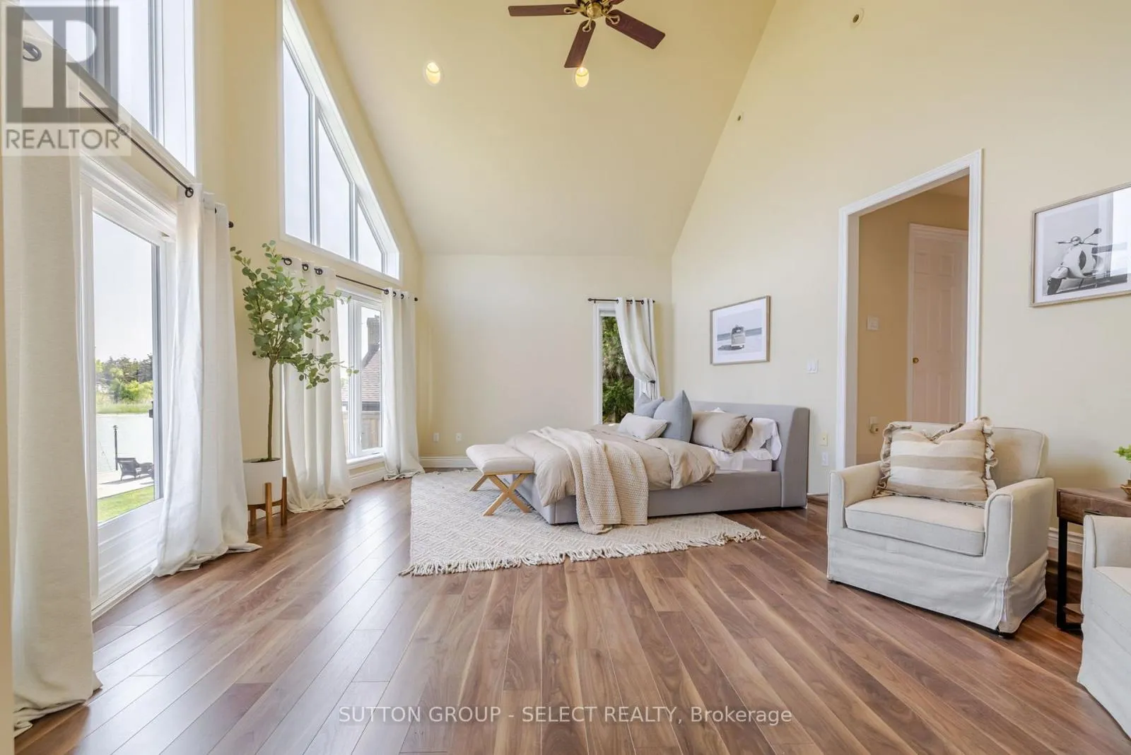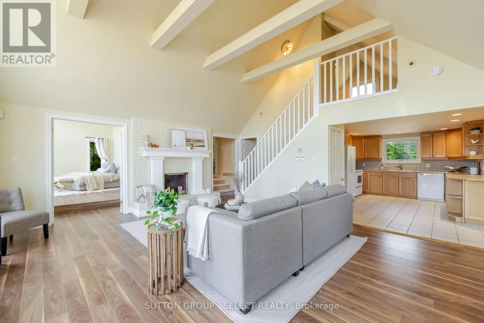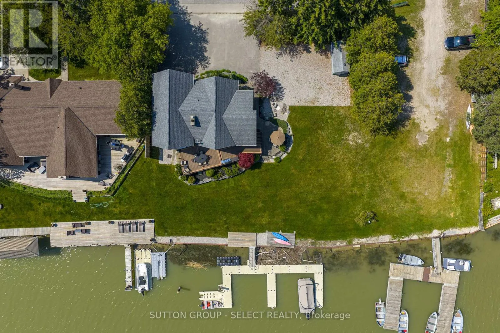 Riverside Dr & Outer Dr Famous for its epic sunsets and views, this stunning 2 storey double A-Frame waterfront retreat is one of a kind! Located in Port Franks on the banks of the Ausable River, this stunning property has ample outdoor space, private docks, large quadruple wide stamped concrete driveway with lots of parking and a useful attached 2 car garage. The open concept main floor is spacious and inviting with its vaulted ceilings and floor to peak windows providing amazing views and plenty of natural light. The living room is spacious and provides double door access to the back deck area as well as boasting a gorgeous fireplace with exposed brick accent and mantle. The dining room has lots of natural light and vaulted ceiling with a fan. The U-shaped kitchen has plenty of storage and a nice white appliance package. The main floor primary bedroom suite is large and comes equipped with a nice 3-piece ensuite bathroom complete with a private water closet. An additional bedroom, lovely sunroom and an additional 4-piece bathroom complete the main level. The second level has an additional spacious lofted bedroom. The basement has lots of potential to create additional living space. The backyard has a great private deck overlooking the river and views towards the lake, perfect for entertaining and enjoying those great summer nights. Large lot with seawall and private docks! Book your private showing today! (id:27476)