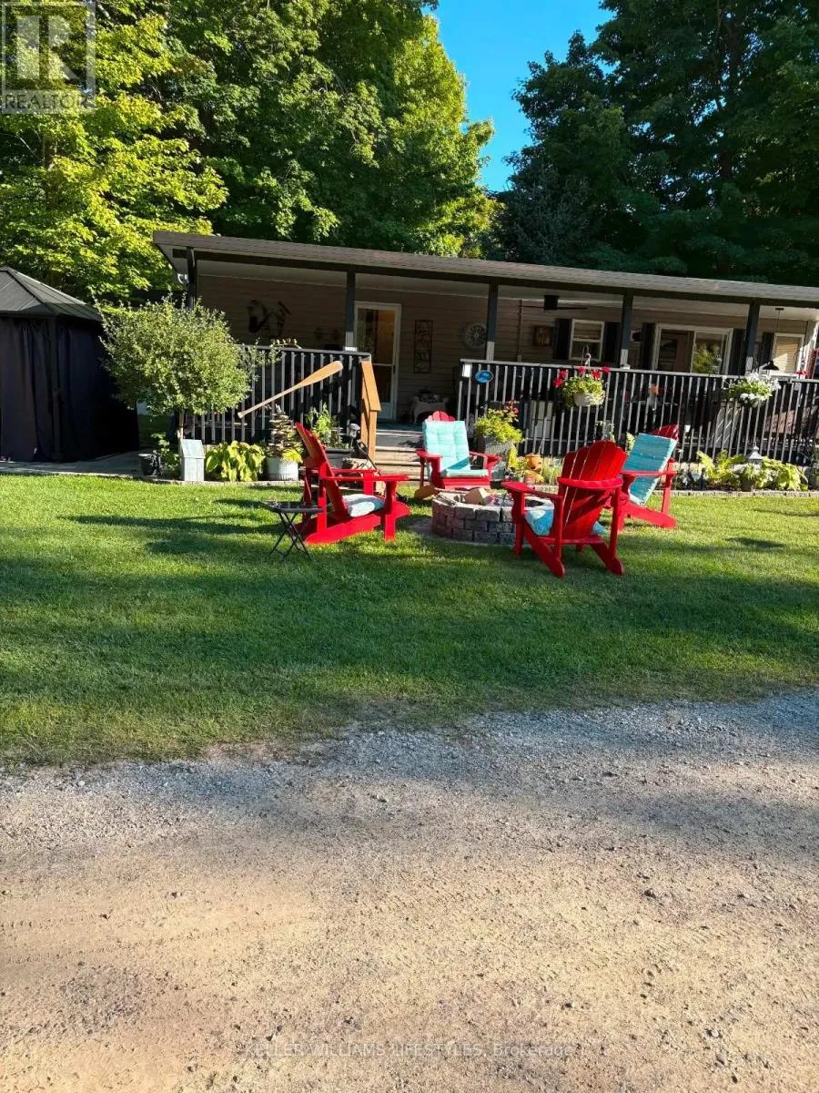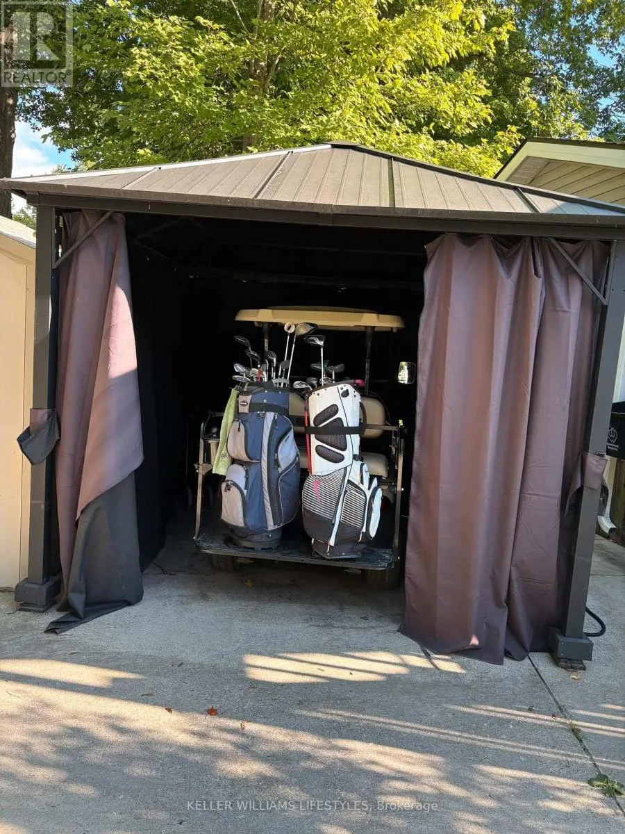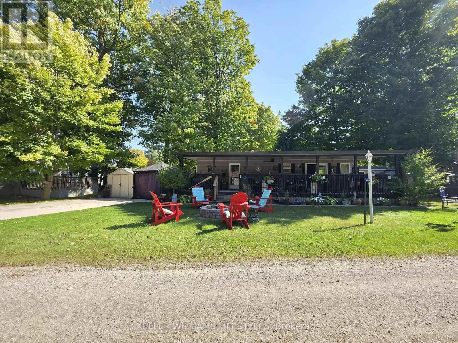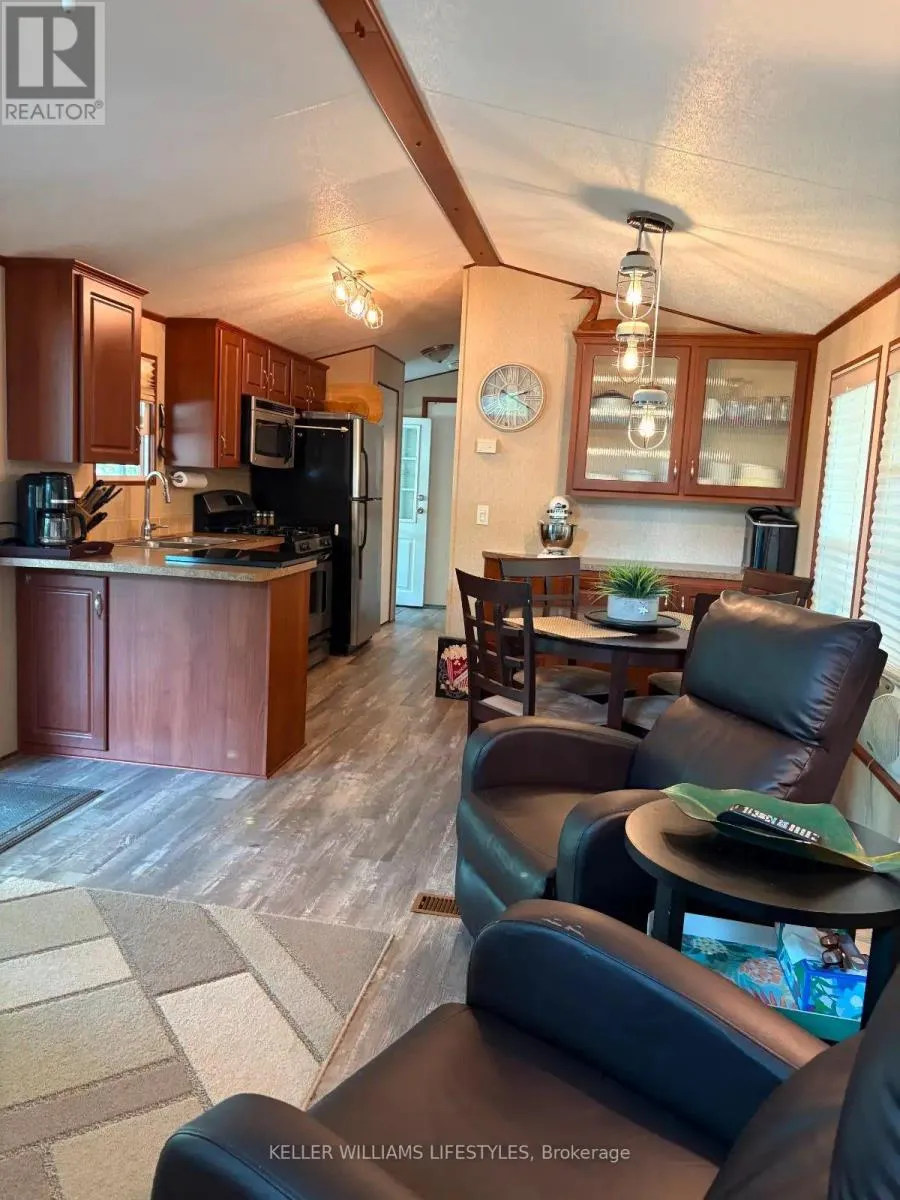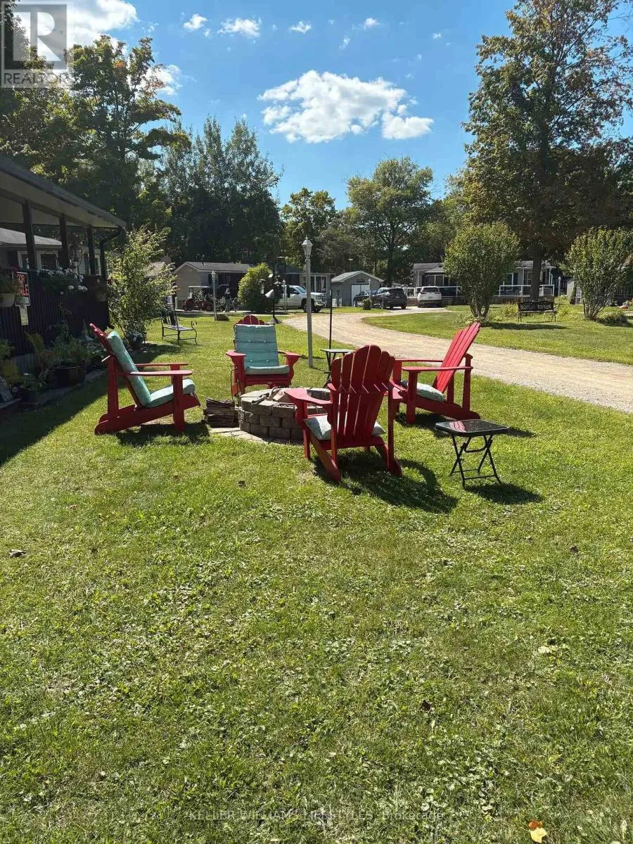 Cross Streets: JJ Area off of the Horseshoe Pits. ** Directions: Our Ponderosa. Just minutes from the beach, and only 30kms to Grand Bend, this charming 2 bedroom, 1 bath park model offers the perfect blend of relaxation and recreation. In Our Ponderosa (a wonderful seasonal resort open May-Oct), nestled on a quiet cul-de-sac with only nine units with generous frontage, you'll enjoy both privacy and community. Step inside to find an open concept layout, creating a bright and spacious feel throughout. The kitchen features black appliances, while the living room is filled with natural light, perfect for entertaining family and friends. This turnkey retreat comes fully furnished, including all bedroom and living room furniture (with a queen size pull out sofa), a 55" TV in the living room, a 42" TV on the deck, and a Weber barbeque. With forced air propane heating and central air, you're sure to be comfortable. Outdoors, the large deck is equipped with over $8,000 worth of premium furniture, including a concrete dining table with six chairs, a sectional, an adjustable coffee/dining table, recliners, and side tables. A custom hard top cover with 4" posts, ceiling fan, and overhead lighting provides comfort and durability, making this 12' wide deck the ideal spot for relaxing or entertaining. Additional features include a double wide concrete driveway and a 10' x 10' curtained gazebo, currently used for golf cart storage. There are many community amenities, with a 9 hole golf course (included in annual fees), pickleball courts, two swimming pools with a water slide, splash pad, mini golf, bounce cushion, and sand volleyball court, ensuring fun for all ages. If you're seeking a summer getaway this move in ready park model at Our Ponderosa has everything you need to start making memories. (id:27476)