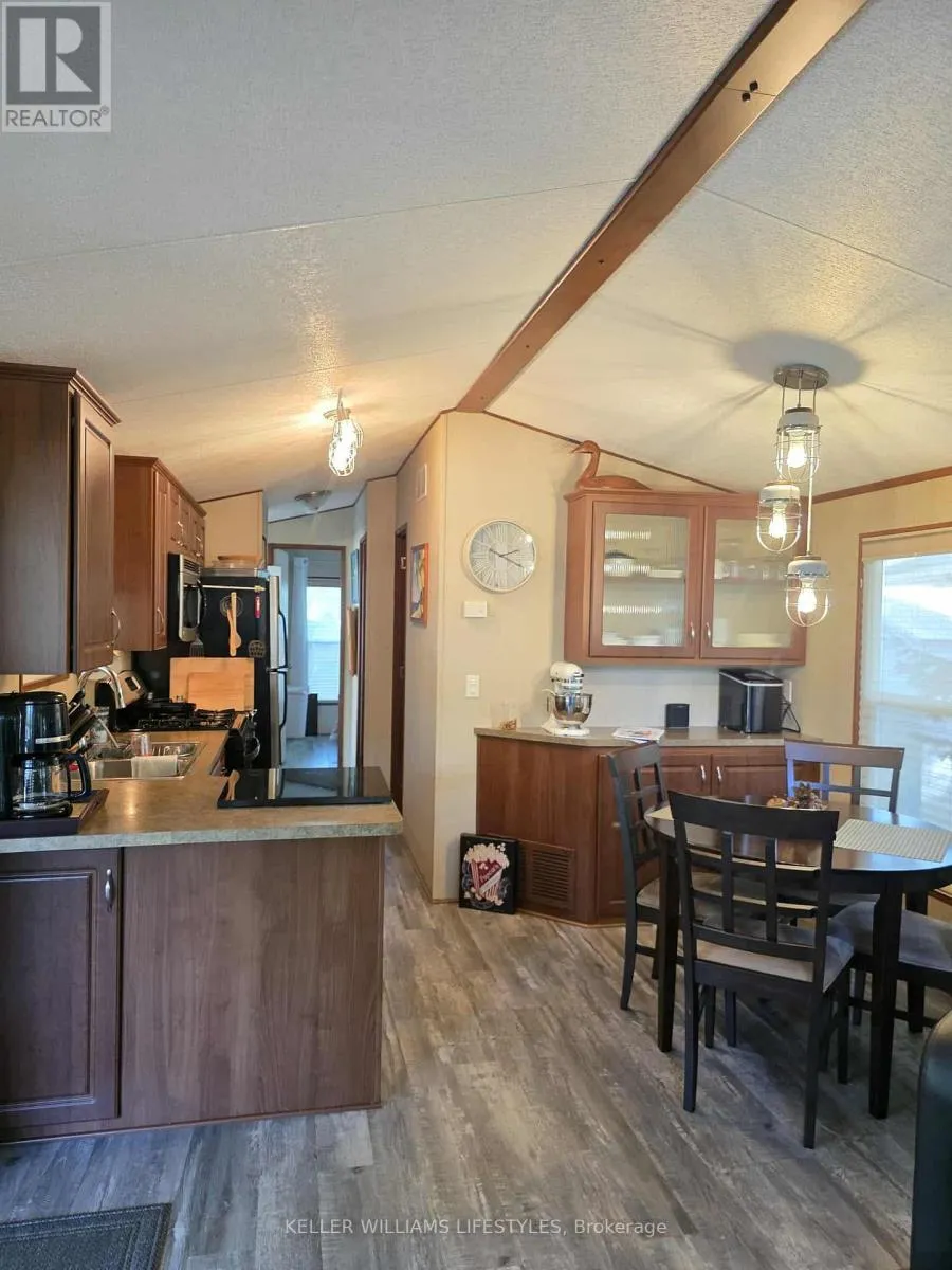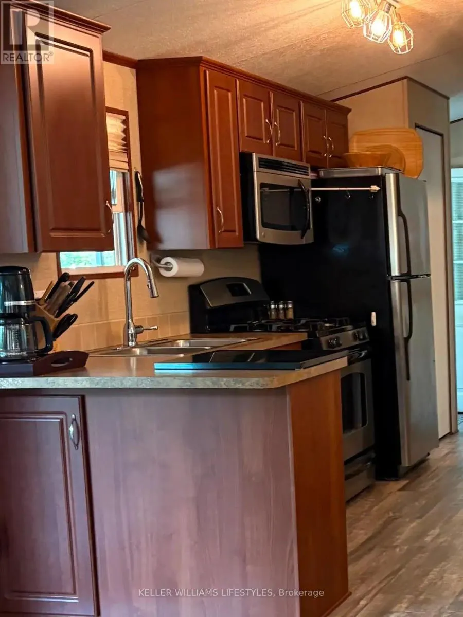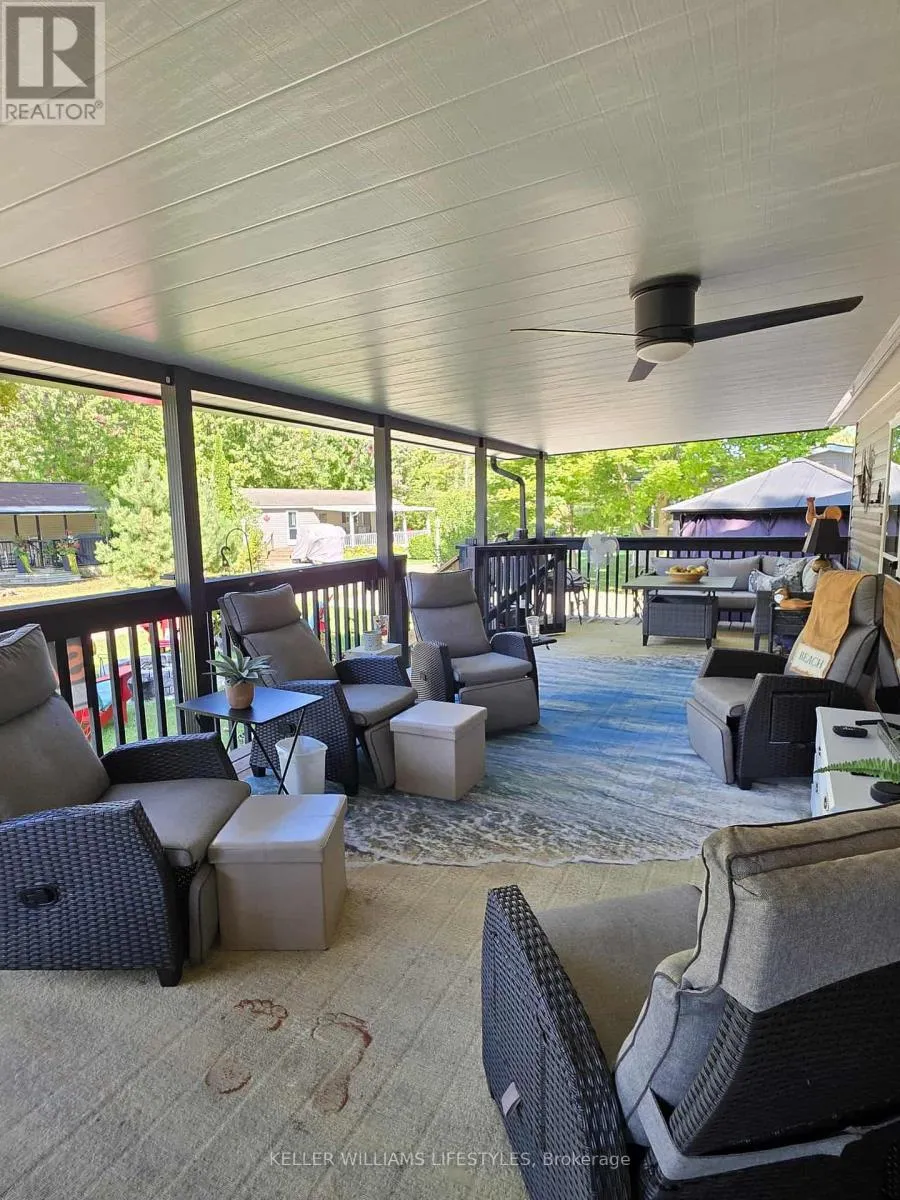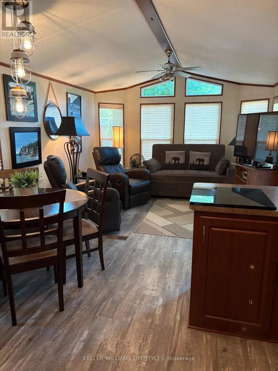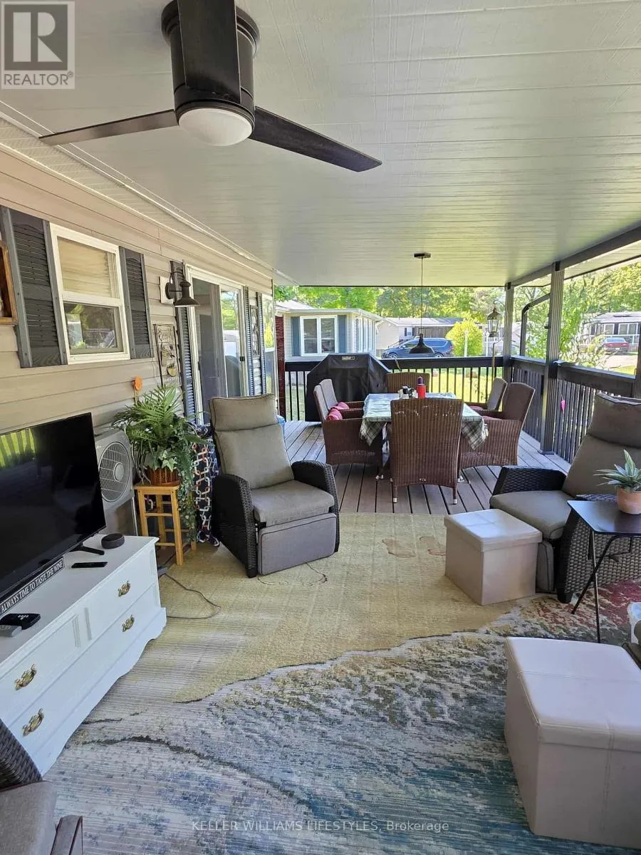 Cross Streets: JJ Area off of the Horseshoe Pits. ** Directions: Our Ponderosa. Just minutes from the beach, and only 30kms to Grand Bend, this charming 2 bedroom, 1 bath park model offers the perfect blend of relaxation and recreation. In Our Ponderosa (a wonderful seasonal resort open May-Oct), nestled on a quiet cul-de-sac with only nine units with generous frontage, you'll enjoy both privacy and community. Step inside to find an open concept layout, creating a bright and spacious feel throughout. The kitchen features black appliances, while the living room is filled with natural light, perfect for entertaining family and friends. This turnkey retreat comes fully furnished, including all bedroom and living room furniture (with a queen size pull out sofa), a 55" TV in the living room, a 42" TV on the deck, and a Weber barbeque. With forced air propane heating and central air, you're sure to be comfortable. Outdoors, the large deck is equipped with over $8,000 worth of premium furniture, including a concrete dining table with six chairs, a sectional, an adjustable coffee/dining table, recliners, and side tables. A custom hard top cover with 4" posts, ceiling fan, and overhead lighting provides comfort and durability, making this 12' wide deck the ideal spot for relaxing or entertaining. Additional features include a double wide concrete driveway and a 10' x 10' curtained gazebo, currently used for golf cart storage. There are many community amenities, with a 9 hole golf course (included in annual fees), pickleball courts, two swimming pools with a water slide, splash pad, mini golf, bounce cushion, and sand volleyball court, ensuring fun for all ages. If you're seeking a summer getaway this move in ready park model at Our Ponderosa has everything you need to start making memories. (id:27476)