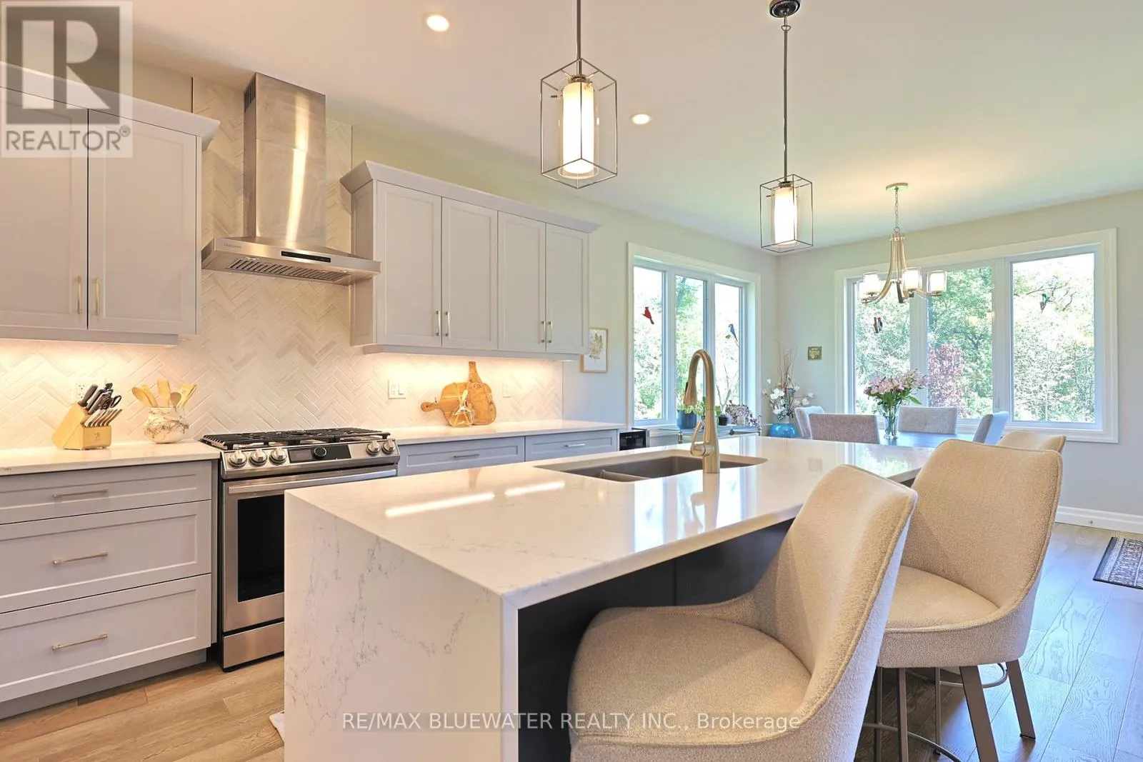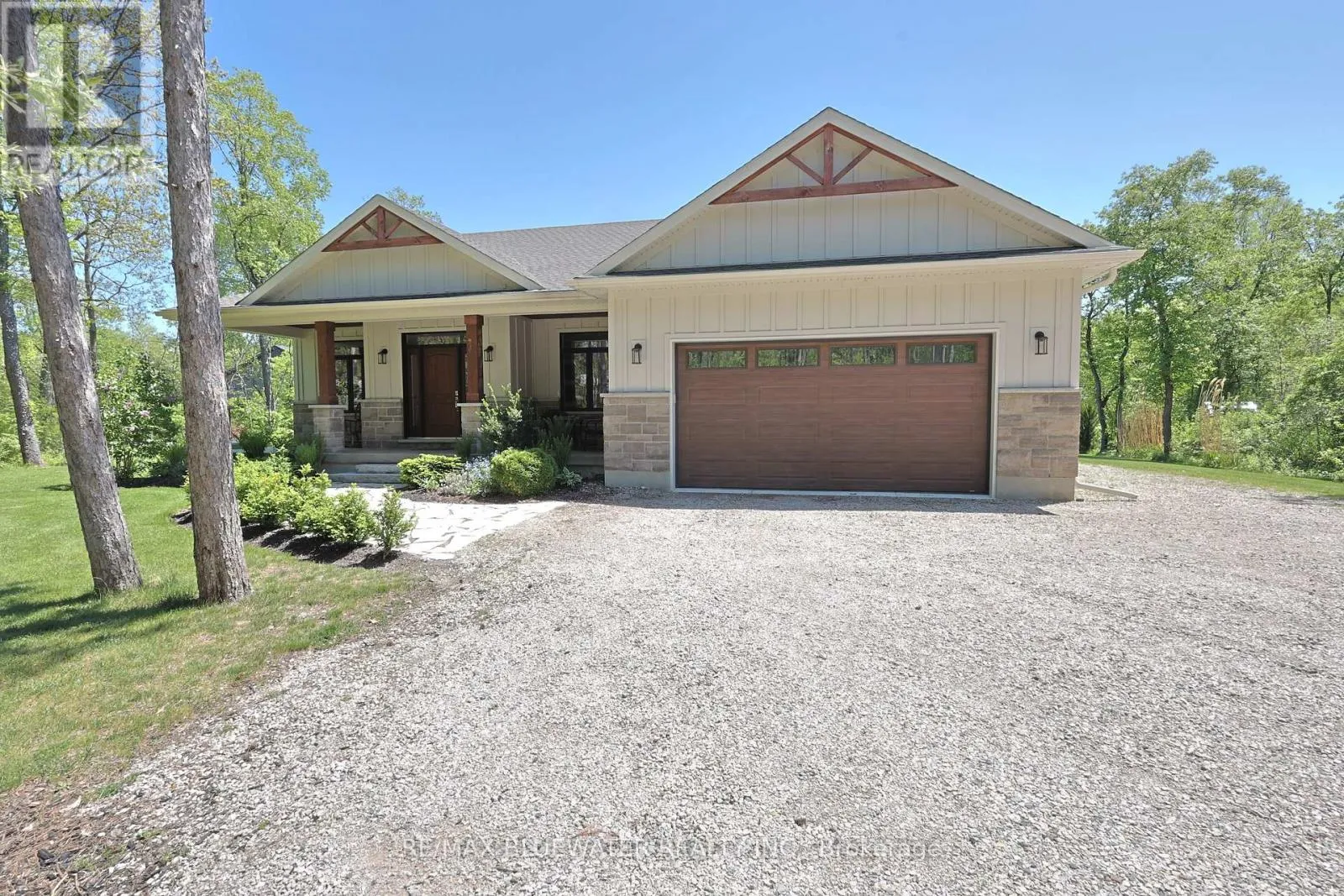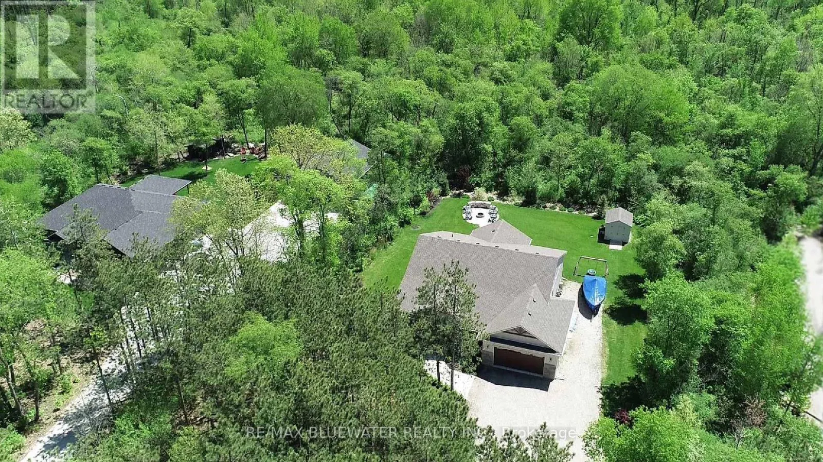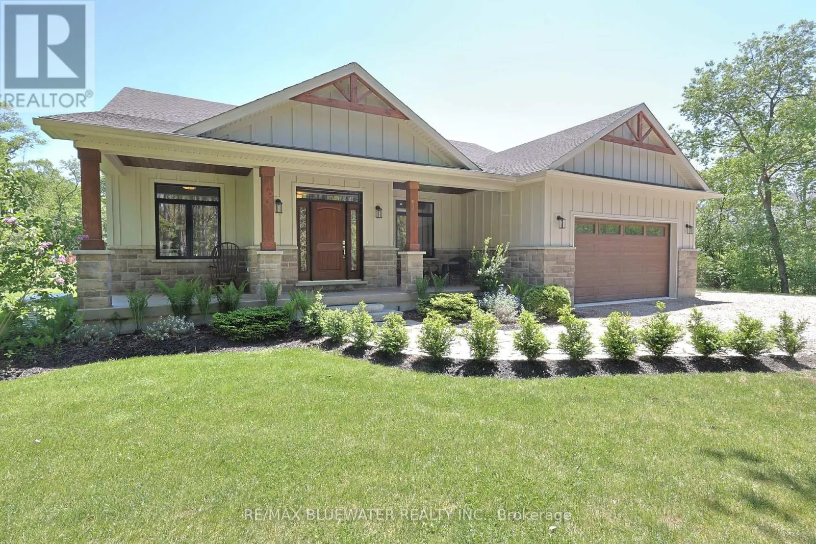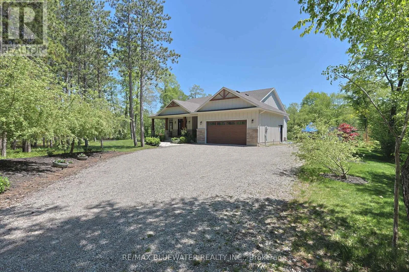 Cross Streets: Goosemarsh and Walker. ** Directions: On Goosemarsh Line between Graham St and Walker Road. Custom built modern bungalow on a one acre lot surrounded by nature near the Pinery Provincial Park. Drive through the tree lined driveway and your greeted with your new home built in 2021 by Nicholson Builders. Great curb appeal with the landscaped gardens and flagstone walkway leading to the covered front entrance and front porch seating area. Inside, you have a 1742 sqft open concept design with well appointed finishes and flowing with natural light featuring engineered hardwood floors throughout the main floor. Step inside the front foyer and you feel the warmth of the space that invites you in and makes you feel at home. As you enter the living room you will notice the coffered ceilings above and a stone feature wall around the gas fireplace. The kitchen features quartz countertops on two tone cabinetry, large island with waterfall countertop edges, herringbone patterned tile backsplash and stainless steel appliances. Spacious eating area off the kitchen and living room with large windows overlooking the back yard and access to the covered deck. Main floor primary bedroom suite with walk in closet and beautiful ensuite that includes a double vanity and tile shower. The main floor also includes his and her separate offices that border the front foyer overlooking the front entrance or easily include a guest room on the main floor as both offices have full closets. There's an additional full bathroom off the main living space and a mudroom with laundry as you enter from the 22'x24' double car garage. Full finished basement with large family room that features and electric fireplace, 3 bedrooms for kids and guests or crafts, full bathroom, workshop for the handy person and lots of storage in the utility room. Entertain friends in your private back yard as you enjoy the 18' x 14' covered back deck with vaulted ceilings and pot lighting overlooking the tree lined natural setting and flagstone walkway leading to your armour stone firepit. BONUS: GENERAC Generator! (id:27476)