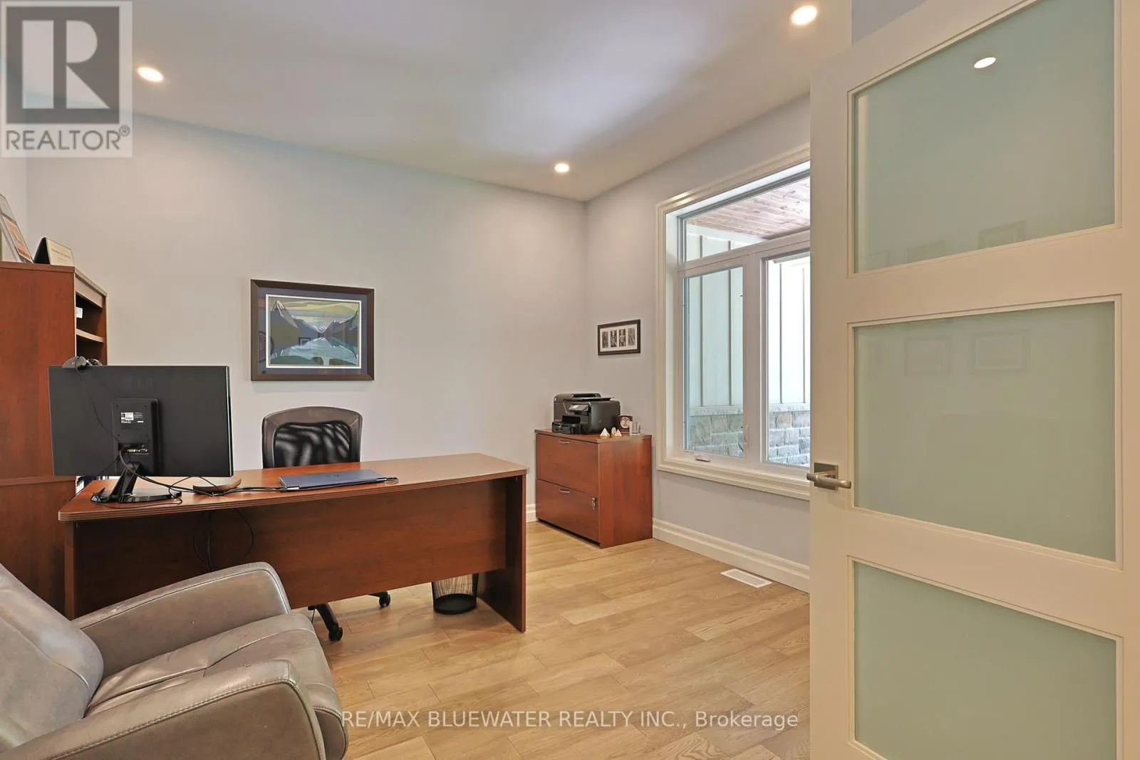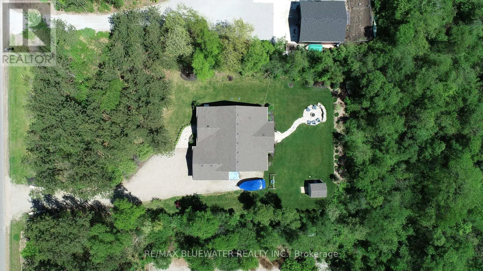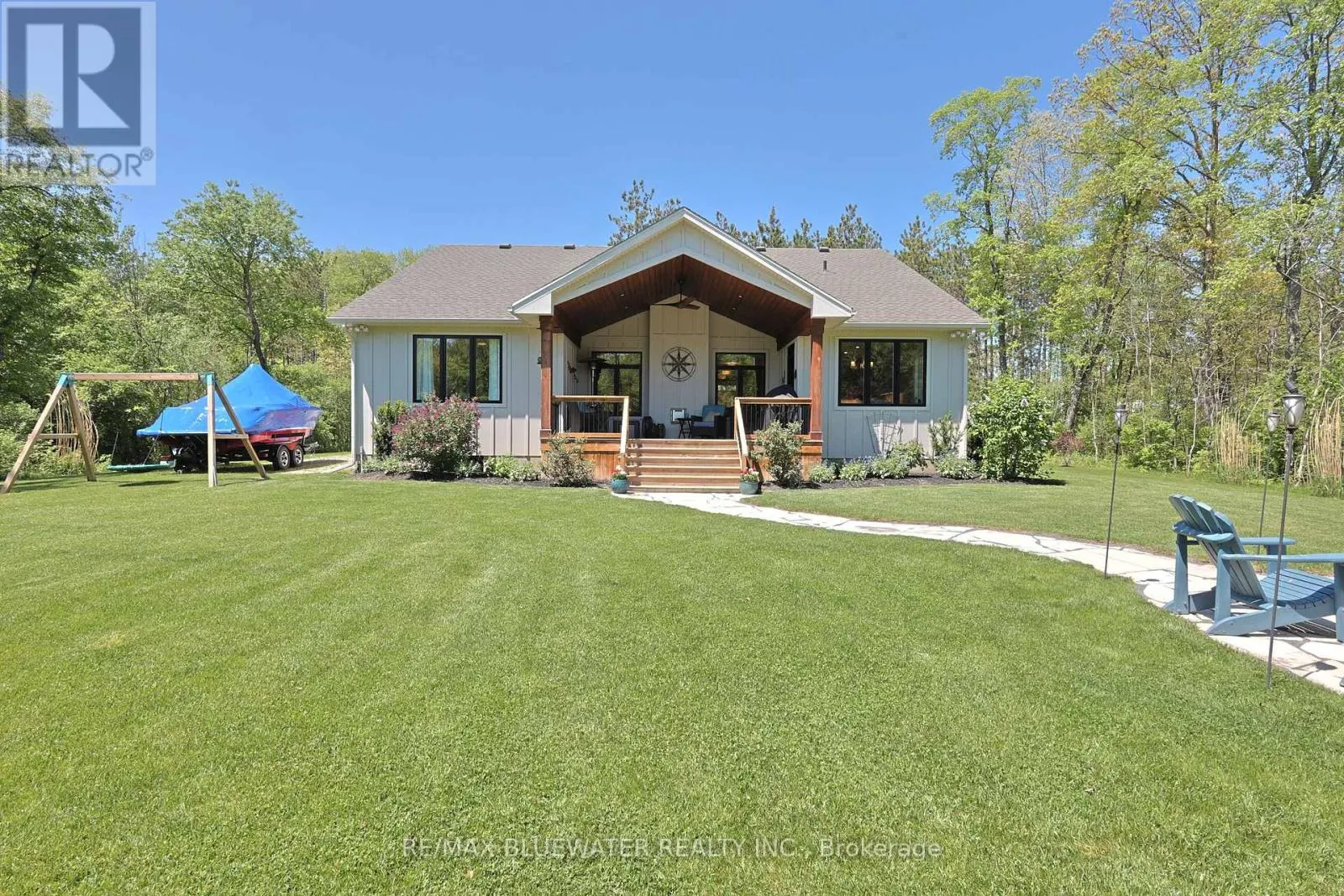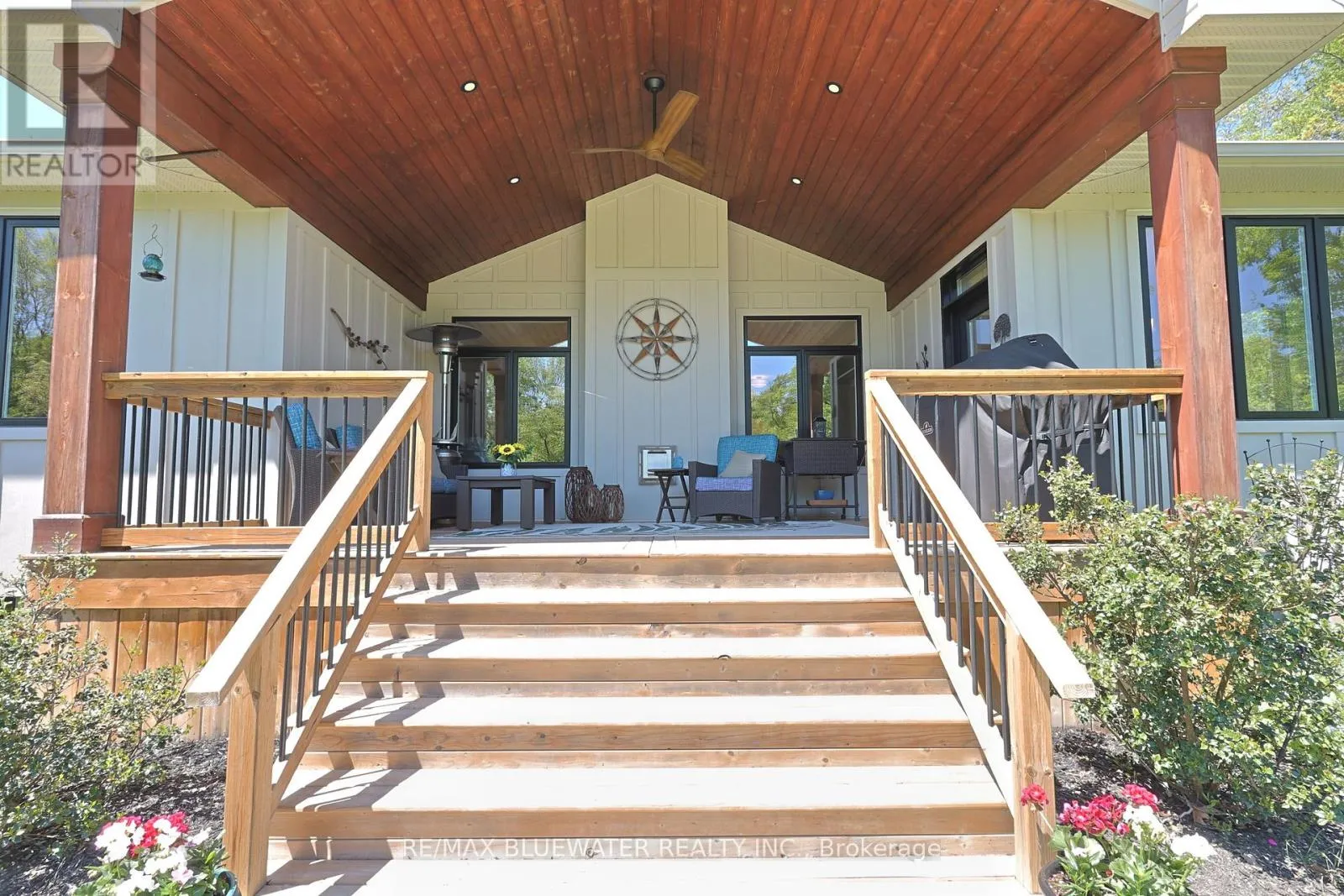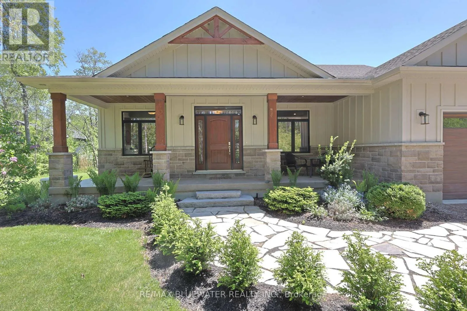 Cross Streets: Goosemarsh and Walker. ** Directions: On Goosemarsh Line between Graham St and Walker Road. Custom built modern bungalow on a one acre lot surrounded by nature near the Pinery Provincial Park. Drive through the tree lined driveway and your greeted with your new home built in 2021 by Nicholson Builders. Great curb appeal with the landscaped gardens and flagstone walkway leading to the covered front entrance and front porch seating area. Inside, you have a 1742 sqft open concept design with well appointed finishes and flowing with natural light featuring engineered hardwood floors throughout the main floor. Step inside the front foyer and you feel the warmth of the space that invites you in and makes you feel at home. As you enter the living room you will notice the coffered ceilings above and a stone feature wall around the gas fireplace. The kitchen features quartz countertops on two tone cabinetry, large island with waterfall countertop edges, herringbone patterned tile backsplash and stainless steel appliances. Spacious eating area off the kitchen and living room with large windows overlooking the back yard and access to the covered deck. Main floor primary bedroom suite with walk in closet and beautiful ensuite that includes a double vanity and tile shower. The main floor also includes his and her separate offices that border the front foyer overlooking the front entrance or easily include a guest room on the main floor as both offices have full closets. There's an additional full bathroom off the main living space and a mudroom with laundry as you enter from the 22'x24' double car garage. Full finished basement with large family room that features and electric fireplace, 3 bedrooms for kids and guests or crafts, full bathroom, workshop for the handy person and lots of storage in the utility room. Entertain friends in your private back yard as you enjoy the 18' x 14' covered back deck with vaulted ceilings and pot lighting overlooking the tree lined natural setting and flagstone walkway leading to your armour stone firepit. BONUS: GENERAC Generator! (id:27476)