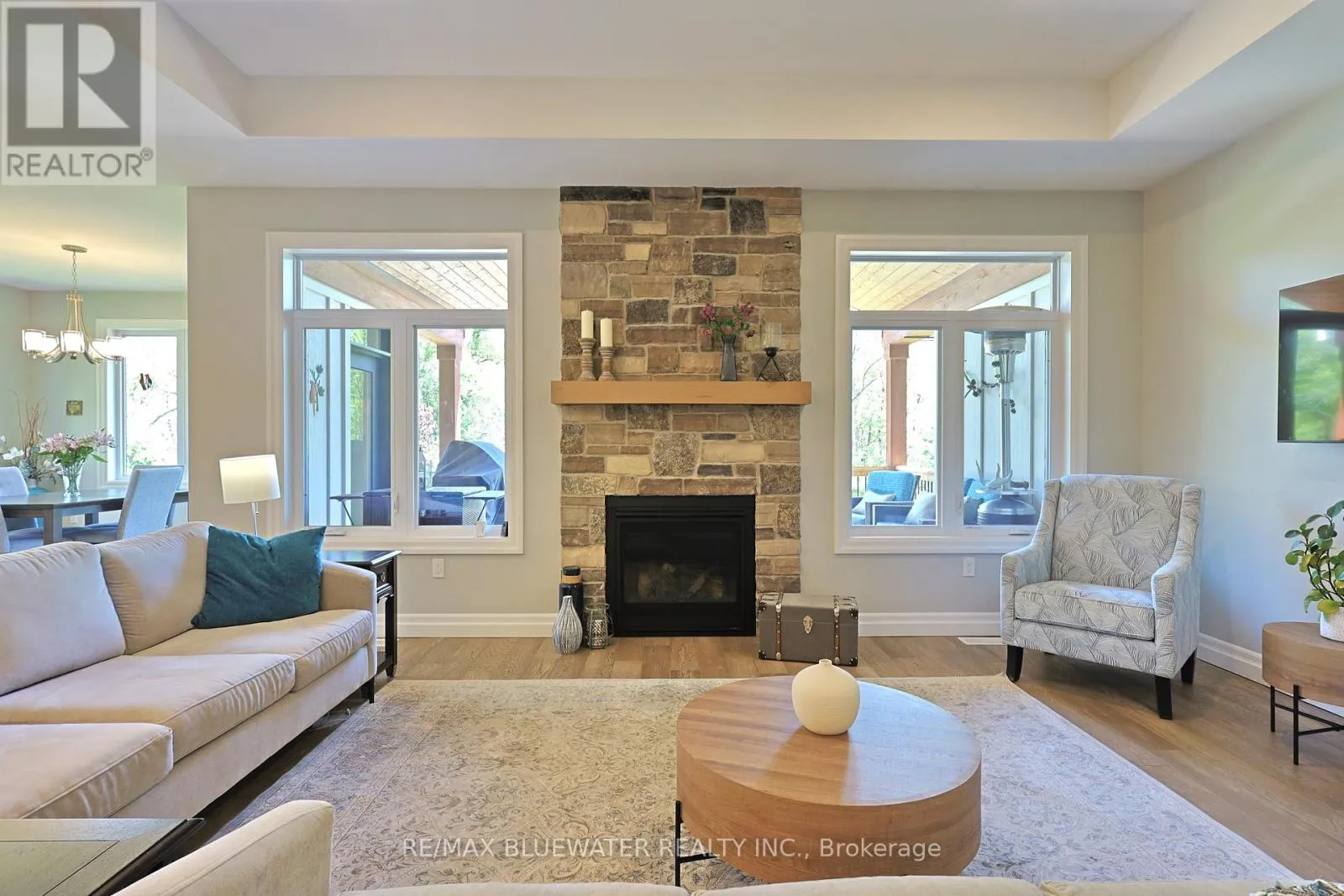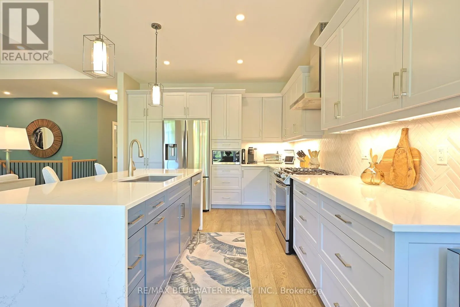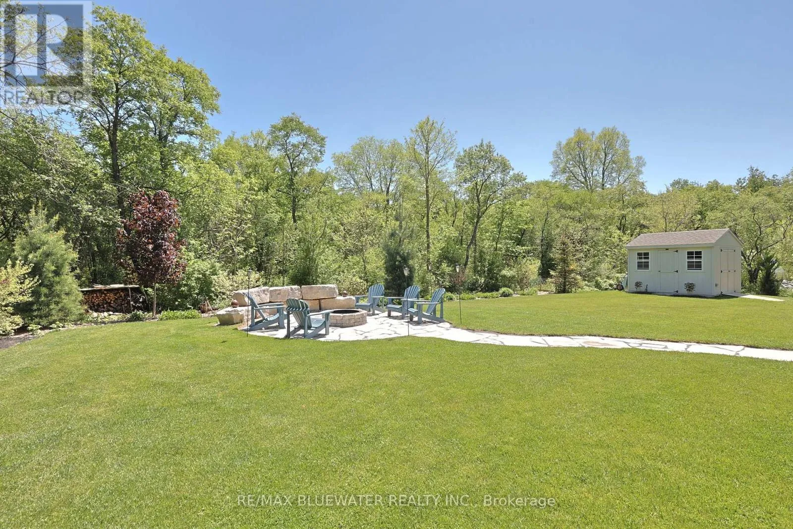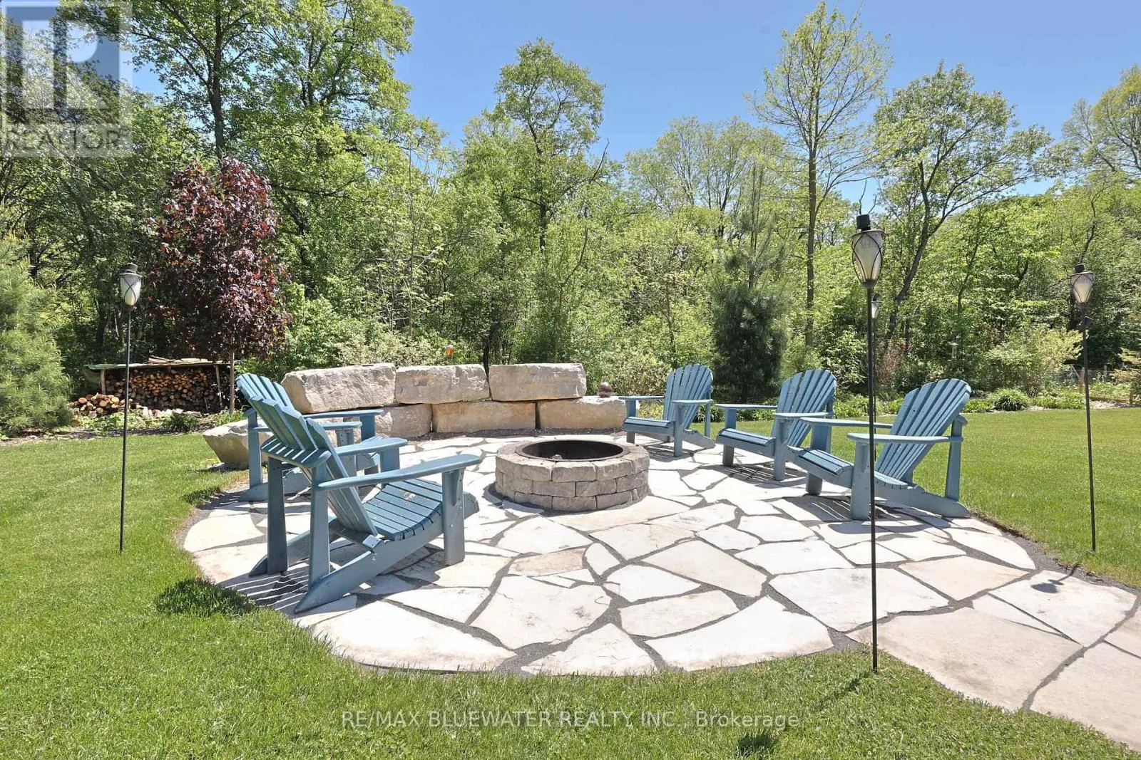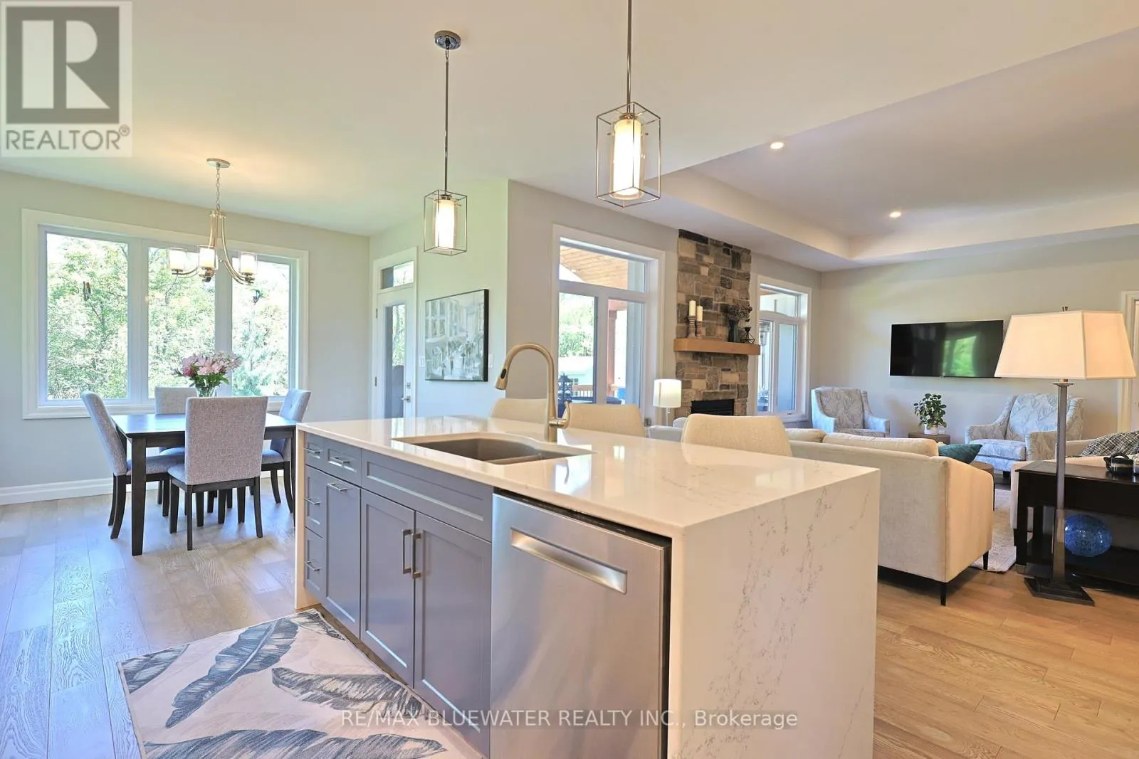 Cross Streets: Goosemarsh and Walker. ** Directions: On Goosemarsh Line between Graham St and Walker Road. Custom built modern bungalow on a one acre lot surrounded by nature near the Pinery Provincial Park. Drive through the tree lined driveway and your greeted with your new home built in 2021 by Nicholson Builders. Great curb appeal with the landscaped gardens and flagstone walkway leading to the covered front entrance and front porch seating area. Inside, you have a 1742 sqft open concept design with well appointed finishes and flowing with natural light featuring engineered hardwood floors throughout the main floor. Step inside the front foyer and you feel the warmth of the space that invites you in and makes you feel at home. As you enter the living room you will notice the coffered ceilings above and a stone feature wall around the gas fireplace. The kitchen features quartz countertops on two tone cabinetry, large island with waterfall countertop edges, herringbone patterned tile backsplash and stainless steel appliances. Spacious eating area off the kitchen and living room with large windows overlooking the back yard and access to the covered deck. Main floor primary bedroom suite with walk in closet and beautiful ensuite that includes a double vanity and tile shower. The main floor also includes his and her separate offices that border the front foyer overlooking the front entrance or easily include a guest room on the main floor as both offices have full closets. There's an additional full bathroom off the main living space and a mudroom with laundry as you enter from the 22'x24' double car garage. Full finished basement with large family room that features and electric fireplace, 3 bedrooms for kids and guests or crafts, full bathroom, workshop for the handy person and lots of storage in the utility room. Entertain friends in your private back yard as you enjoy the 18' x 14' covered back deck with vaulted ceilings and pot lighting overlooking the tree lined natural setting and flagstone walkway leading to your armour stone firepit. BONUS: GENERAC Generator! (id:27476)