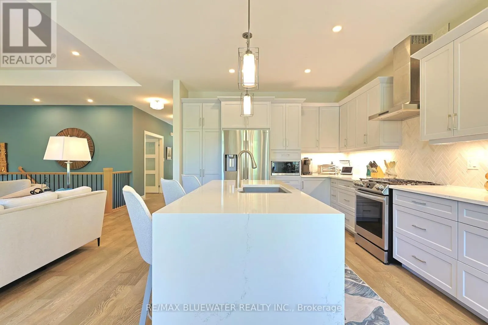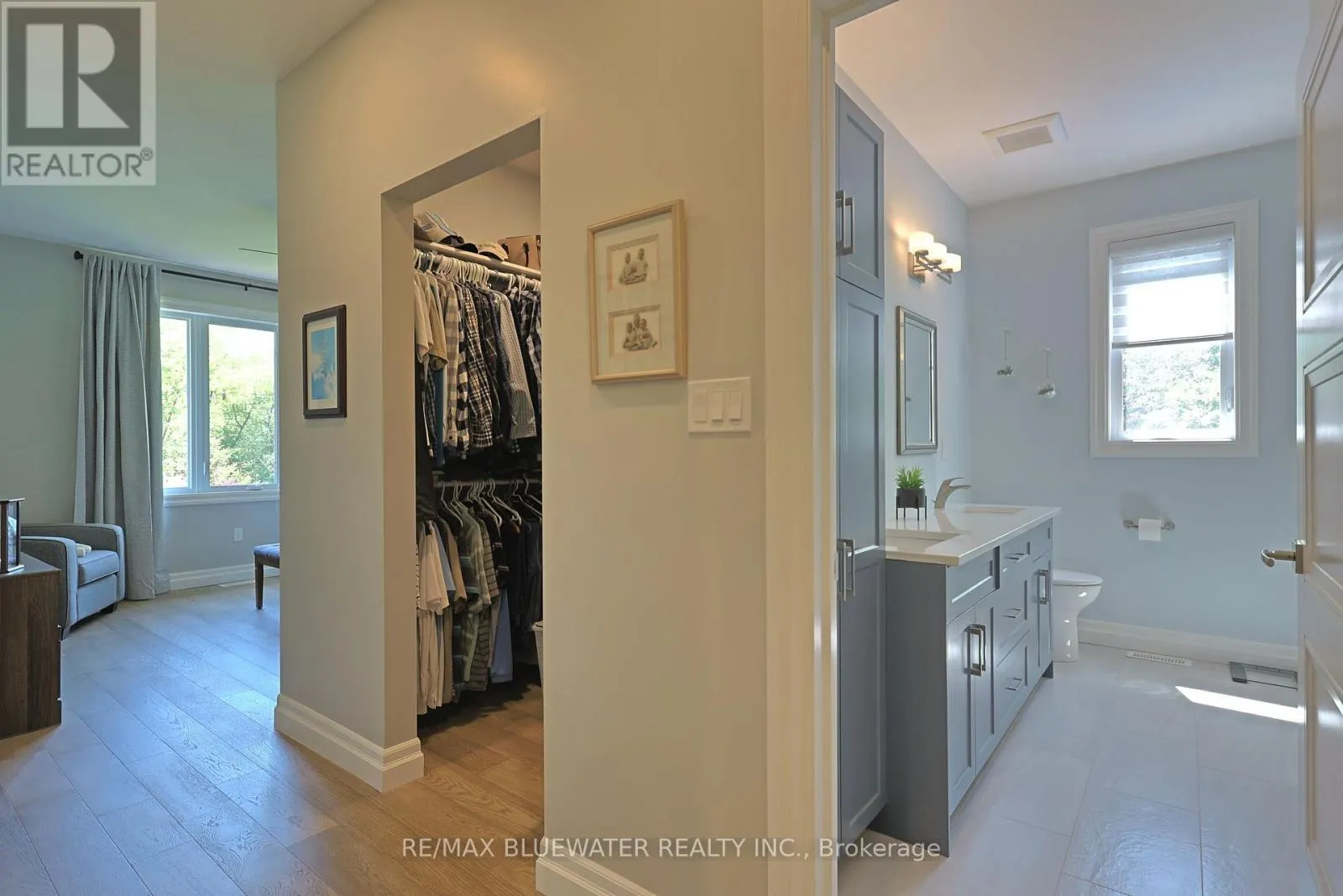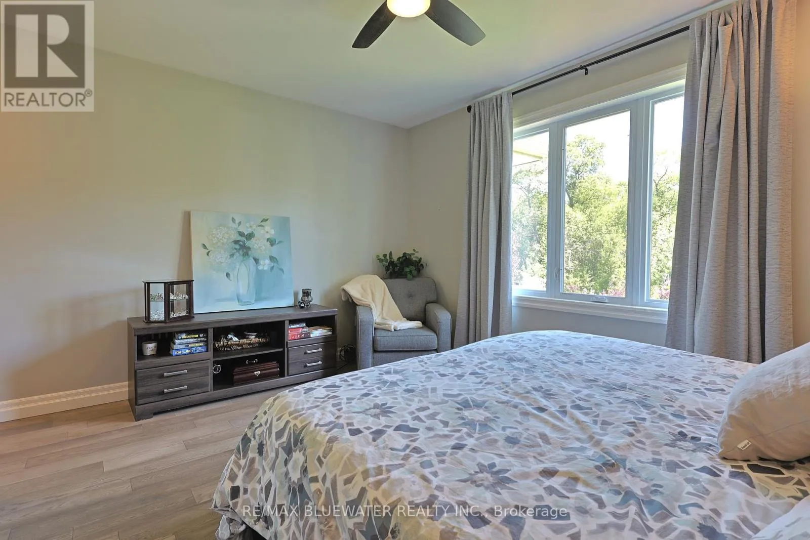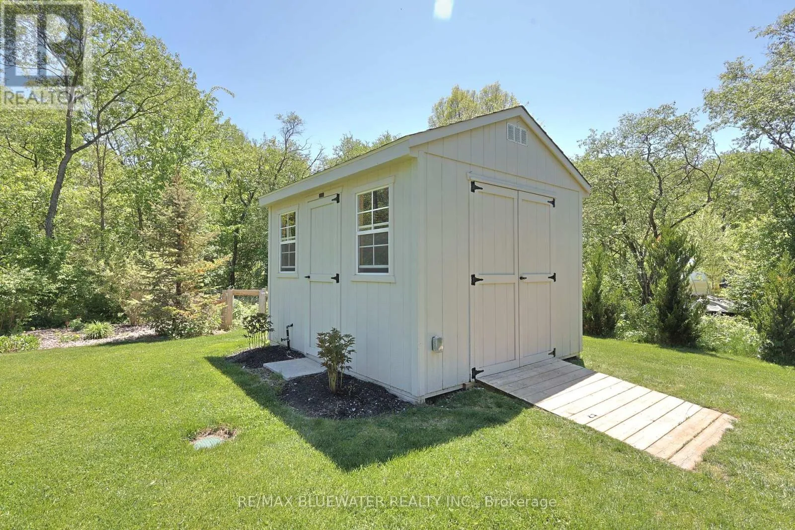Cross Streets: Goosemarsh and Walker. ** Directions: On Goosemarsh Line between Graham St and Walker Road. Custom built modern bungalow on a one acre lot surrounded by nature near the Pinery Provincial Park. Drive through the tree lined driveway and your greeted with your new home built in 2021 by Nicholson Builders. Great curb appeal with the landscaped gardens and flagstone walkway leading to the covered front entrance and front porch seating area. Inside, you have a 1742 sqft open concept design with well appointed finishes and flowing with natural light featuring engineered hardwood floors throughout the main floor. Step inside the front foyer and you feel the warmth of the space that invites you in and makes you feel at home. As you enter the living room you will notice the coffered ceilings above and a stone feature wall around the gas fireplace. The kitchen features quartz countertops on two tone cabinetry, large island with waterfall countertop edges, herringbone patterned tile backsplash and stainless steel appliances. Spacious eating area off the kitchen and living room with large windows overlooking the back yard and access to the covered deck. Main floor primary bedroom suite with walk in closet and beautiful ensuite that includes a double vanity and tile shower. The main floor also includes his and her separate offices that border the front foyer overlooking the front entrance or easily include a guest room on the main floor as both offices have full closets. There's an additional full bathroom off the main living space and a mudroom with laundry as you enter from the 22'x24' double car garage. Full finished basement with large family room that features and electric fireplace, 3 bedrooms for kids and guests or crafts, full bathroom, workshop for the handy person and lots of storage in the utility room. Entertain friends in your private back yard as you enjoy the 18' x 14' covered back deck with vaulted ceilings and pot lighting overlooking the tree lined natural setting and flagstone walkway leading to your armour stone firepit. BONUS: GENERAC Generator! (id:27476)